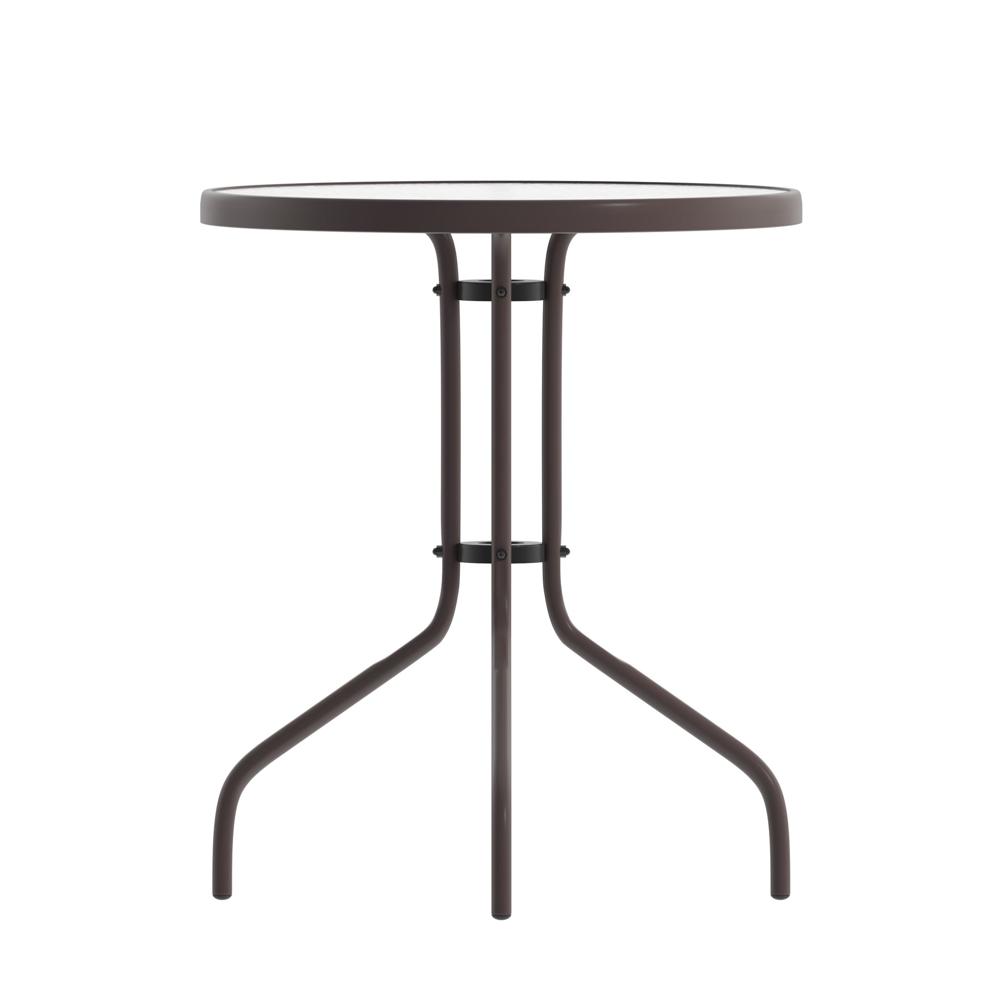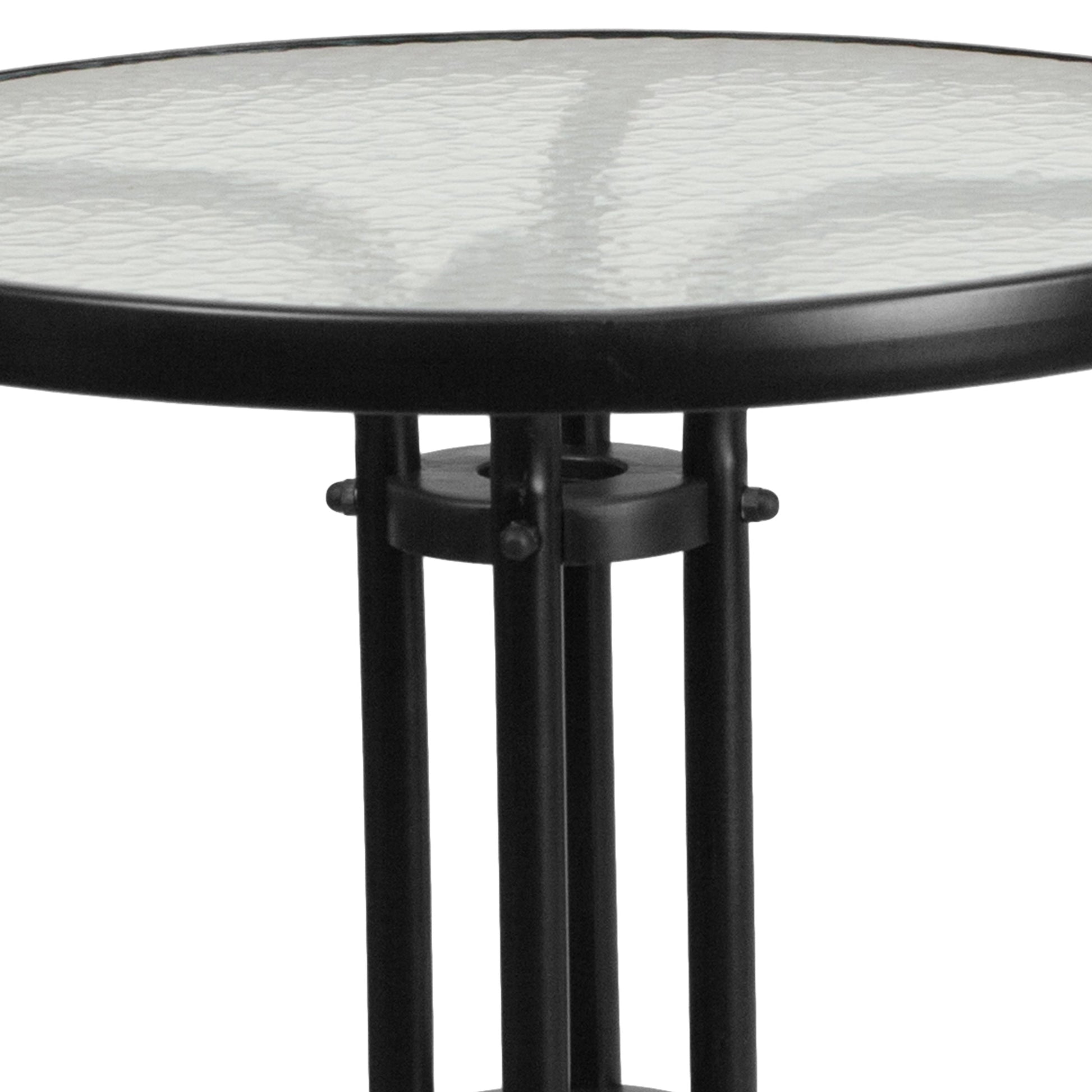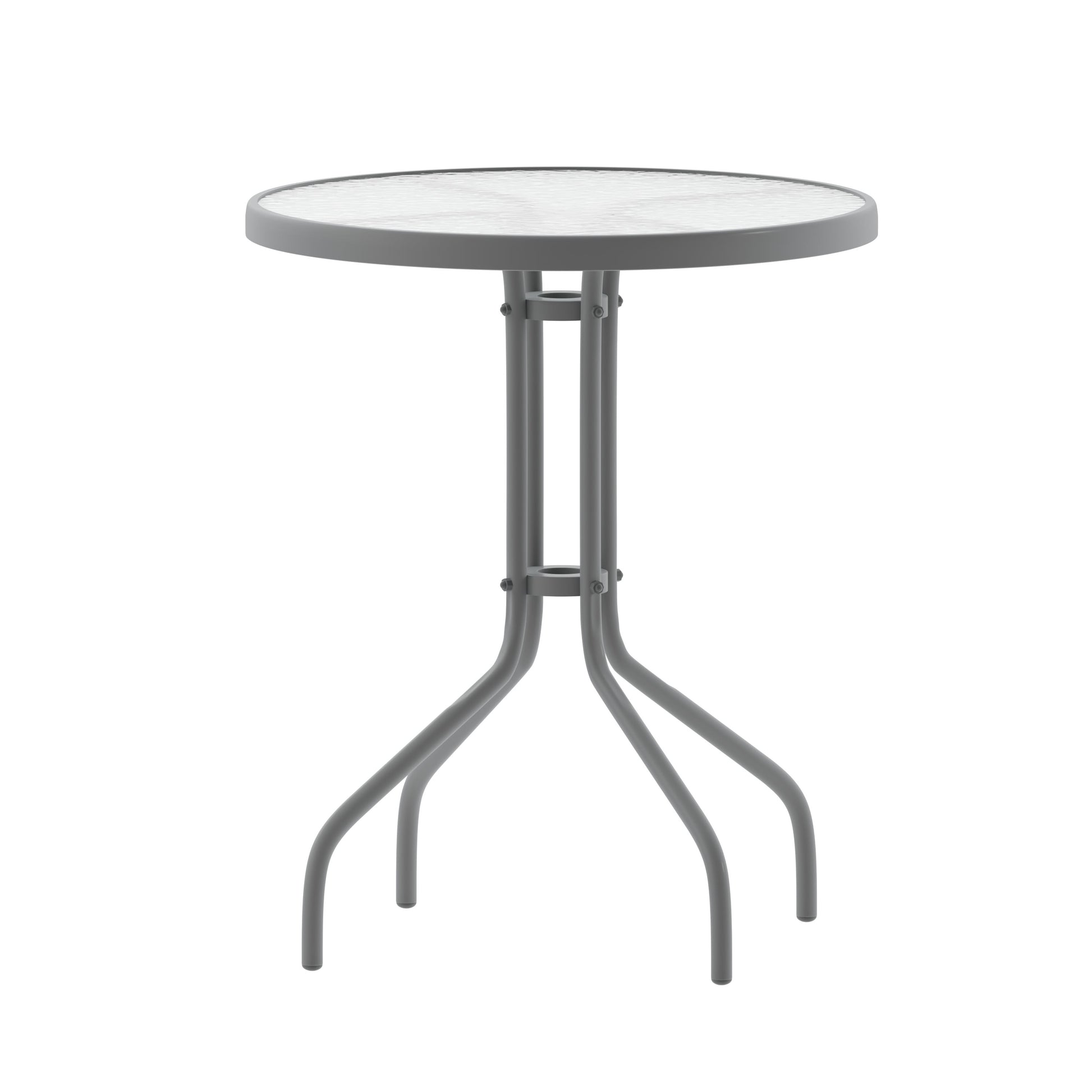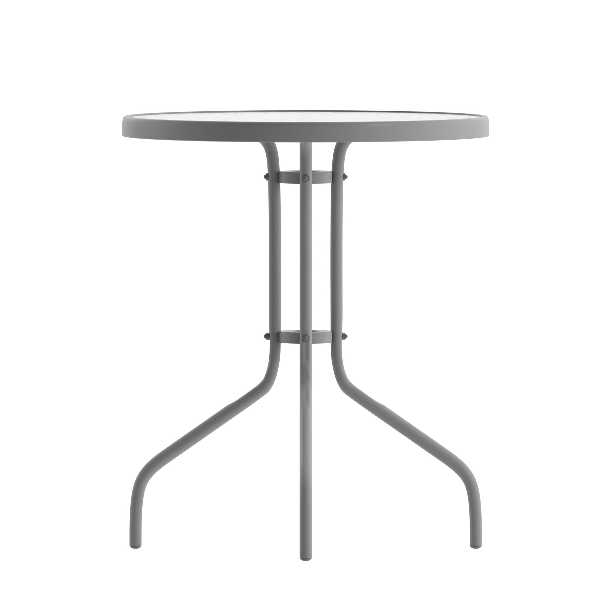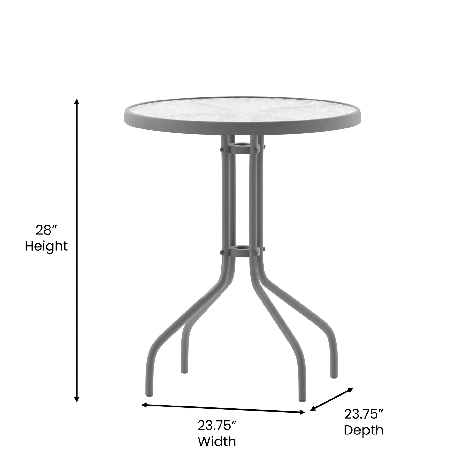 Lila 23.75'' Round Glass Metal Table with 2 Metal Aluminum Slat Stack Chairs