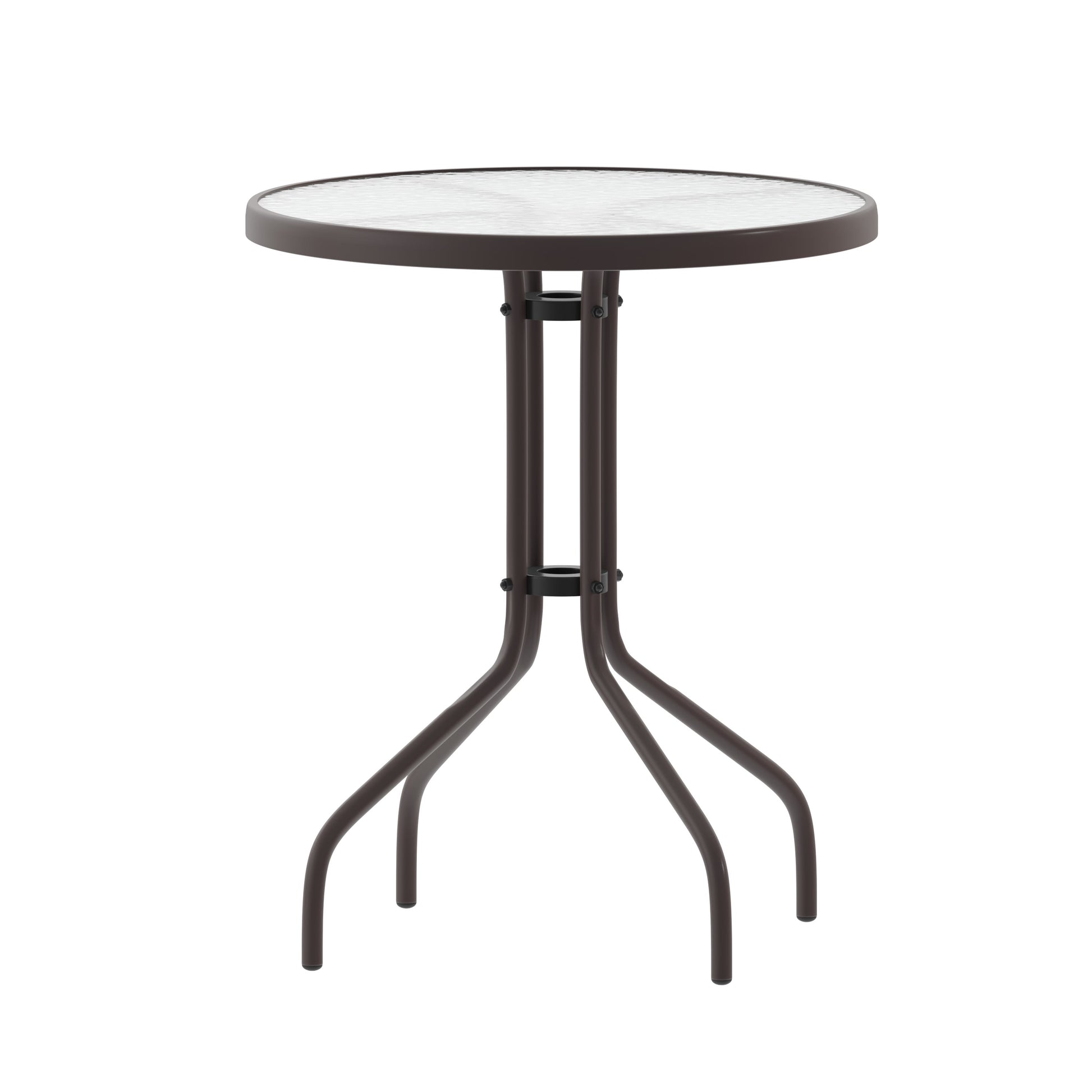 Whether you need to add more seating space or create an intimate conversation area, this versatile round tempered glass top table with 2 chairs is up to the task. Enhance the look of your bistro, cafe, restaurant, hotel or home patio space without taking up too much real estate. The ripple designed table top features a smooth surface for keeping items level. The lightweight chair features a curved slat style back to keep you comfortable. For easy storing and cleaning purposes these chairs stack up to 2 chairs high. A powder coat finish lends this set a bold, versatile appearance. Cross braces provide extra stability when sitting and these sturdy chairs hold up to 352 lb. weight capacity. Designed for all-weather use, this set is a great option for indoor and outdoor settings. For longevity, care should be taken to protect from long periods of wet weather. Whether you are just starting your business or upgrading your furniture this seating group is a wise investment.