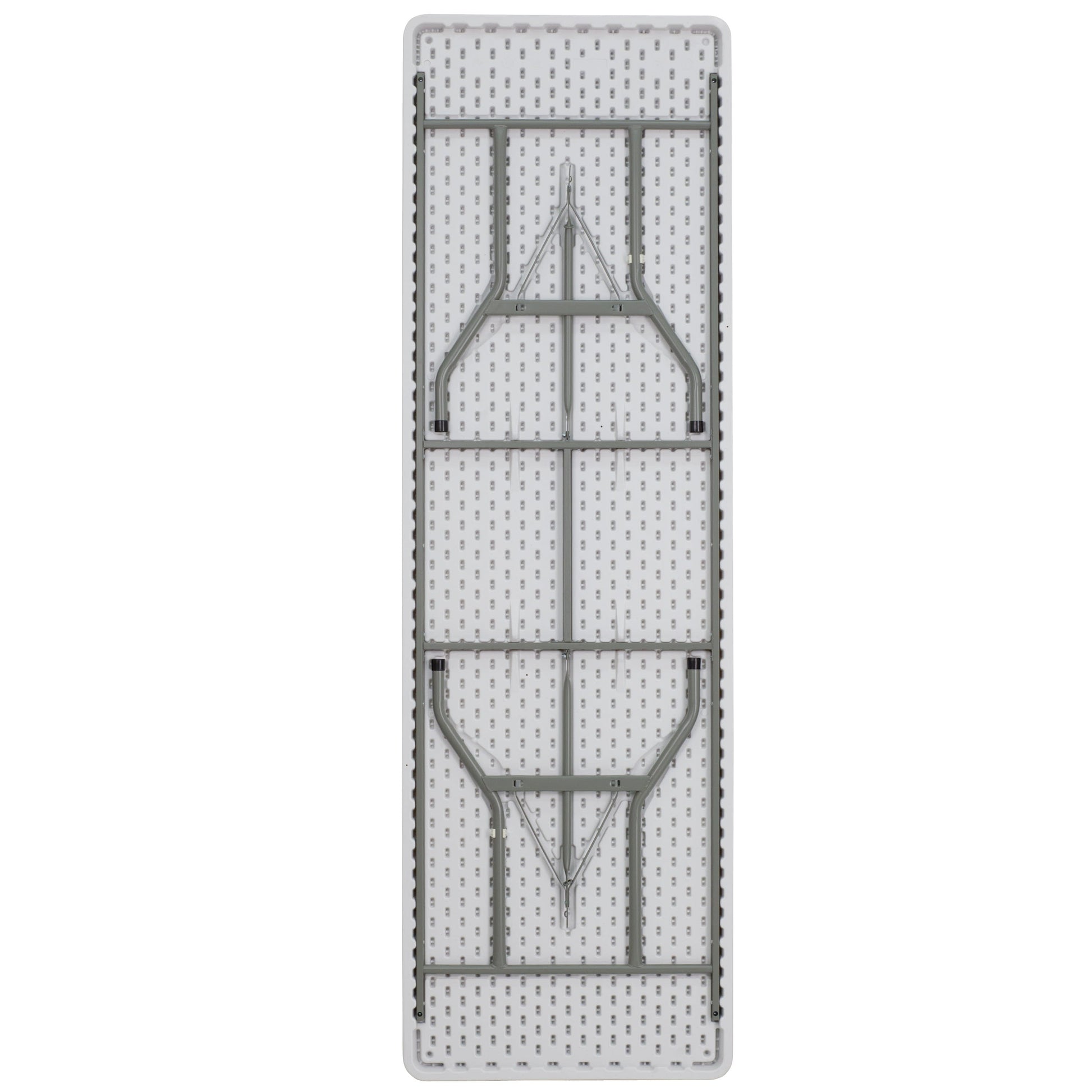 This rectangular folding table is 8 feet long and is beneficial in a multitude of settings that include banquet halls, conference centers, cafeterias, schools and in the home. The table can be used as a temporary seating solution or be setup for everyday use. The durable blow molded top is low maintenance and cleans easily. The table legs fold under the table to make storage more convenient and for better portability. This table is commercial grade to withstand everyday use in the hospitality industry.