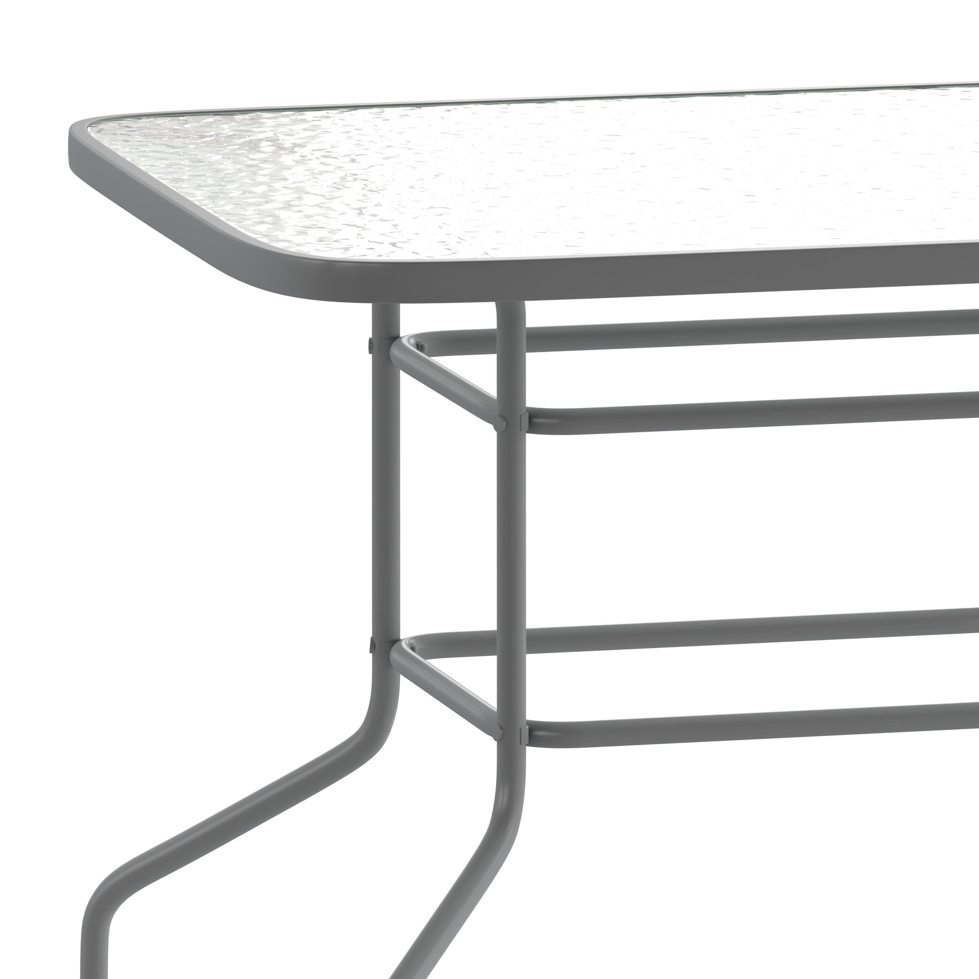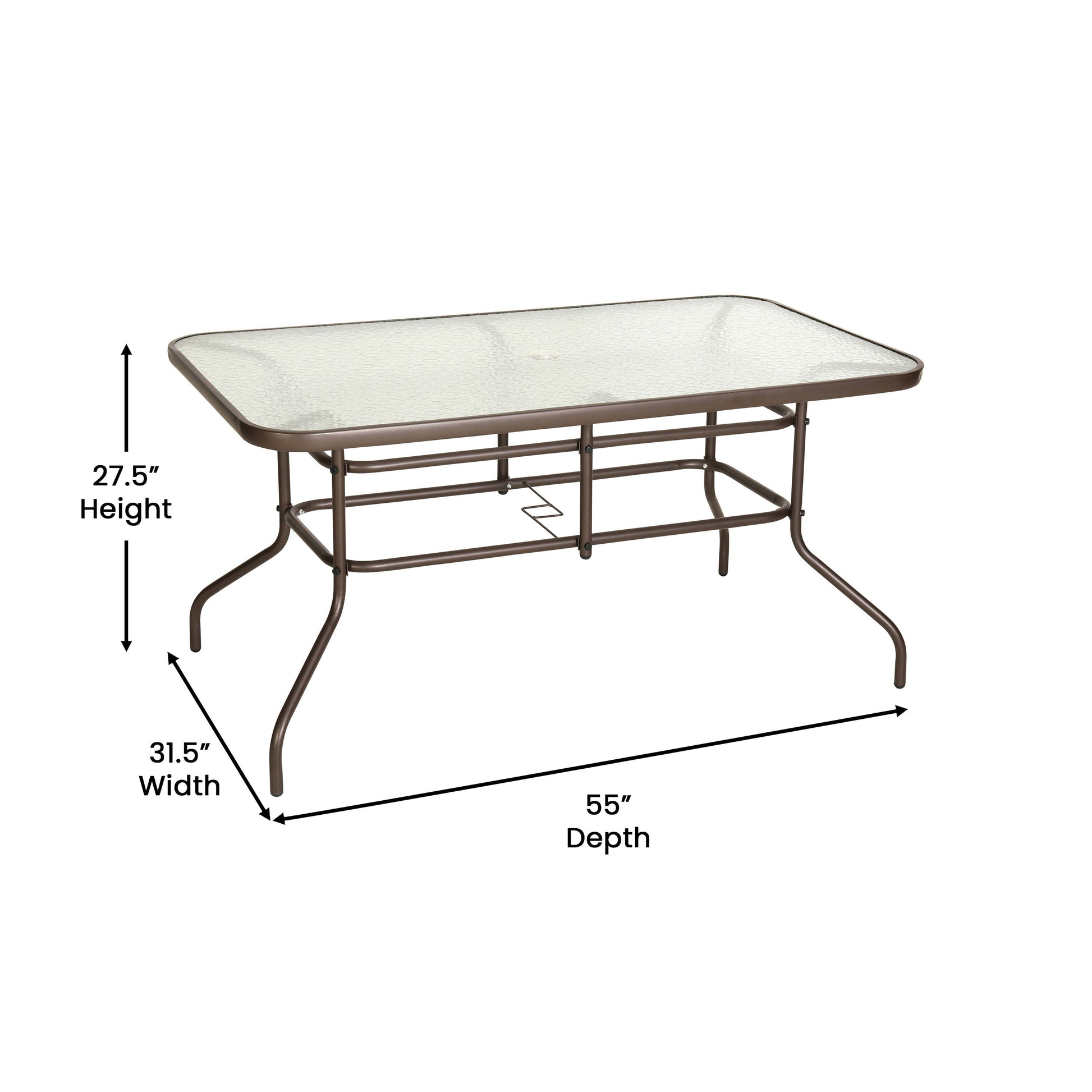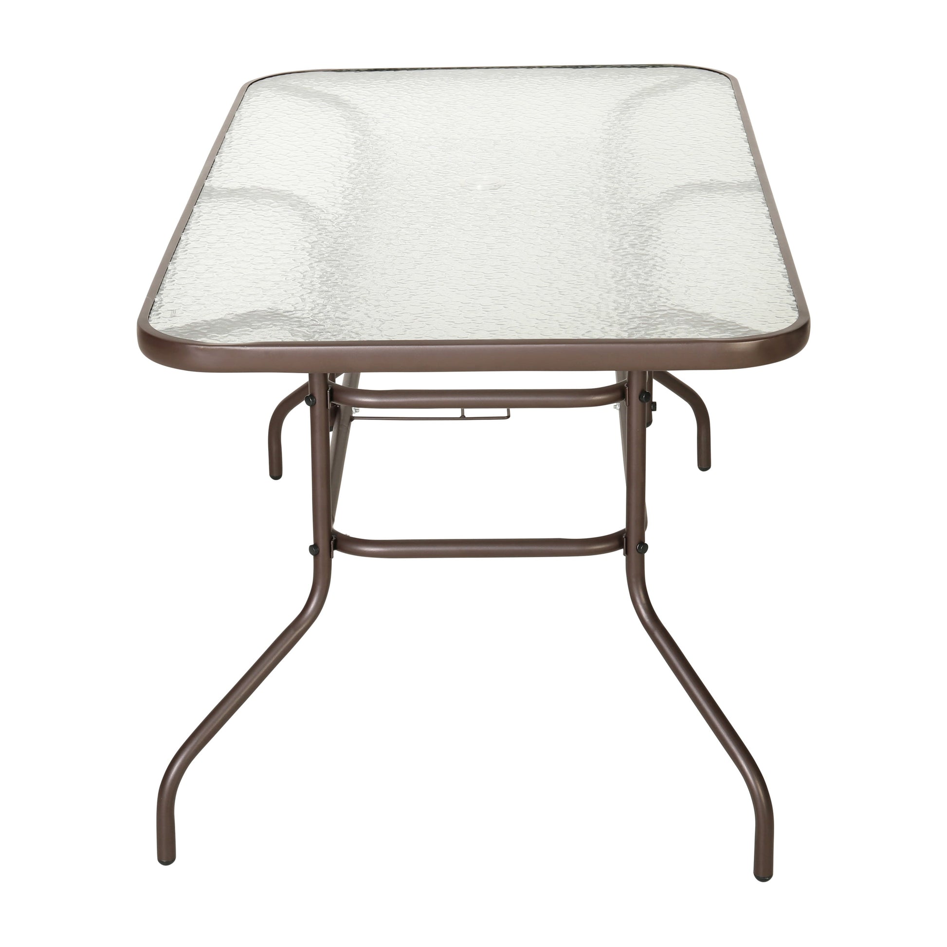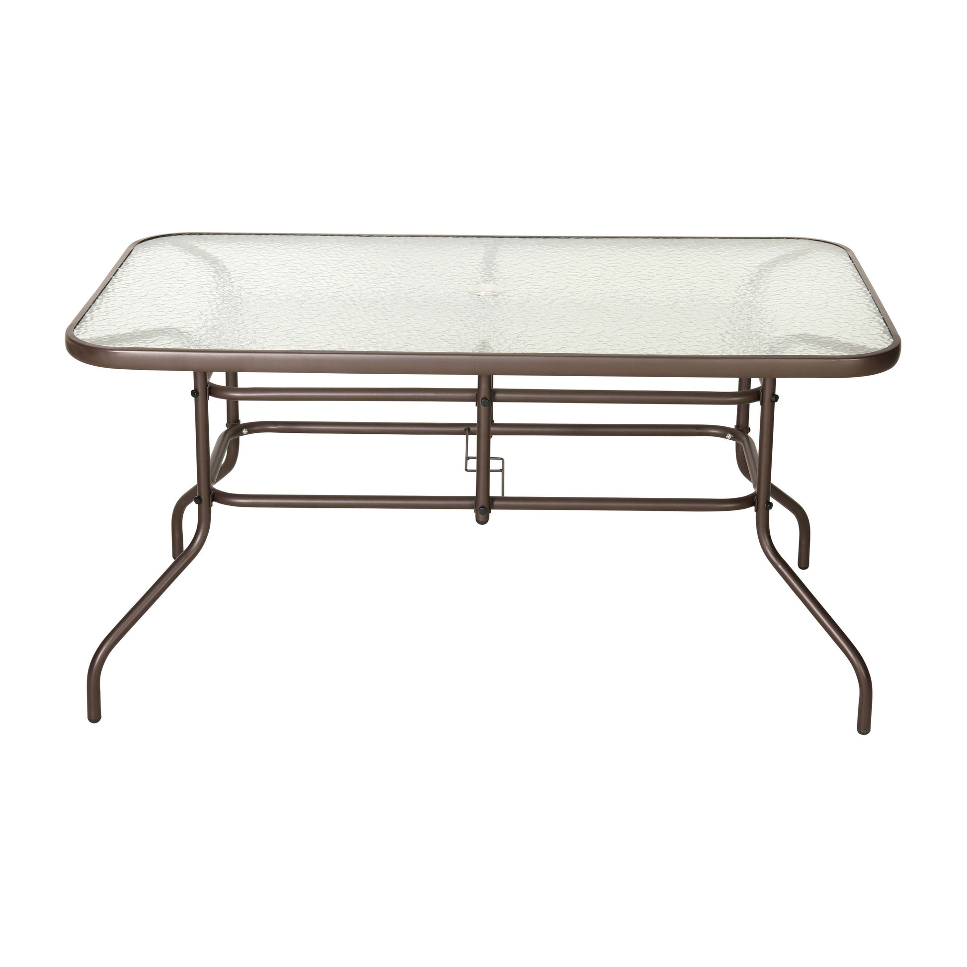 Dine alfresco in the comfort of your own home with this large rectangular glass patio table. With a seating capacity for up to six family members, everyone is welcome. The thick tempered glass top consists of an umbrella hole for a market umbrella to help shade you while eating and socializing. The rippled top is smooth to the touch to keep your beverages and dinnerware level.