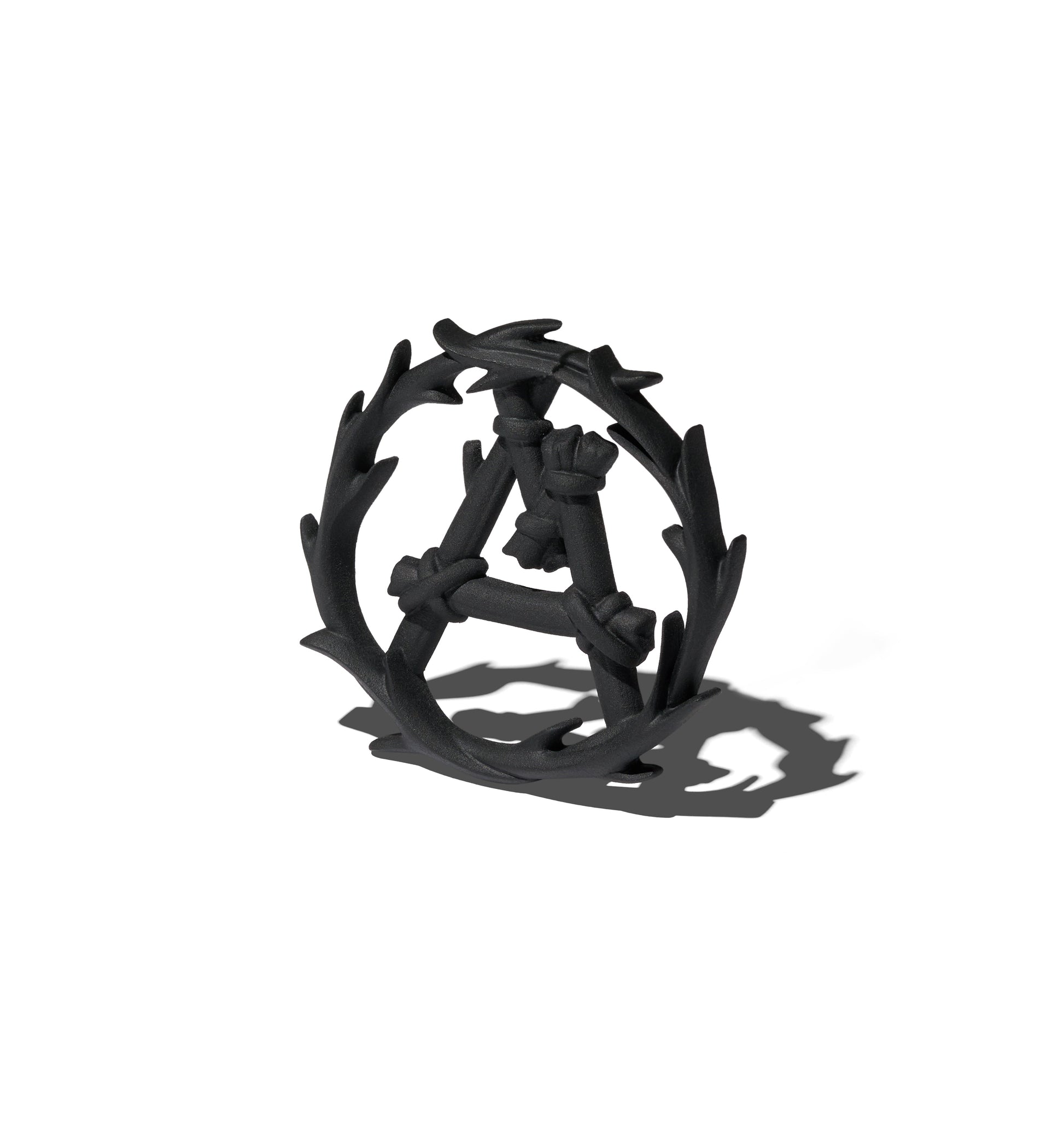 The horn wreath sculpture is made of hard rubber.