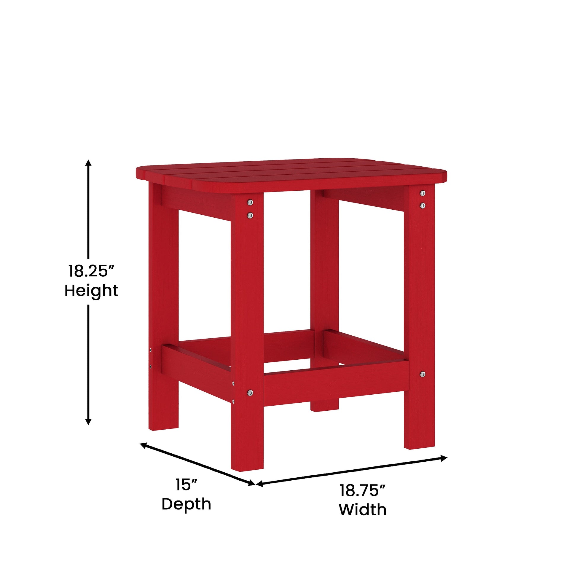 Provide total comfort for guests and patrons in your hospitality spaces and friends and family at home with this commercial grade three-piece indoor/outdoor Adirondack set, complete with two adjustable loungers with cup holders and a two-tier side table. Beautifully crafted to blend in with almost any aesthetic, this set is the perfect piece to complement your style and wow your guests at your home, patio, pool, restaurant, hotel, bistro, or lounge. Comprised of all-weather HDPE, this set mimics the look of wood, but is stronger and does not require back-breaking labor for upkeep. Its faux wood composition will not rot, chip, or peel and no painting or sanding is required. The set’s UV resistance allows you to leave it out year-round. The chairs’ elongated seats allow your whole body to relax, while the supportive backs can be adjusted to four reclining positions for custom comfort. Each seat features integrated arms that relieve tension and a slide-out cupholder on the right side to free up your hands. Each chair holds 300 lbs. static weight. The table holds 75 lbs. static weight. The table arrives preassembled while each chair can be assembled in 30 minutes or less with included tools and step-by-step instructions and clean-up is easy by wiping with a damp cloth, ideal for busy establishments and households. Available in multiple colors, feel free to mix and match or maintain a uniform color to suit your needs.