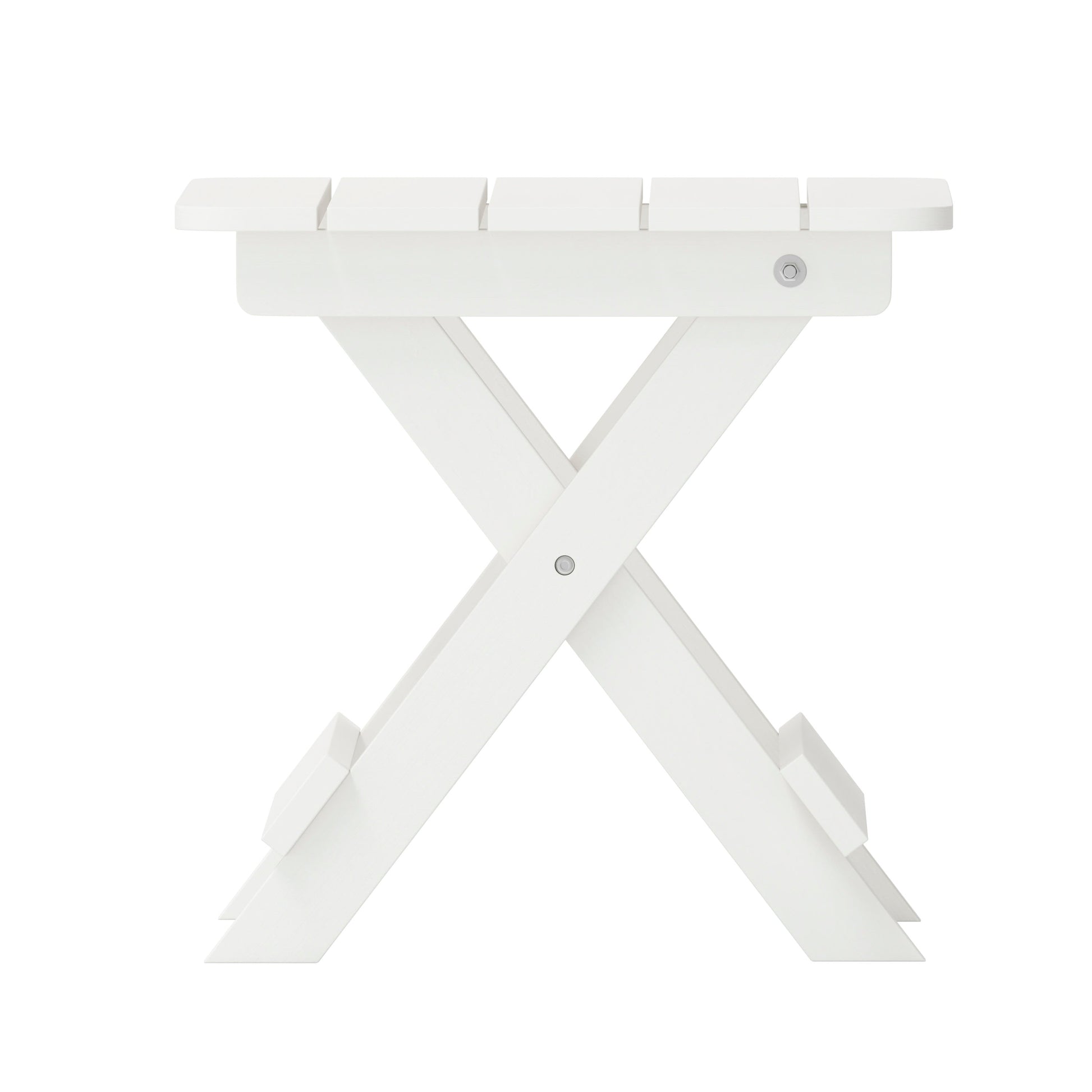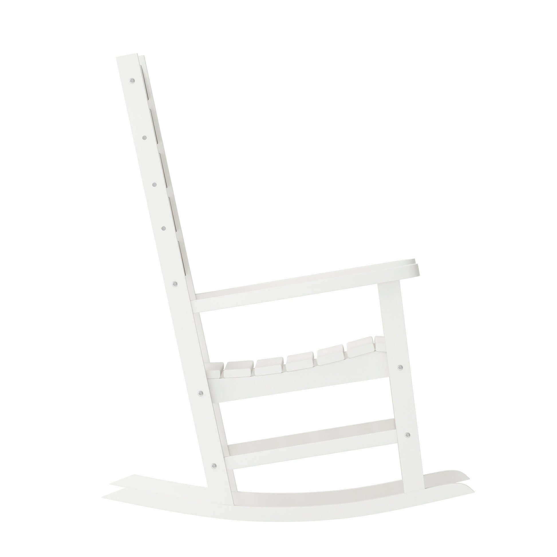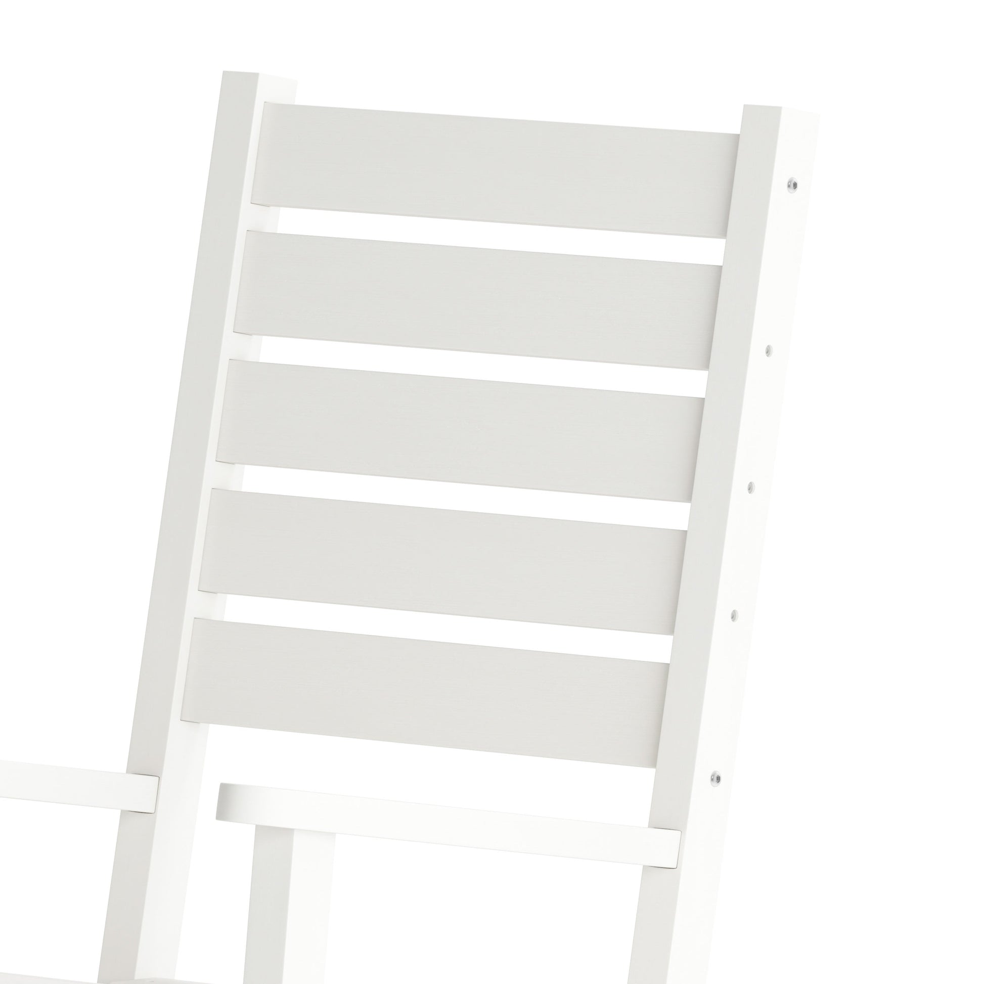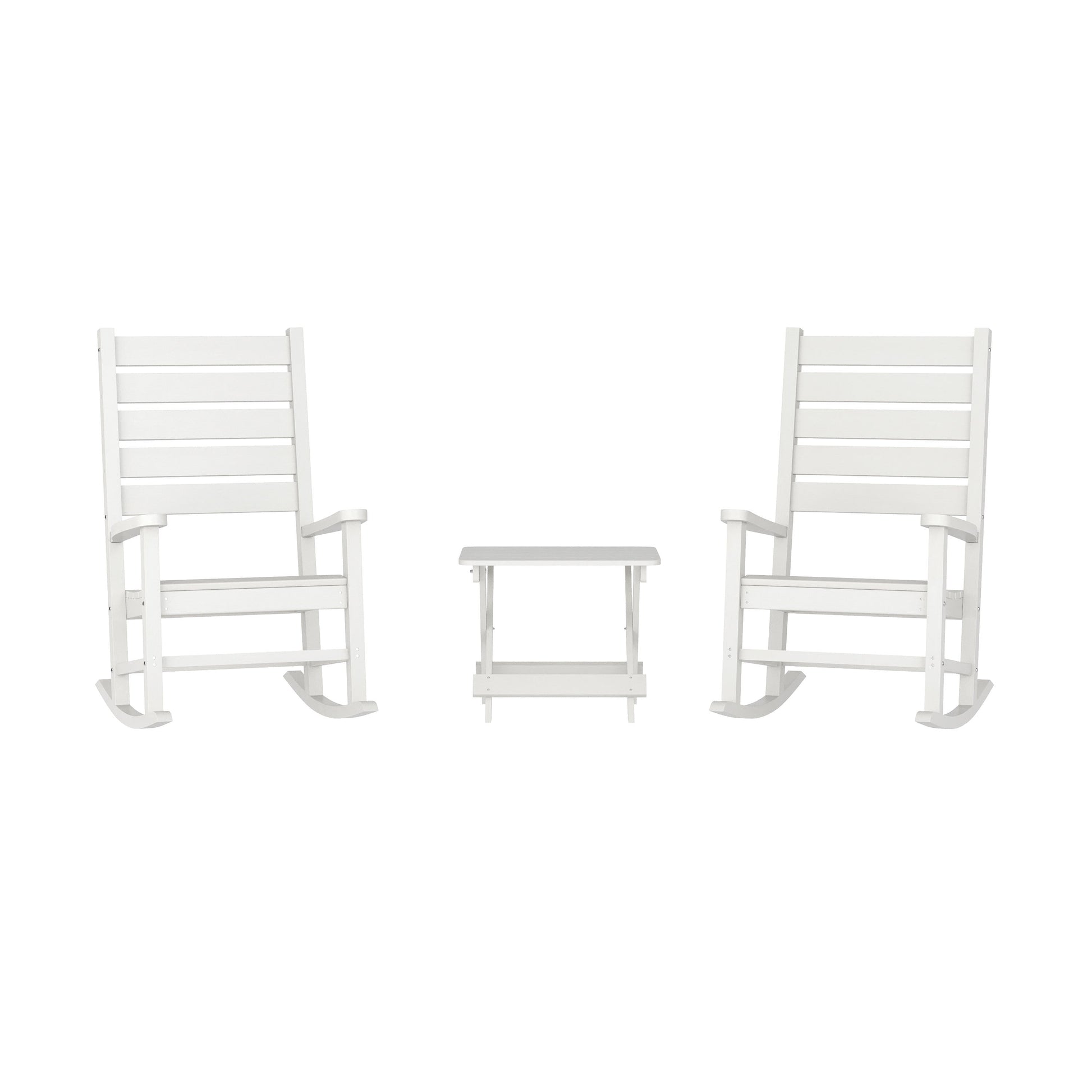 Furnish the front porch, patio or deck of your bed and breakfast, hotel, or household in classic style with this three-piece commercial grade indoor/outdoor set with two all-weather rocking chairs and a matching end table. No matter your decorating style, this set boasts an elegant, on-trend look that will mesh perfectly with your living room, sunroom, den, backyard, patio, porch, garden, or poolside deck at home or your business’ bar, restaurant, bistro, lounge, café, or hotel. Each piece is constructed from long-lasting, durable HDPE to resist warping, rotting, or chipping with no back-breaking sanding or staining necessary to keep them looking great. This set is UV, fade, and weather-resistant so you can confidently utilize it outdoors year-round. Each rocking chair features a horizontal slat, full back design to support you in all the right places while the sloping runners provide smooth rocking motion to keep you cozy and relaxed. Each chair is expertly crafted to hold up to 300 lbs. static weight for a worry-free sitting experience while the folding table can hold up to 50 lbs. static weight. Each chair assembles in 30 minutes or less with included tools and the table requires no assembly. Dirt or spills clean up easily with a damp cloth, making this set ideal for both busy establishments and hectic households. Enjoy cozy conversation in style with this gorgeous three-piece set.