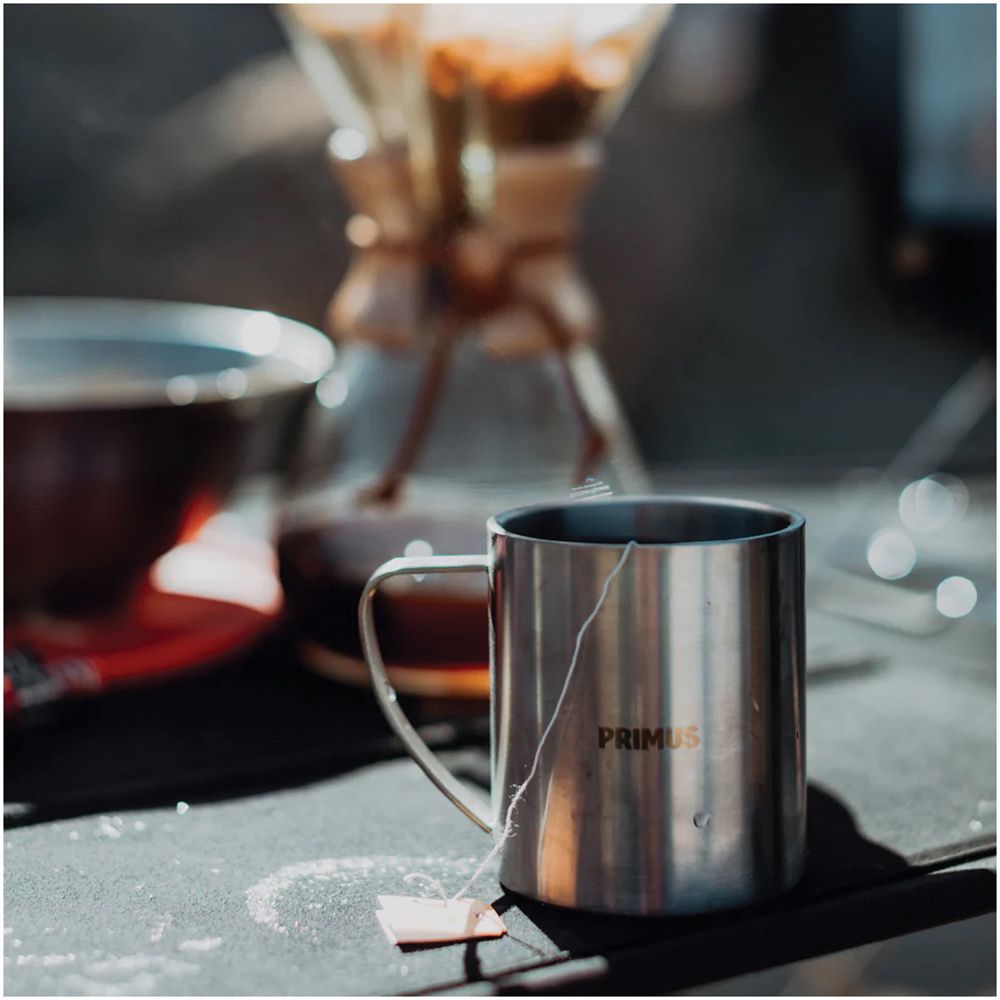 A double-walled traditional coffee mug that travels from your house to the campground.