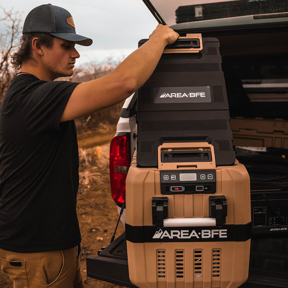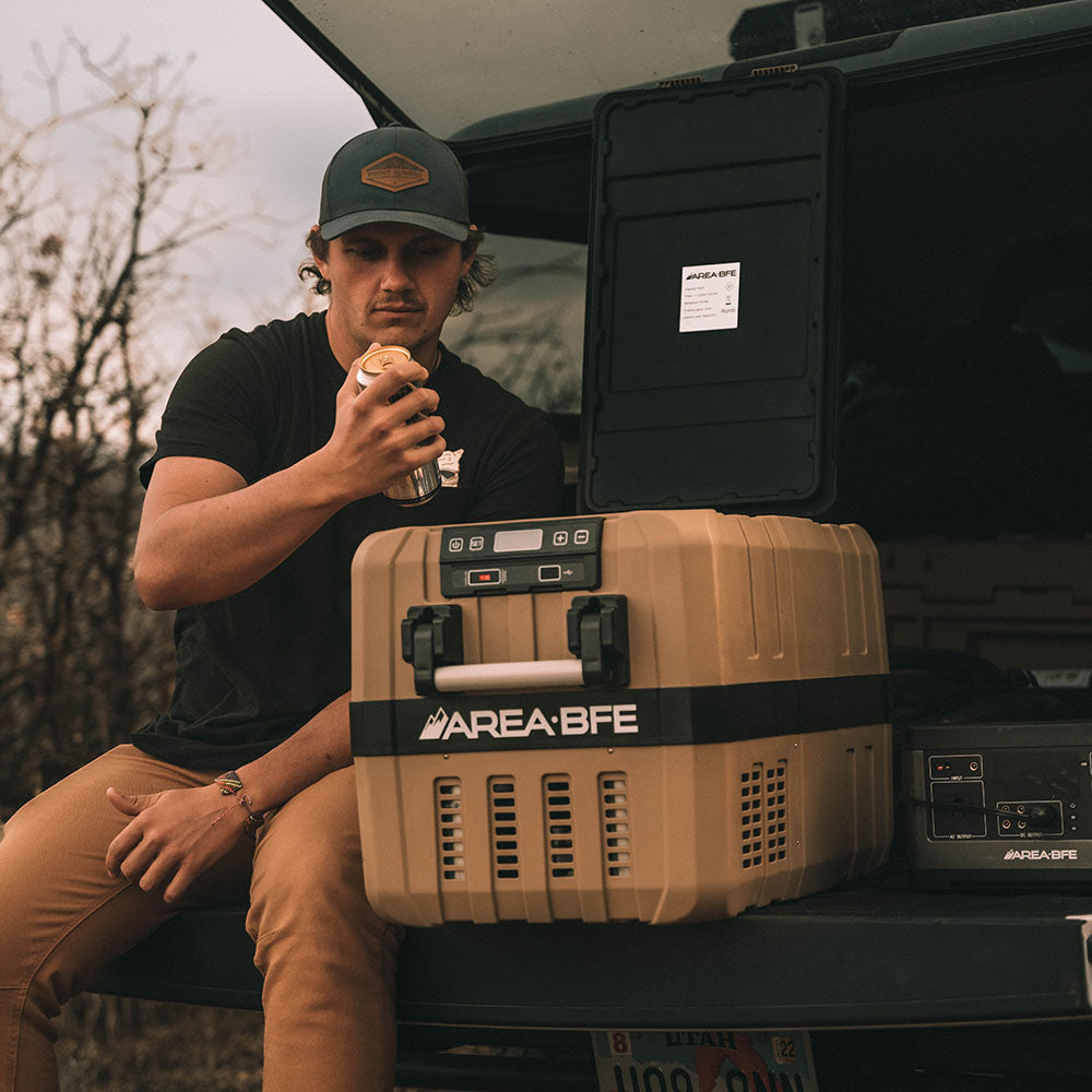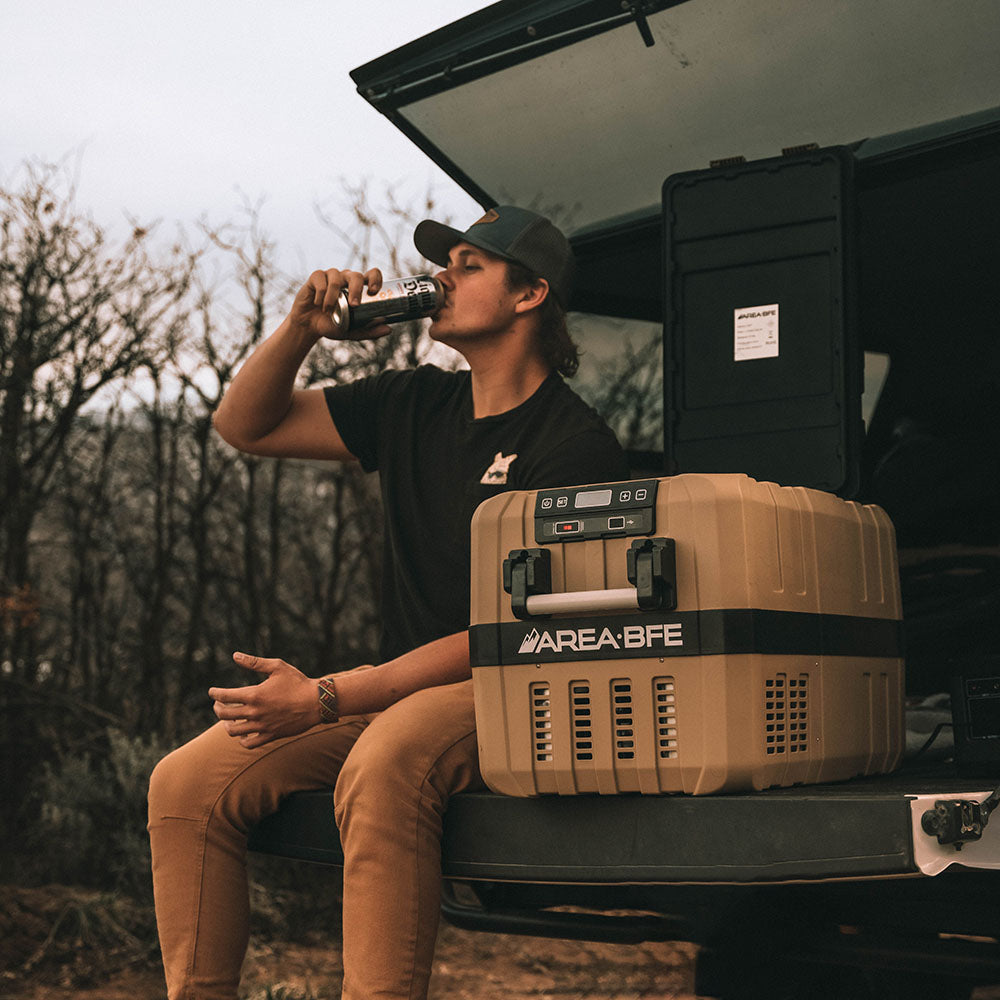Keep drinks cold and food fresh with the AreaBFE 40 fridge / freezer that is built tough for camping, van life, overloading or tailgating. Equipped with a dual hinged lid to allow your fridge to open from either end allowing for multiple mounting options, or totally removed if needed. We would recommend this fridge for 2 people, as well as overlanders that like to take or freeze food on the go. Fill it up with frozen goods or have it as a fridge for your perishables. We like to fill it full of beer.