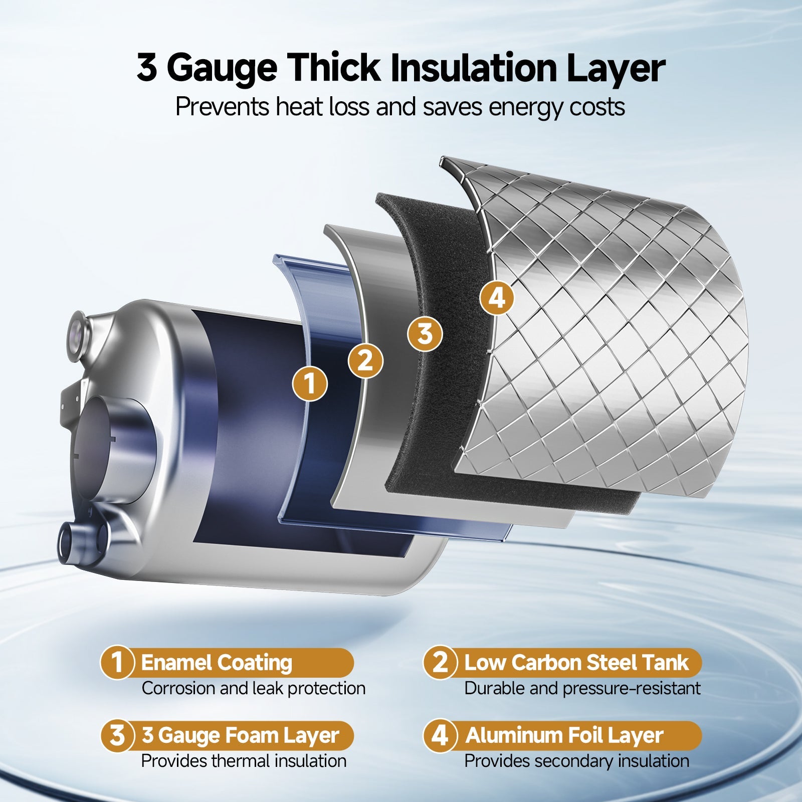 HIGHLY EFFICIENT AND ENERGY SAVING: The built-in heating element is surrounded by water within the tank, significantly improving thermal conductivity. Wrapped in 3 gauge EPDM foam, the RV tank water heater reduces heat loss to under 25% in 24 hours, offering superior insulation compared to other tank-type heaters and lowering energy consumption when you don't need to use it.