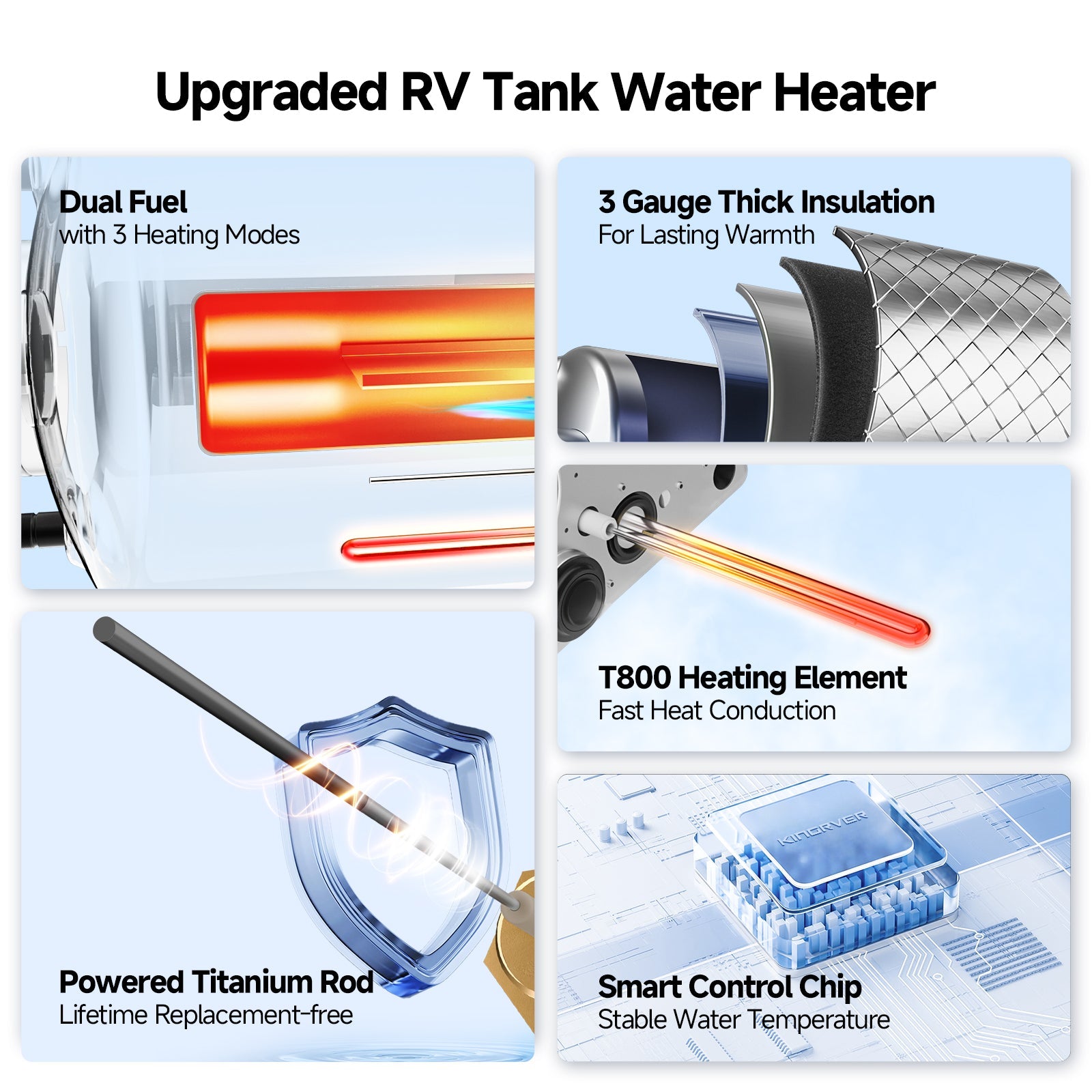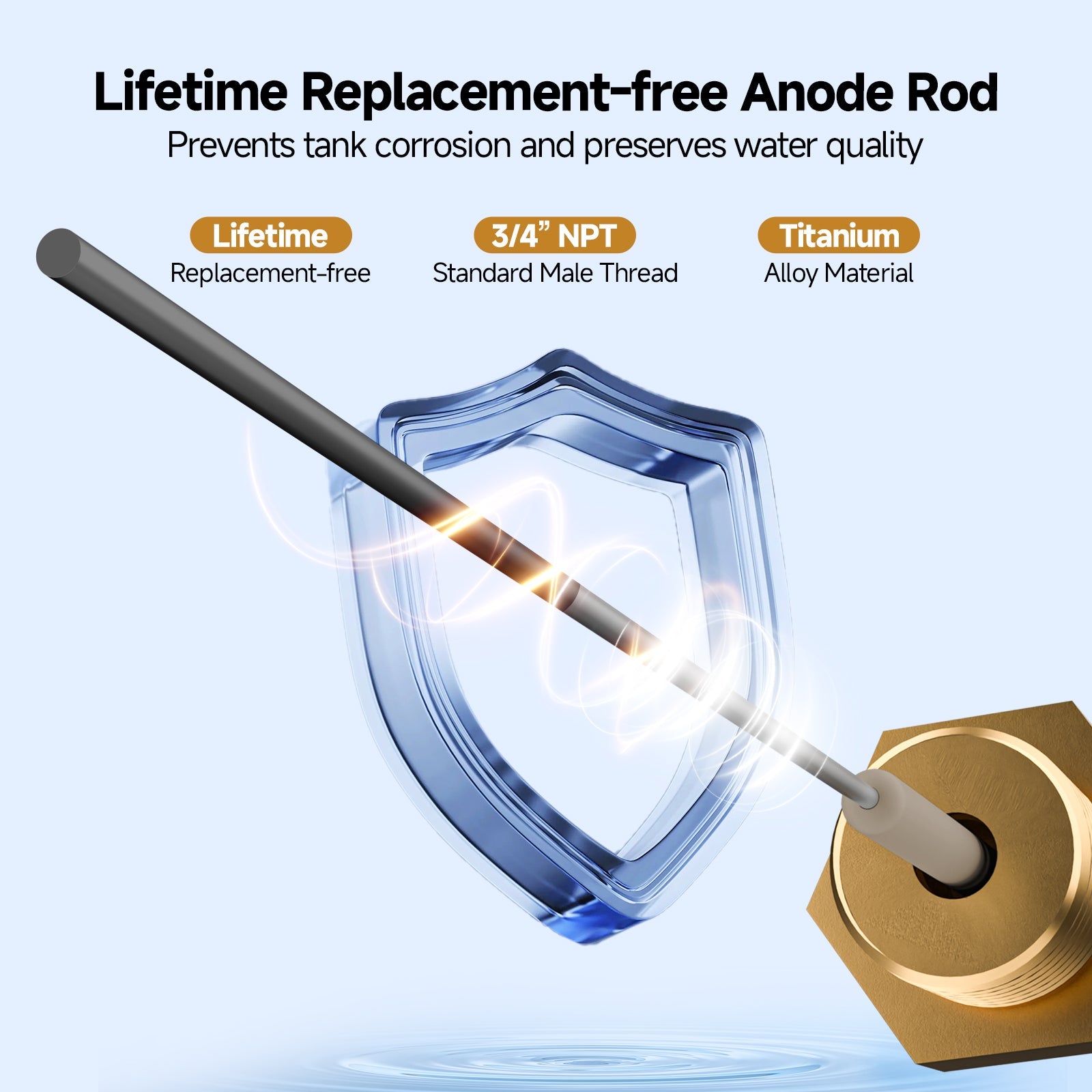 POWERED ROD OFFERS ONGOING LEAK PROTECTION: To prevent the common issue of corrosion and leakage in tank water heaters, this RV water heater is equipped with a no-replacement titanium rod. Unlike conventional magnesium anodes, it protects the tank from acidic and alkaline water sources, while also automatically sensing the concentration of calcium and magnesium ions in the water and adjusting the release of electrons to continuously optimize water quality.