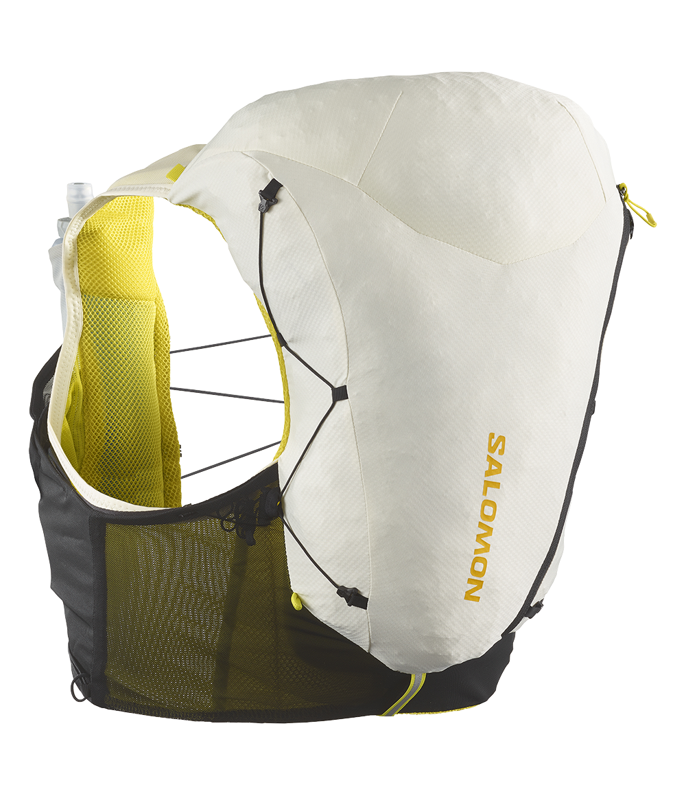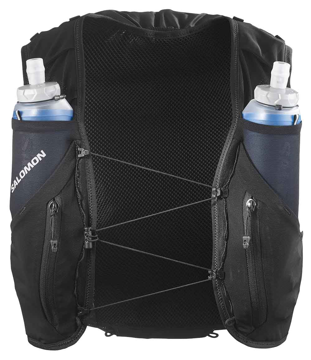- 2 Front Flask Pockets: Designed to fit Salomon soft flasks, these front pockets limit bouncing. Top elastic loops secure your flasks and keep them ready to drink.