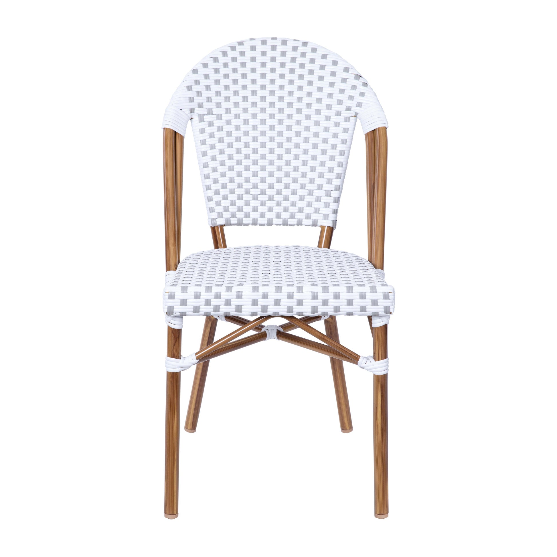 Bring the street vibes of Paris right into your restaurant, bistro, hotel, or backyard patio with this indoor/outdoor commercial grade bistro chair. The durable PE rattan back and seat are very comfortable and won't fade when used outdoors. The lightweight, but sturdy, powder coated aluminum frame boasts a bamboo look finish, holds up to 400 lbs. static weight, and will not rust. Recommended stack height for these chairs is up to 5 high for storage or transport. For your convenience, this chair arrives completely assembled for instant use and features floor protector glides to prevent damage to indoor hard flooring surfaces. This dining chair easily wipes clean with a damp cloth for quick seating turnaround.