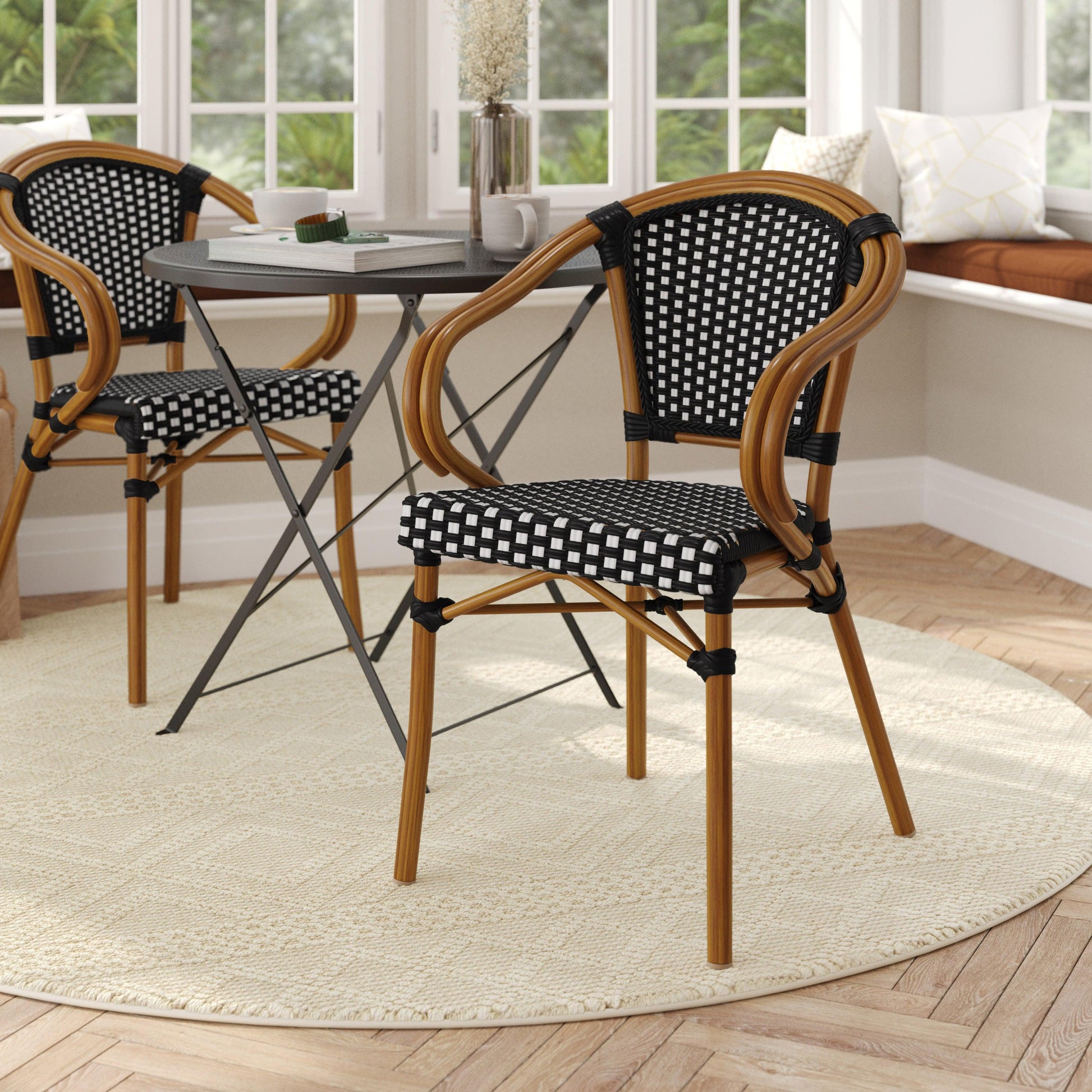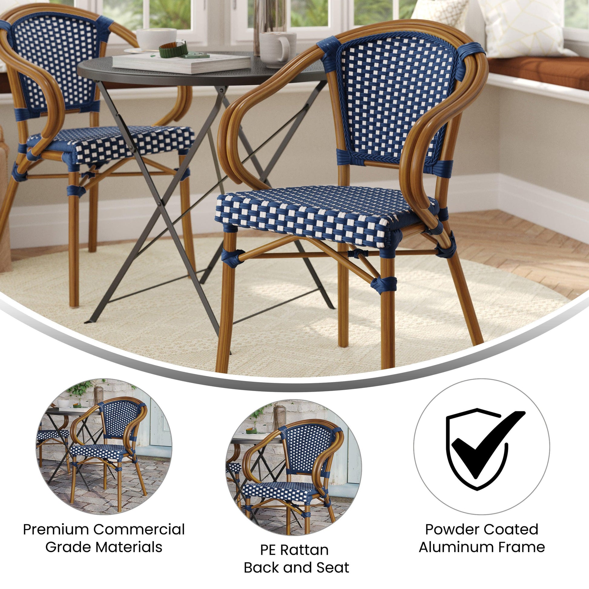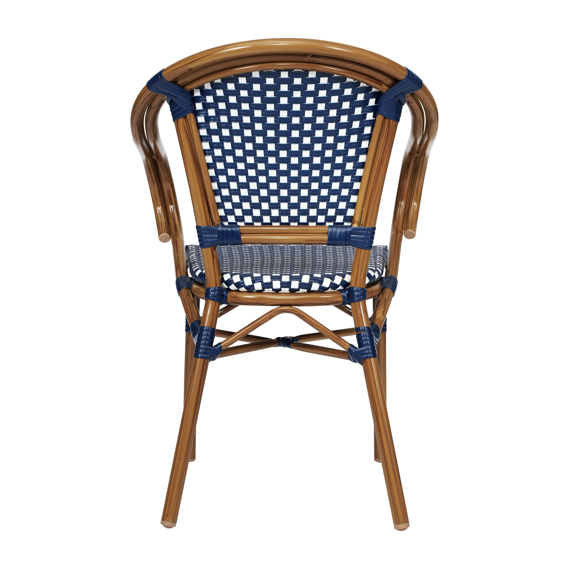 Bring the street vibes of Paris right into your restaurant, bistro, hotel, or backyard patio with this indoor/outdoor commercial grade bistro chair. The durable PE rattan back and seat is very comfortable and won't fade when used outdoors. The lightweight, but durable, powder coated metal frame boasts a bamboo look finish, holds up to 400 lbs. static weight, and will not rust. Two curved arms deliver additional comfort and structure. Recommended stack height for this chair is up to 5 high for storage or transport. For your convenience, this chair arrives completely assembled for instant use and features floor protector glides to prevent damage to indoor hard flooring surfaces. This dining chair easily wipes clean with a damp cloth for quick seating turnaround.