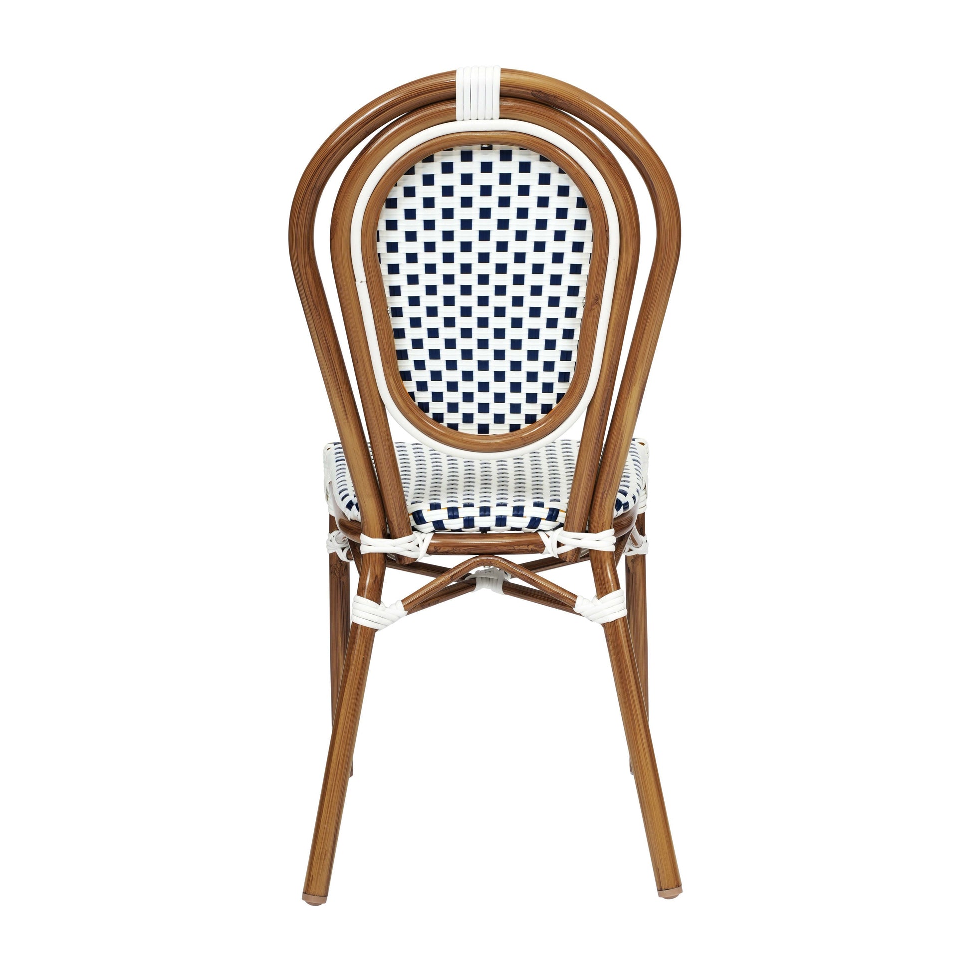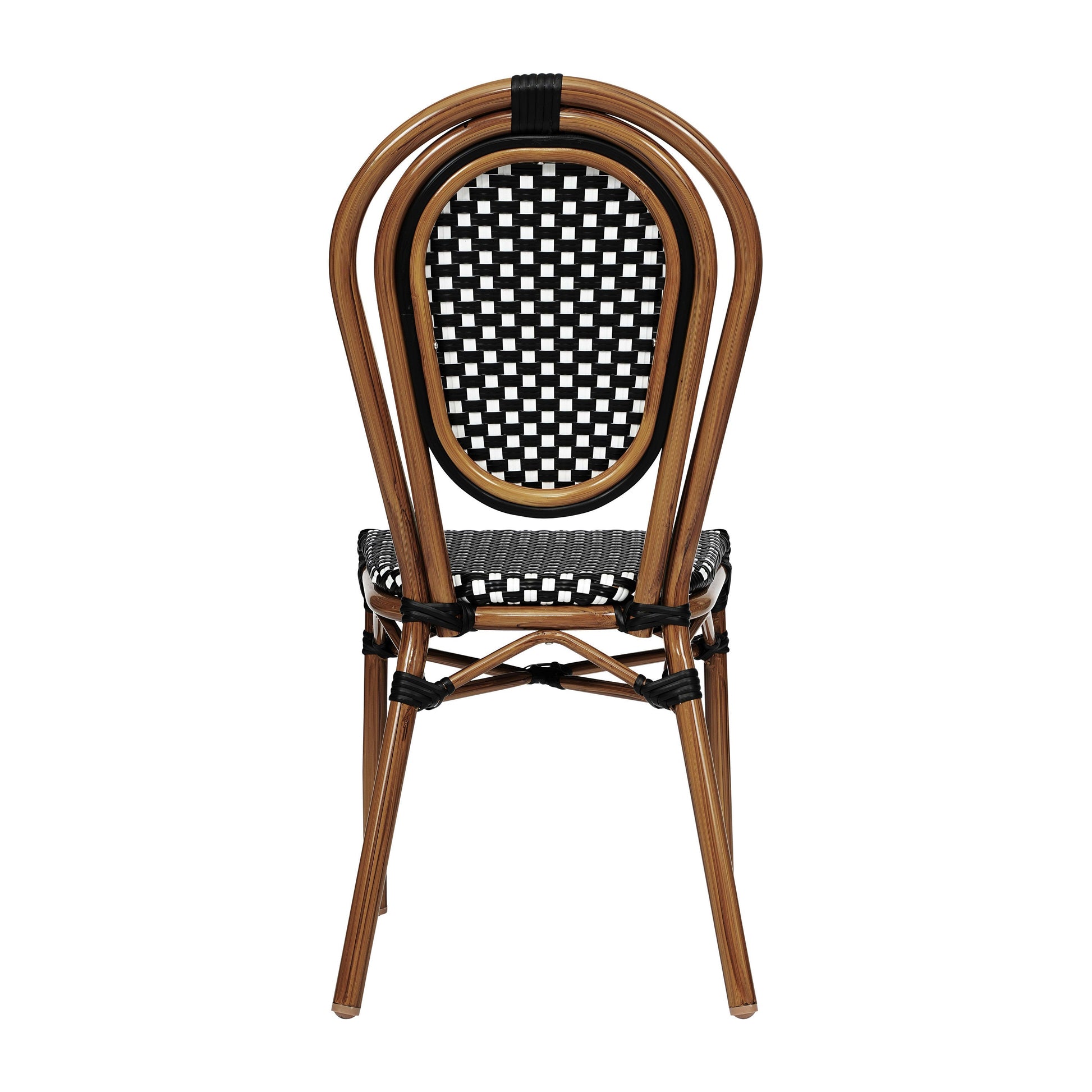 Bring the street vibes of Paris right into your restaurant, bistro, hotel, or backyard patio with this indoor/outdoor commercial grade bistro chair. The durable PE rattan Thonet-style back and seat are very comfortable and won't fade when used outdoors. The lightweight, but sturdy, powder coated metal frame boasts a black finish, holds up to 400 lbs. static weight, and will not rust. Recommended stack height for this chair is up to 5 high for storage or transport. For your convenience, this chair arrives completely assembled for instant use and features floor protector glides to prevent damage to indoor hard flooring surfaces. This dining chair easily wipes clean with a damp cloth for quick seating turnaround.