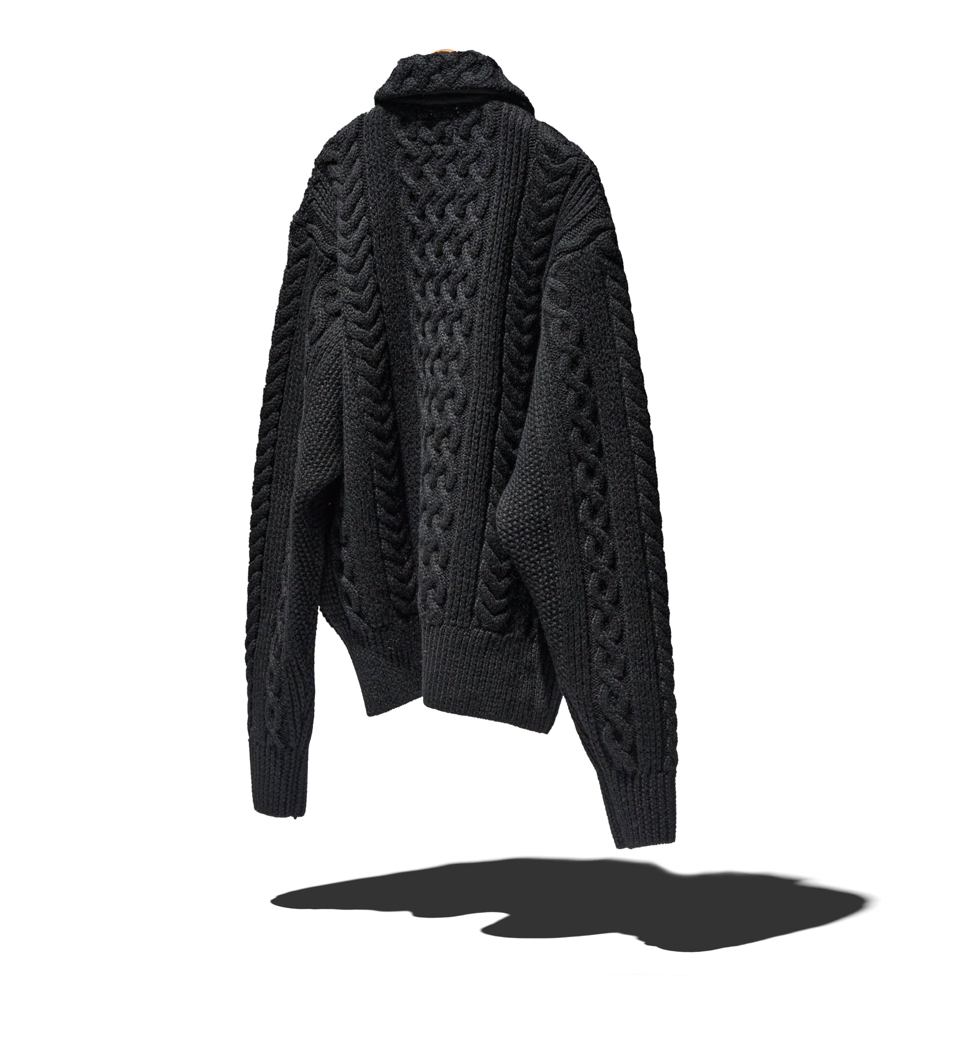 The pattern bulge of the aran knit, which has been impossible to reproduce on an automatic machine, has been faithfully reproduced by using a special knitting machine, which is quite rare in Japan.