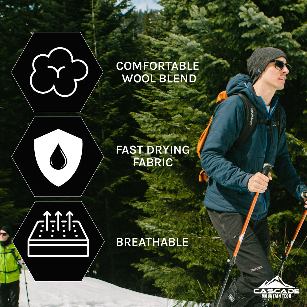 Don't be caught out in the cold this winter without the stylish Cascade Mountain Tech Merino Wool Beanie. This skullcap style beanie is lined with an inner ear-band, making it extra warm, and fits most head sizes. It's the perfect accessory for cold nights camping or ski days with variable conditions. This two-pack offers one light grey and one dark grey beanie. Keep one at home and one in the car, or use them to keep your kids warm during colder months. Our beanies look great on men, women, and kids.