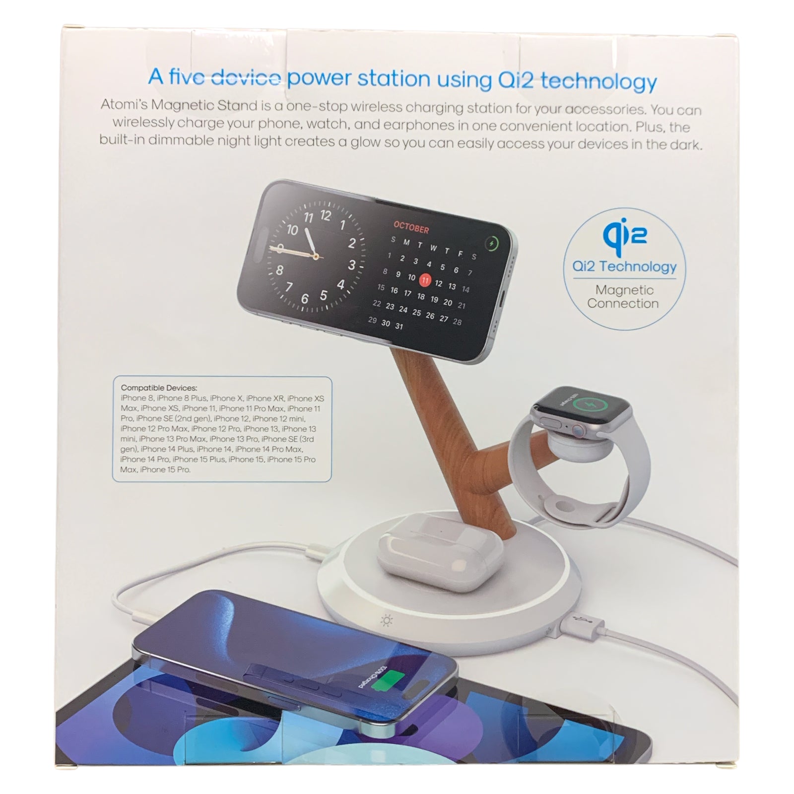 Discover the ultimate charging solution with Atomi's Magnetic Wireless Charging Stand - a unified wireless charging hub for all your cherished Apple gadgets and wearables. Effortlessly power your iPhone, Apple Watch, AirPods, and two additional USB devices wirelessly in one unified and convenient location. This cutting-edge charger fuses the revolutionary Qi2 wireless charging technology with a robust magnetic mount, ensuring your iPhone remains secured while getting powered up. With the advanced 15W Qi2 wireless rapid charging technology, you can charge your iPhone faster and more effectively than ever before. To wirelessly charge your Apple Watch and AirPods, simply position your devices on the respective charging pads for quick and seamless magnetic charging. The charging station also includes a USB-A and a USB-C charge port, allowing for simultaneous charging of two additional devices. Moreover, the built-in dimmable night light adds a customizable luminescence, making it easy for you to access your devices even in the dark. Just a tap on the base switches between warm, natural, or cool white light, and holding down the button lets you adjust the brightness to suit your preference. Say goodbye to fumbling for your devices in the dark. Boasting a sleek, wood-inspired pattern paired with a semi-gloss white finish, this charging station is an aesthetic addition to nightstands, desks, end tables and more, blending seamlessly with any home or office décor. Its compact and portable design not only saves space but also ensures you can carry it with you on your travels, allowing for centralized charging of your devices. Minimize clutter and maximize convenience with the Magnetic Wireless Charging Stand. (This product is designed with MagSafe and Qi2 compatibility, which primarily benefits Apple users, however, many Android devices that support Qi wireless charging can still work with it using a compatible magnetic adapter.)