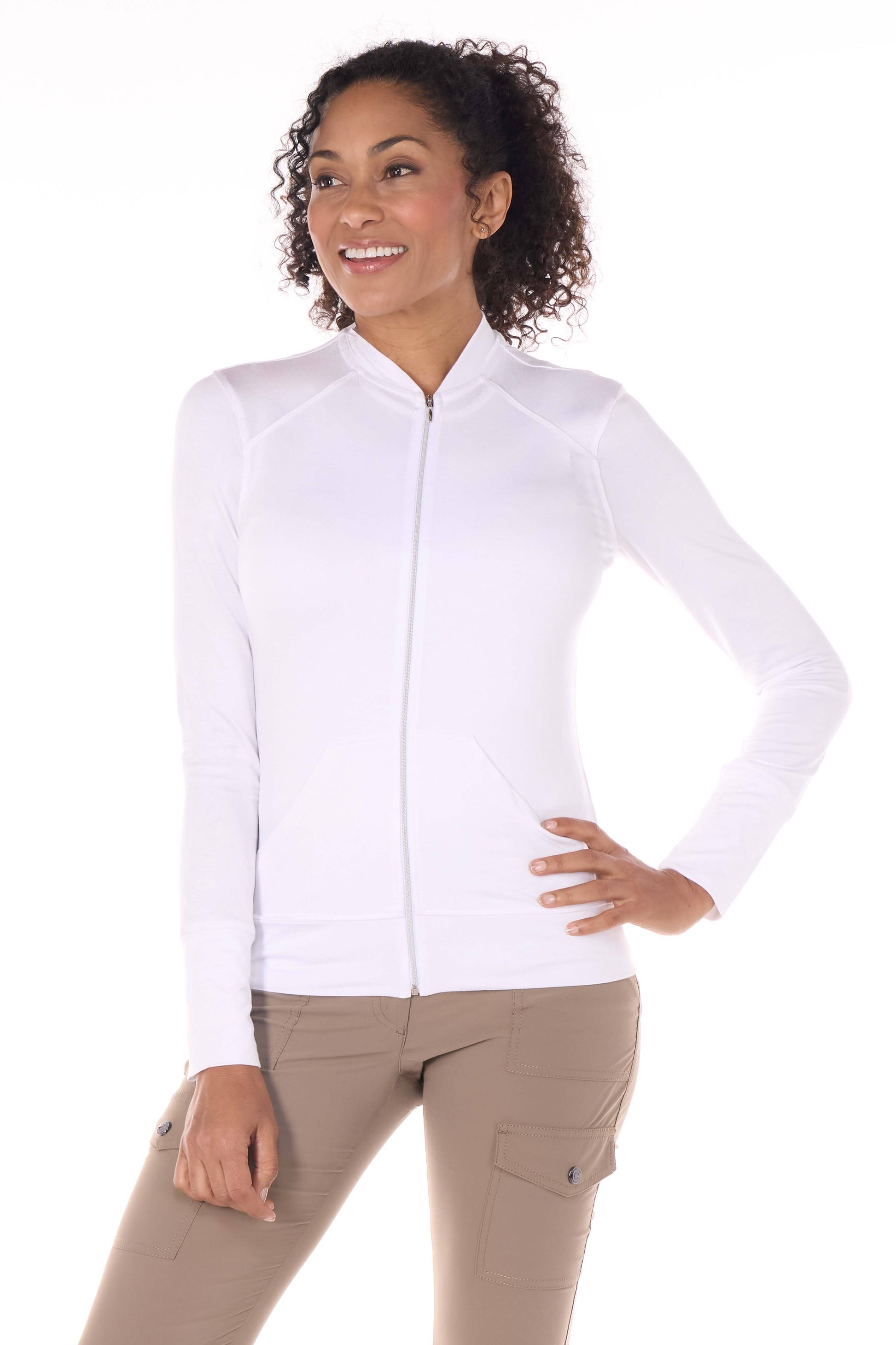 Land the sporty-chic look with this ultrasoft, lightweight jacket. The sleek shape is thoughtfully finished with a chic baseball collar and front kangaroo pouch pockets for stashing small items. Whether you wear it to your workout or to travel around the world, this essential layer keeps you in comfort and style.