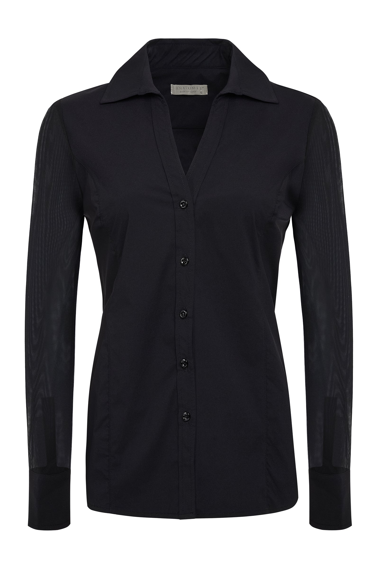 Whether you're looking for the ideal piece to impress at your next meeting, head to an elegant dinner, or be comfortably chic at home, the Beth button-down shirt is for you! Crafted in our comfortable stretch woven fabric, this feminine style features sheer mesh sleeves and a sexy V-neck. Impeccable tailoring—a pointed collar, two-button cuffs and rounded hem—makes it a modern wardrobe essential for travel or work week chic.