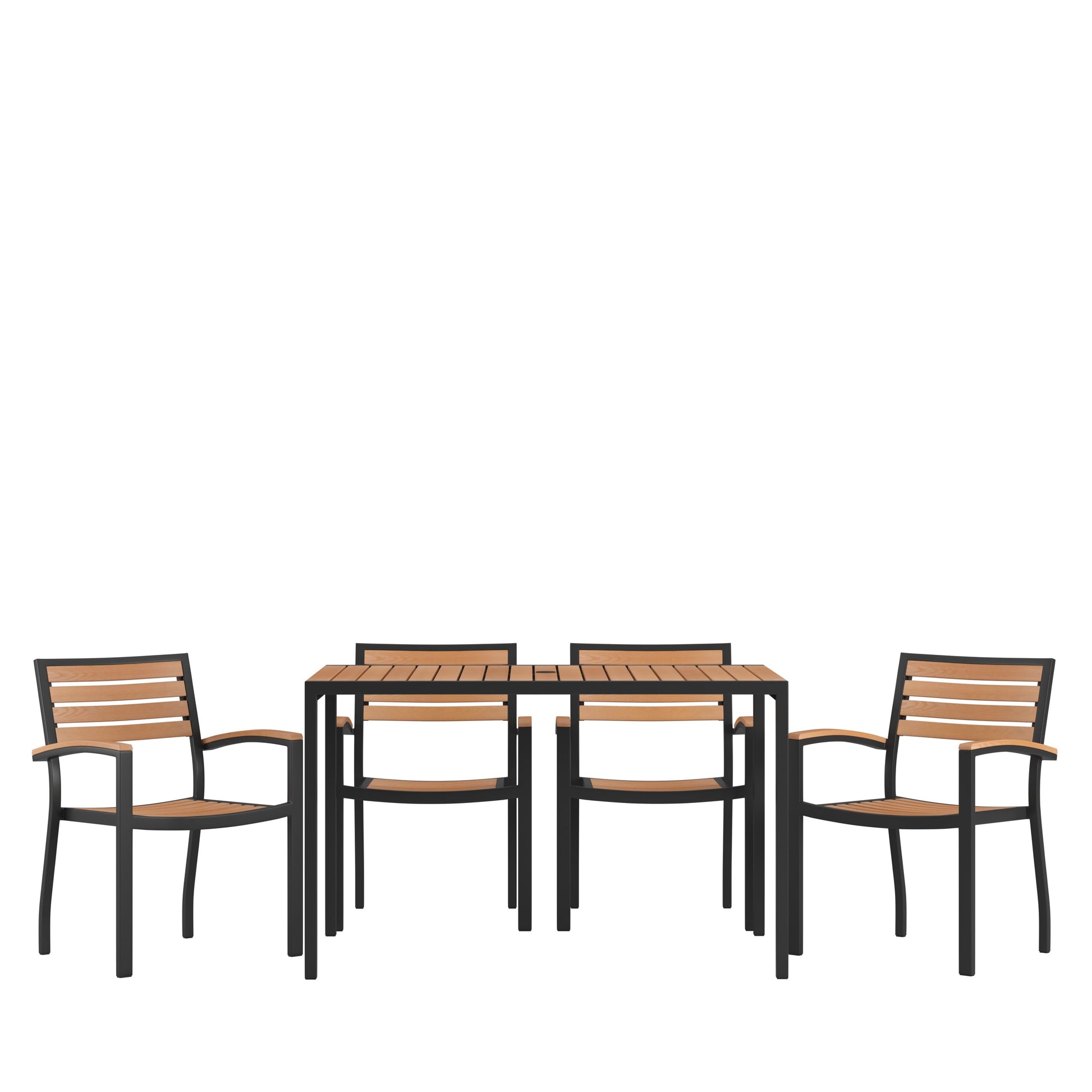 Gain more outdoor dining time at your home or business with this 5 piece 30"x 48" table and 4 side chairs set. Patrons love to dine al fresco and this all-weather dining set won't disappoint. The trending synthetic slats contrast beautifully with the metal frames and blend seamlessly in almost any decor. Pick the umbrella that suits your personal taste and insert it into the umbrella holder hole to remain cool while outside.