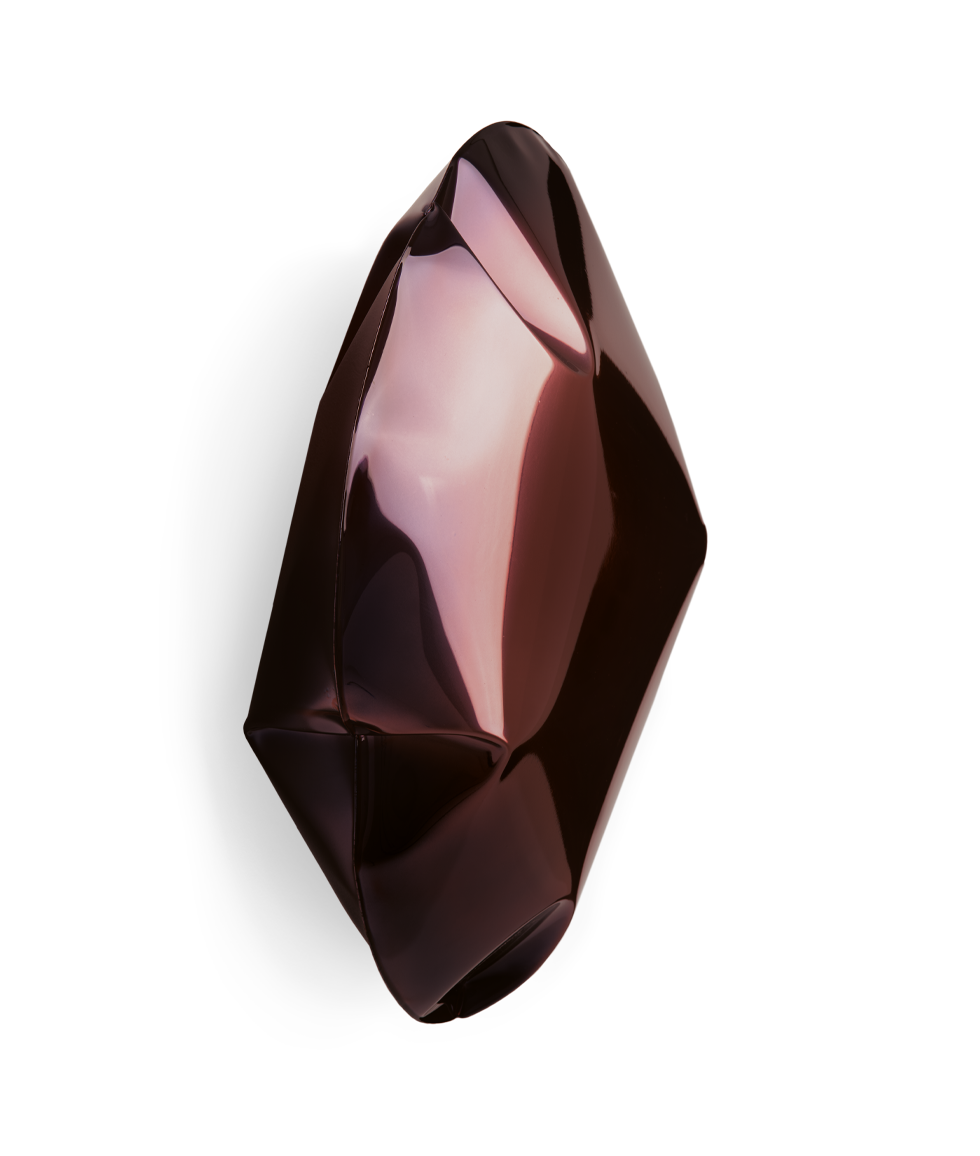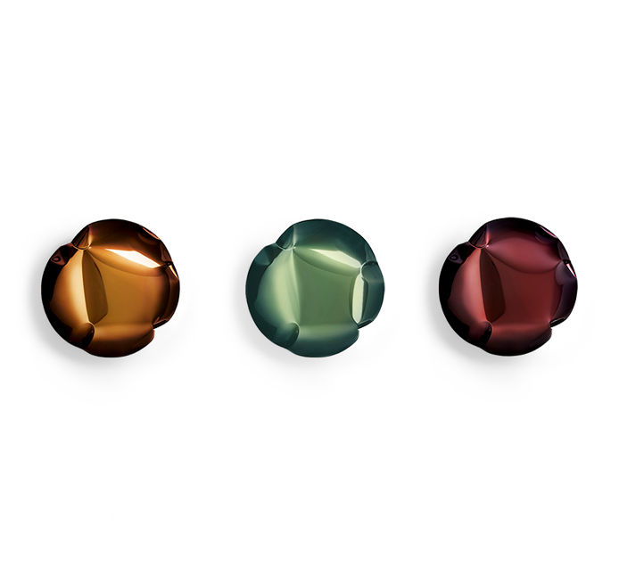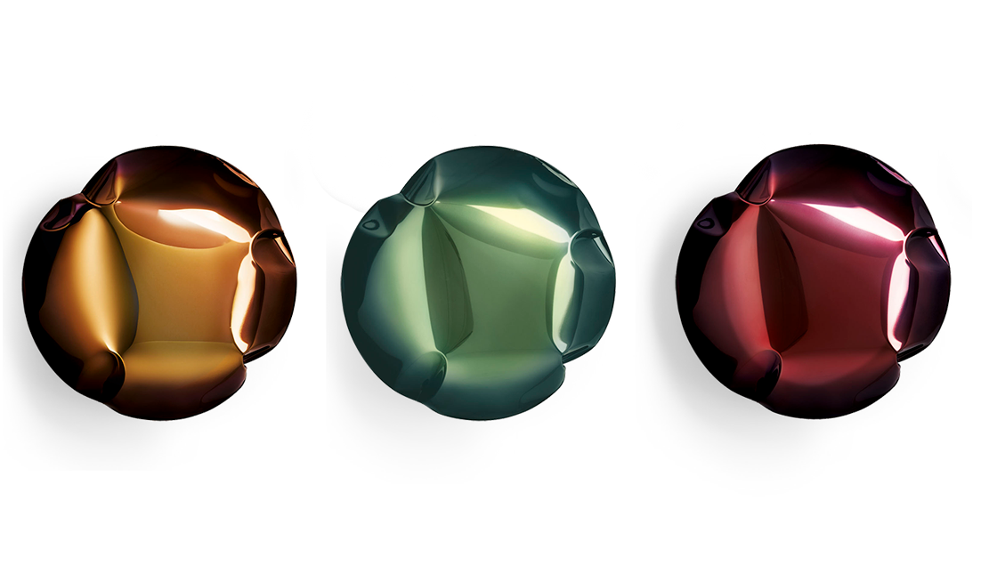 Compact wall sculptures in ultra-shiny, mirror-finish steel.