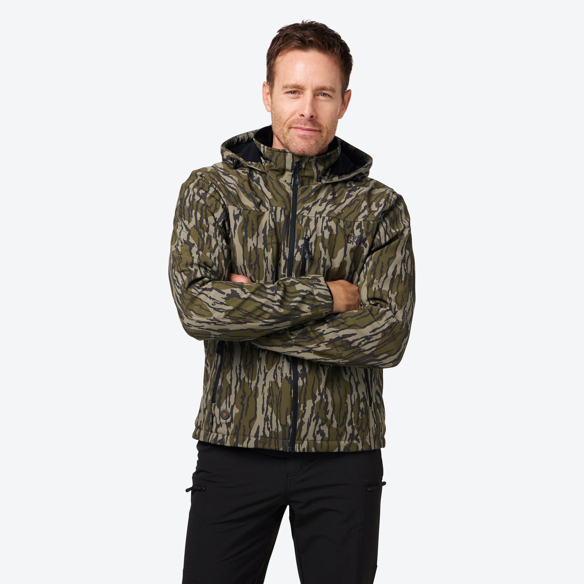 The Mobile Warming® Mossy Oak BLX Heated Jacket is a classic full zip hooded hunting jacket in the original Bottomland pattern from Americas #1 Camo brand. Made with 4-Way stretch low noise fabric, with DWR water repelent finish, YKK zippered chest and front pockets, fleece lined for comfort and added warmth, and elastic wrists to keep the elements out and the heat in. We added a Mobile Warming® 7.4volt multi-zone heat system to bring hours of heat for those cold fall days in the field. Bottomland is one of Mossy Oak's most popular camo patterns, the go-to pattern for gamekeepers in and out of the woods - whether in season or in the dirt. It conceals and conserves through it's Official Camouflage Status from Ducks Unlimited and NWFT.