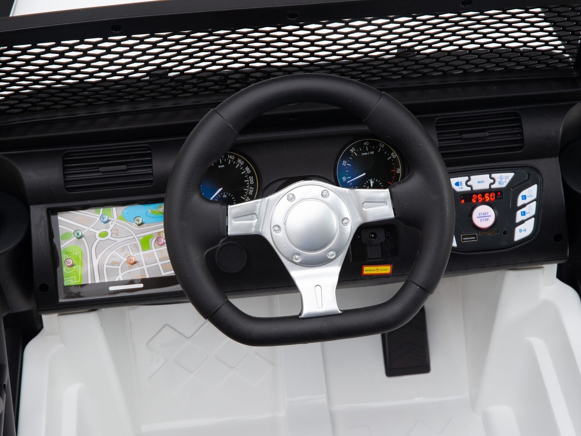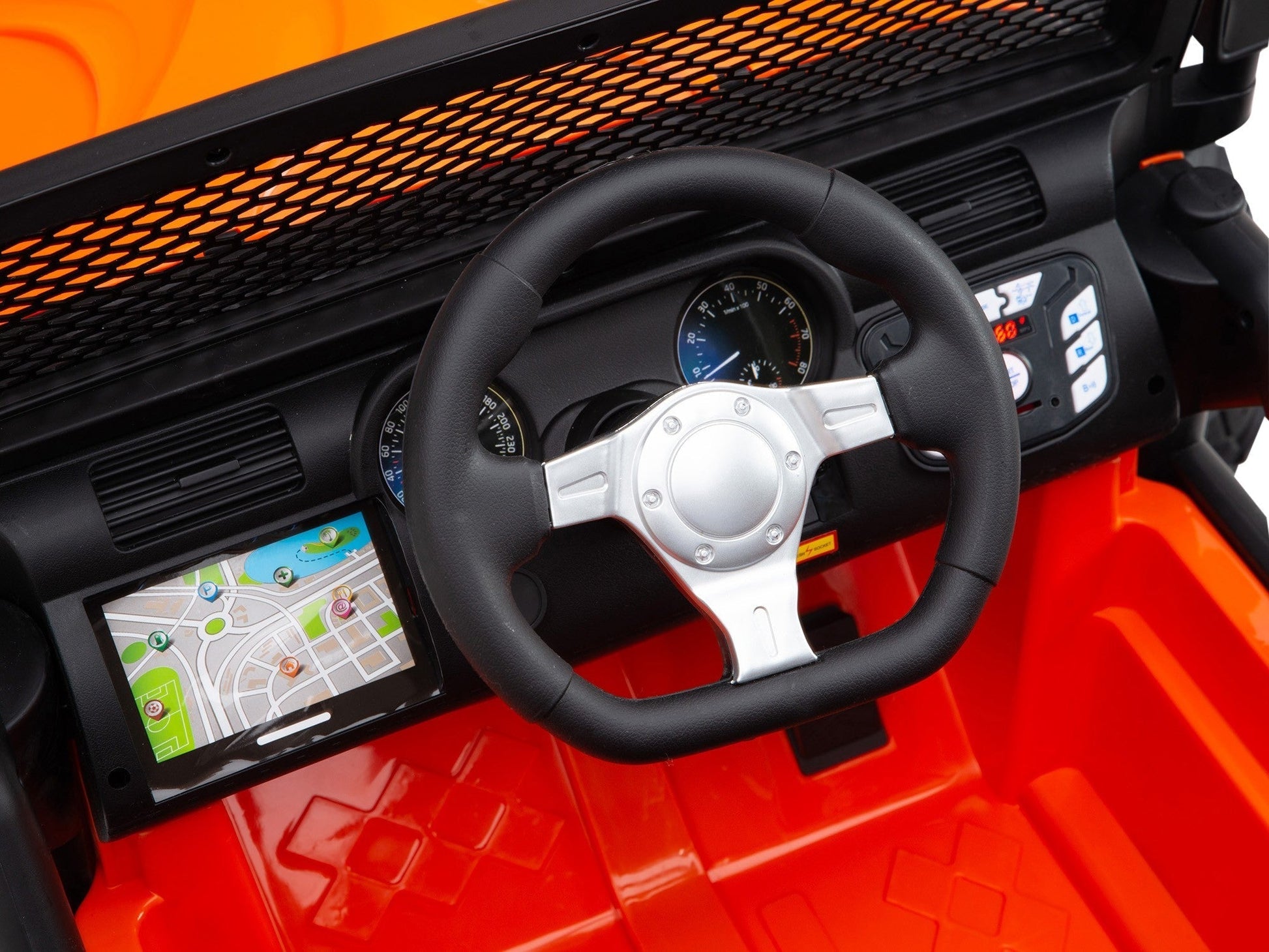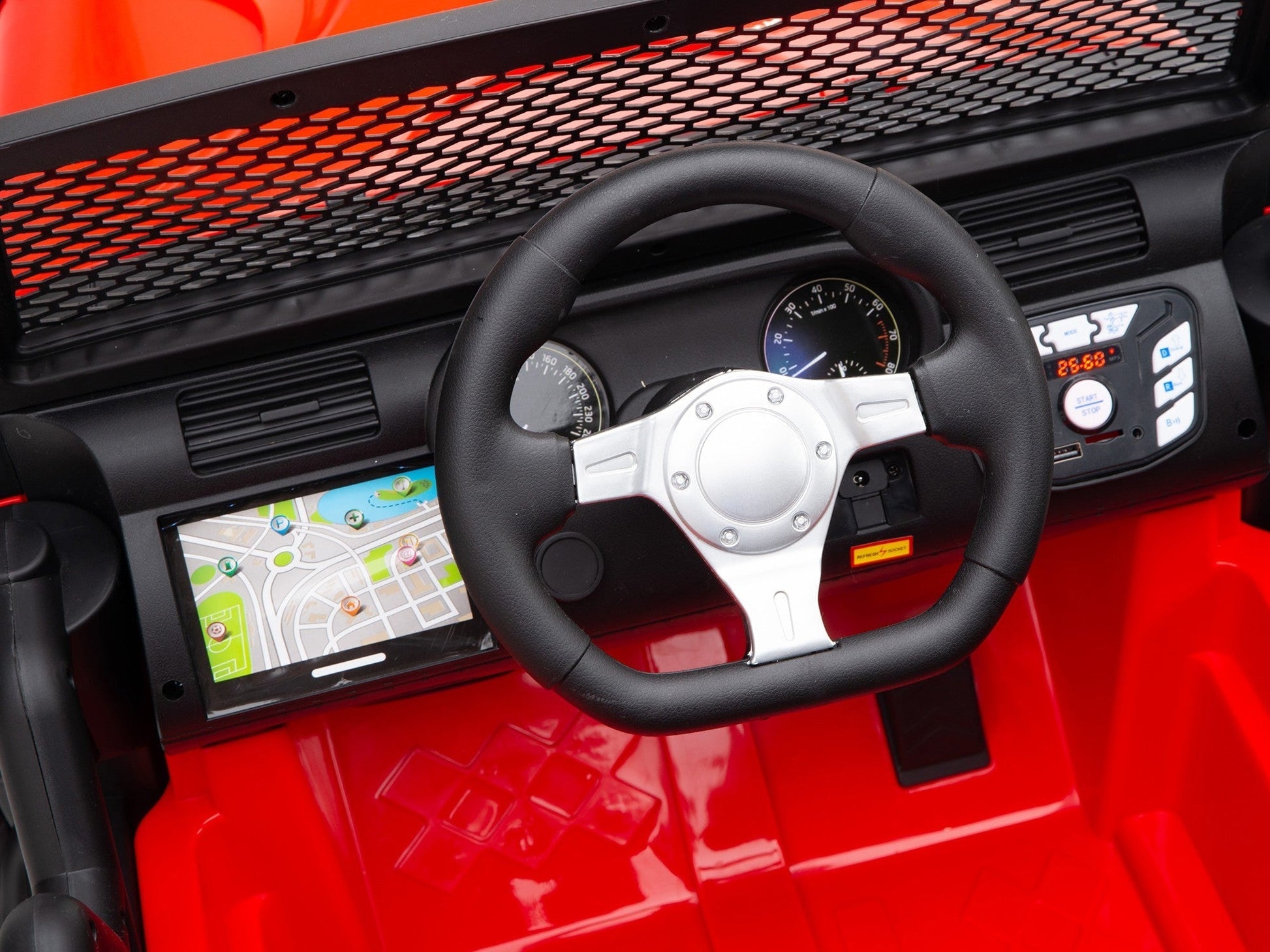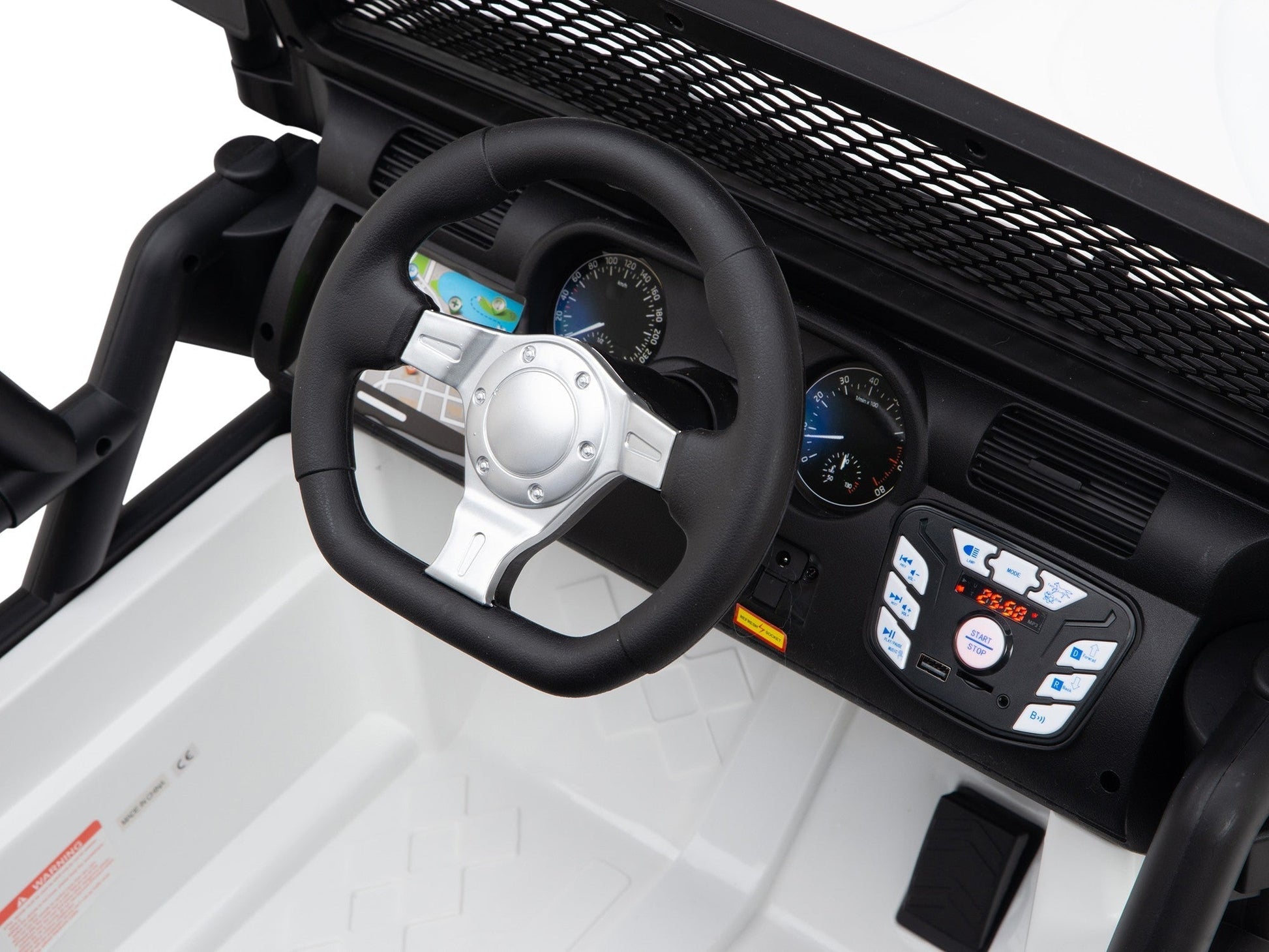 This children's off-road toy car boasts a 2.4g remote control that gives parents full command over the vehicle, enabling them to join in on the enjoyable moments with their child. Additionally, kids can independently operate the car by using the foot pedal to adjust the desired speed. The ride-on car features various exciting amenities such as an MP3 player, USB port, FM radio, bright LED headlights, horn, Bluetooth, and a bottle holder. The front storage bin offers ample room for children to bring their favorite toys on their exciting expeditions.