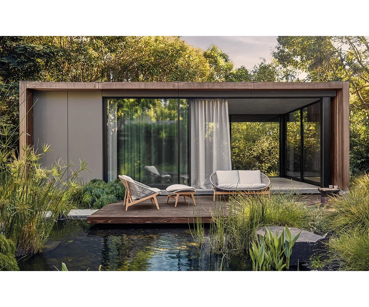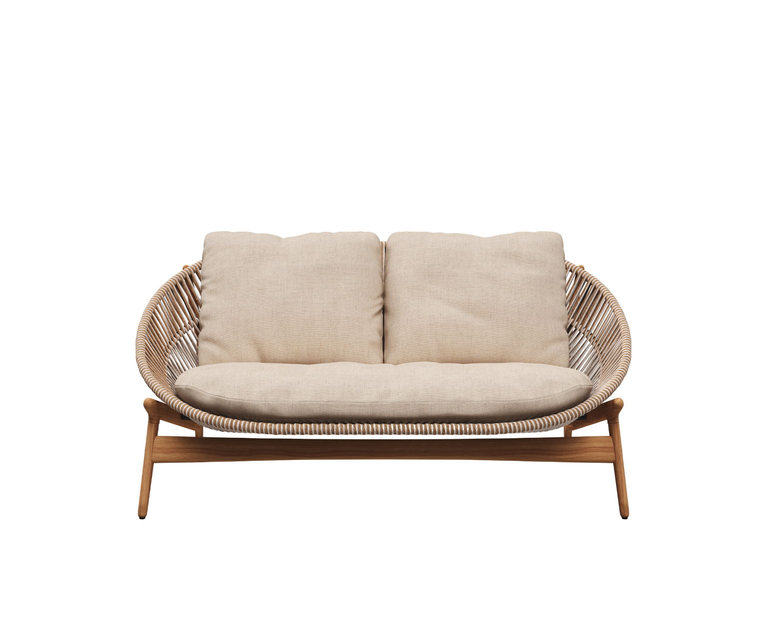 Inspired by the delicate fronds of a unfurling fern leaf, the Fern collection by Sebastian Herkner has a design language that harks back to nature. Combining plantation teak with a soft finish outdoor rope, the enveloping, woven back rest both protects and provides the comfort and is attached to a typically Scandinavian style teak frame, which mirrors its contours and underlines the comfort aspects.