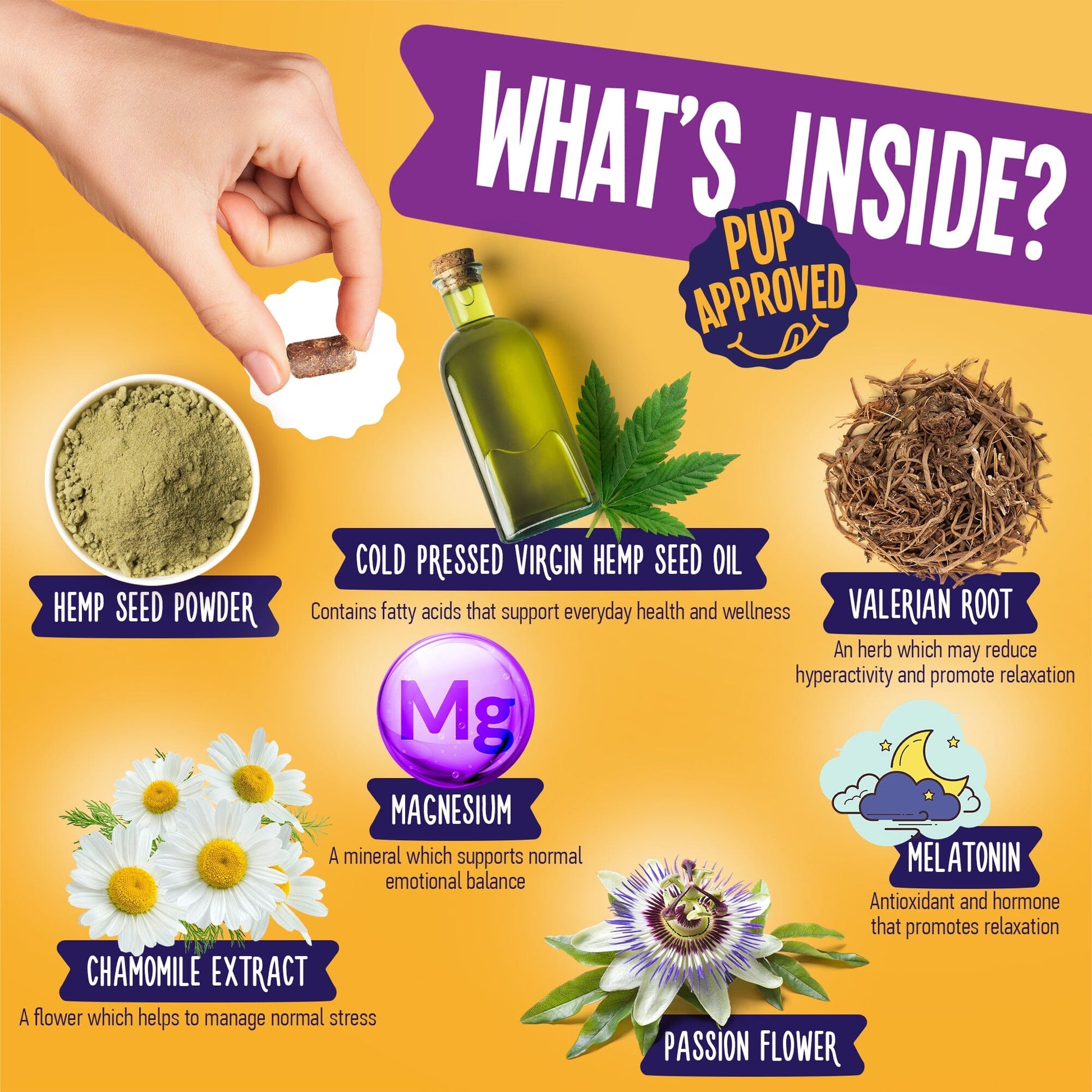 Carefully Selected Ingredients: With your calm dog in mind, these calming chews for dogs are made with high-quality and natural ingredients, featuring a balanced blend of melatonin, valerian root, chamomile, passion flower, magnesium, and hemp extract.