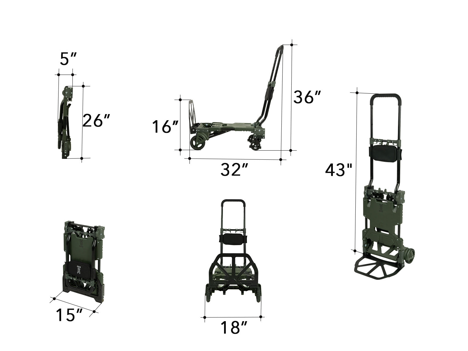 W x D x H Four-wheel mode: 32 in x 18 in x 36 in (81 cm x 45.5 cm x 91 cm)