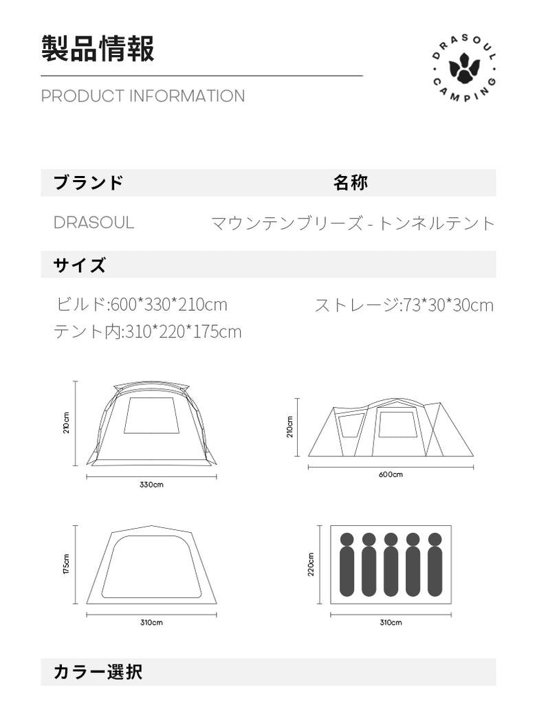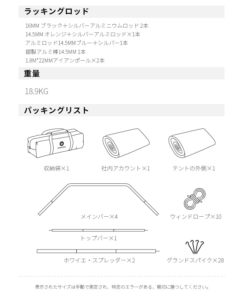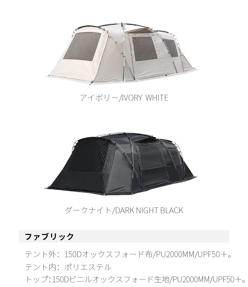 | 備考 | *テント本体のみ含む *キャノピー、ドアカーテン、フロアマットは付属していませんので、別途購入が必要です *水はけのいい平坦な場所を選んで設営してください。 *強風時や悪天候時には速やかにテントの使用を中止し安全な場所へ避難してください。 *本製品は常設用ではありません。長時間日光に晒された場合、退色や生地劣化、 シームテープの剥がれなどを起こします。 *紫外線の影響と思われる素材の劣化により、耐久限度を超えたものは修理できない可能性があります。 *必ずペグとロープでしっかりと固定してください。 *足元の設営用ロープやペグに引っかからないようご注意ください。 *濡れたままでの保管はカビや異臭、生地の色移り、劣化や汚れなどの原因となります。 使用後は必ず風通しのいい日陰で十分に乾燥させ、汚れを落としてから保管してください。 |