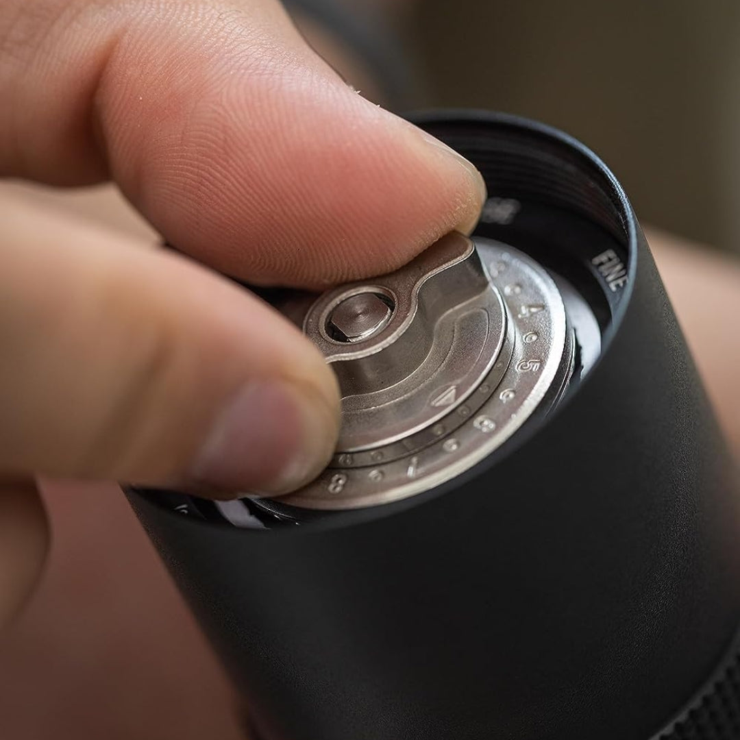 Product features: A coffee mill that can be stored compactly with a foldable integrated handle. It exudes a unified stylishness and luxury of metal. The five-axis CNC-machined 55-58HRC hardness milling blade achieves a uniform grind with almost no coarse grains while minimizing the generation of fine powder.