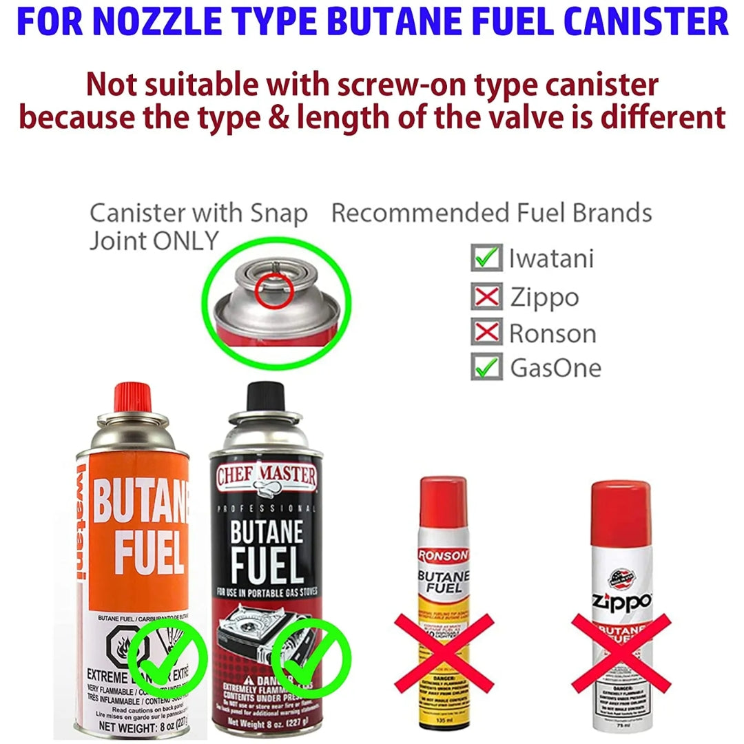 3)Work with butane gas canister which has a metal ring around the top with about a 1/2" slit missing (Canister with a short nozzle and snap joint).