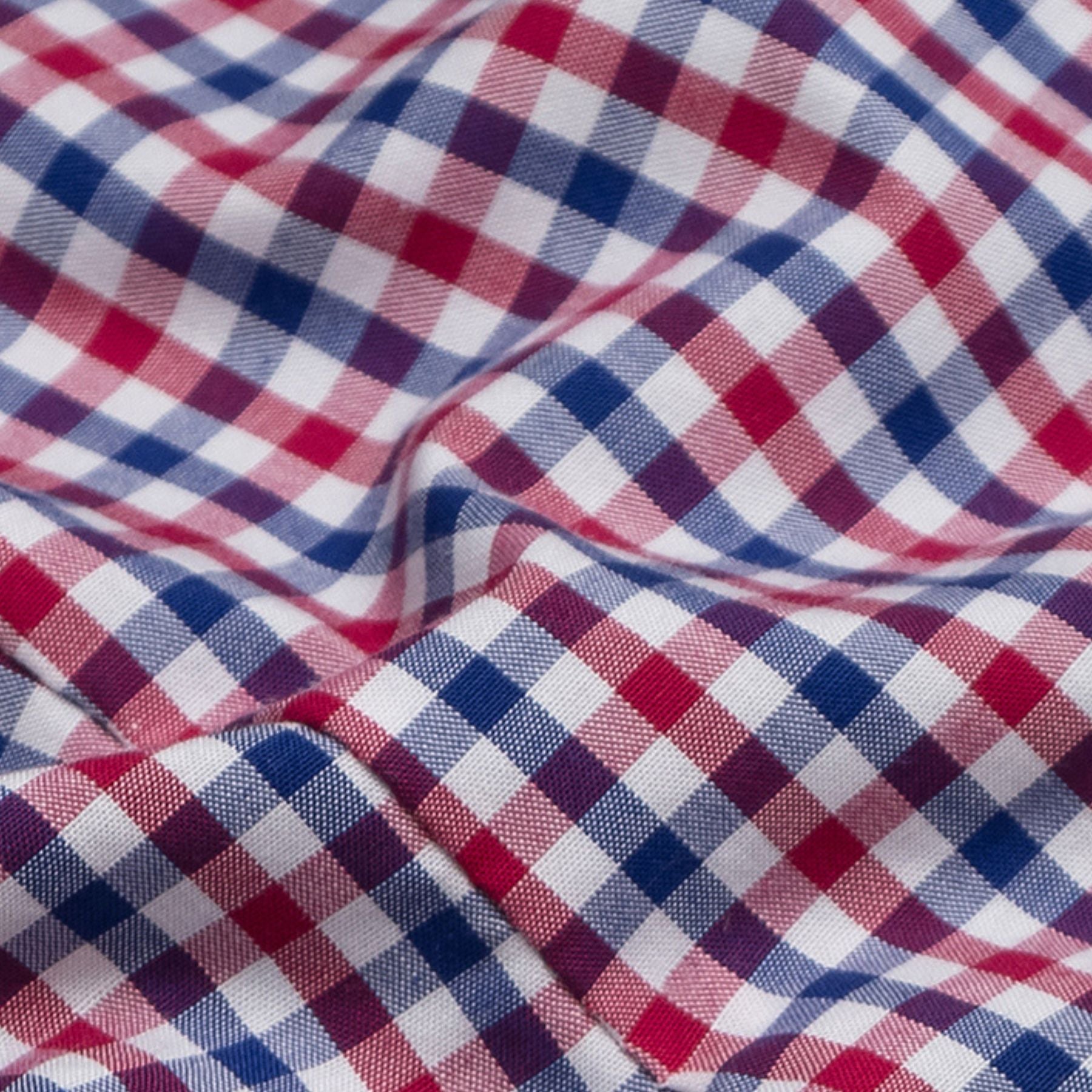 A deep navy color with red, blue and white gingham fabric lining the inside collar.