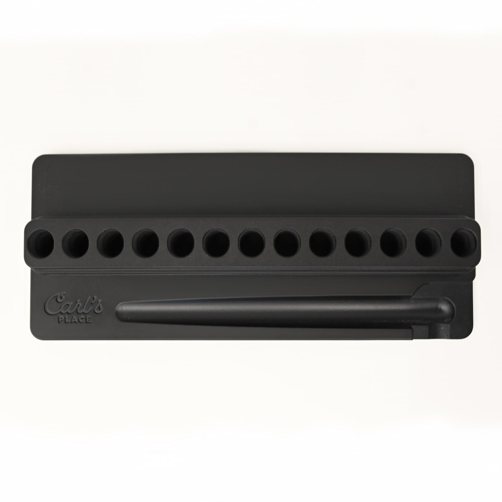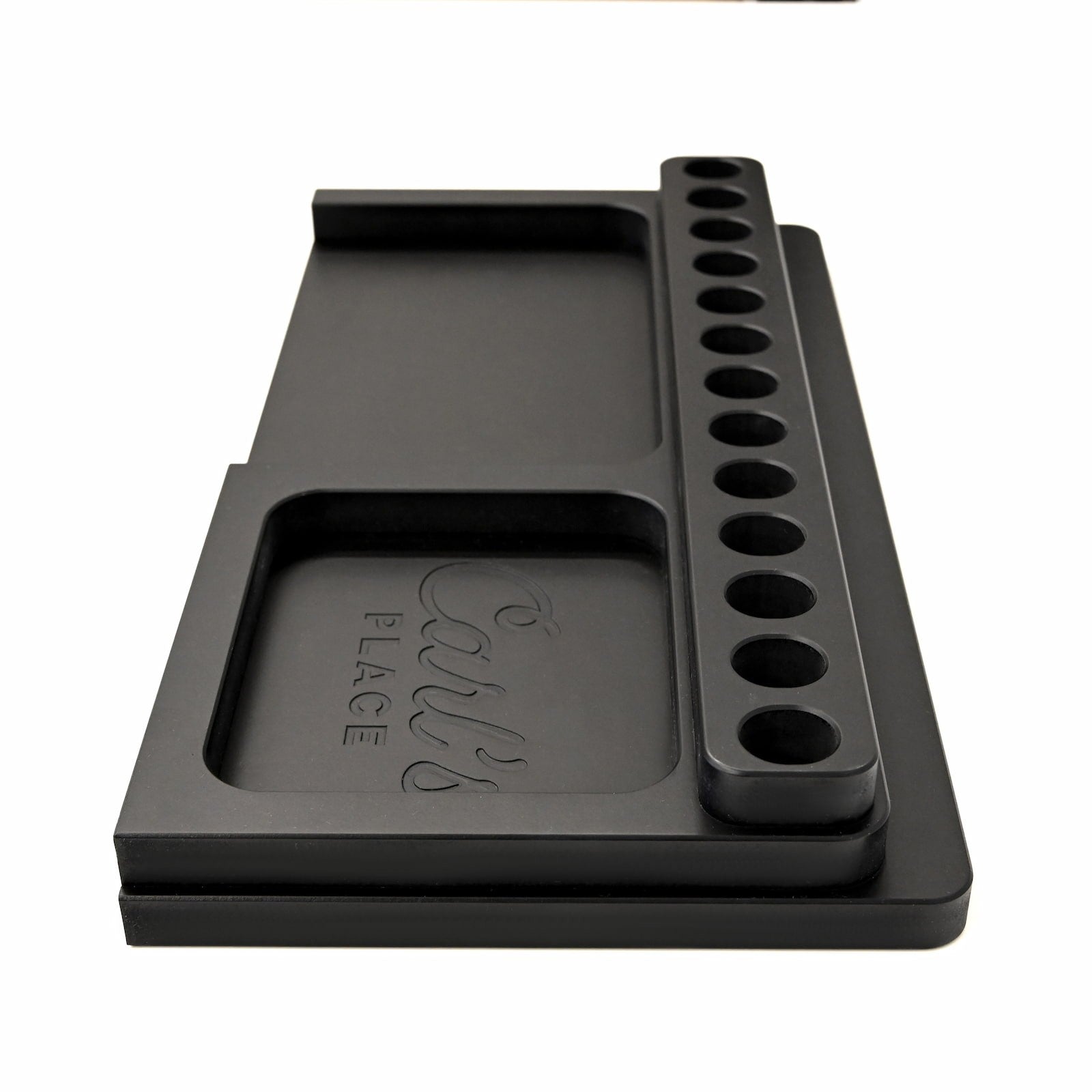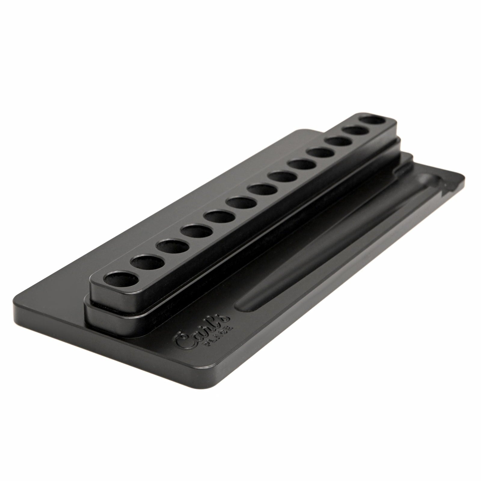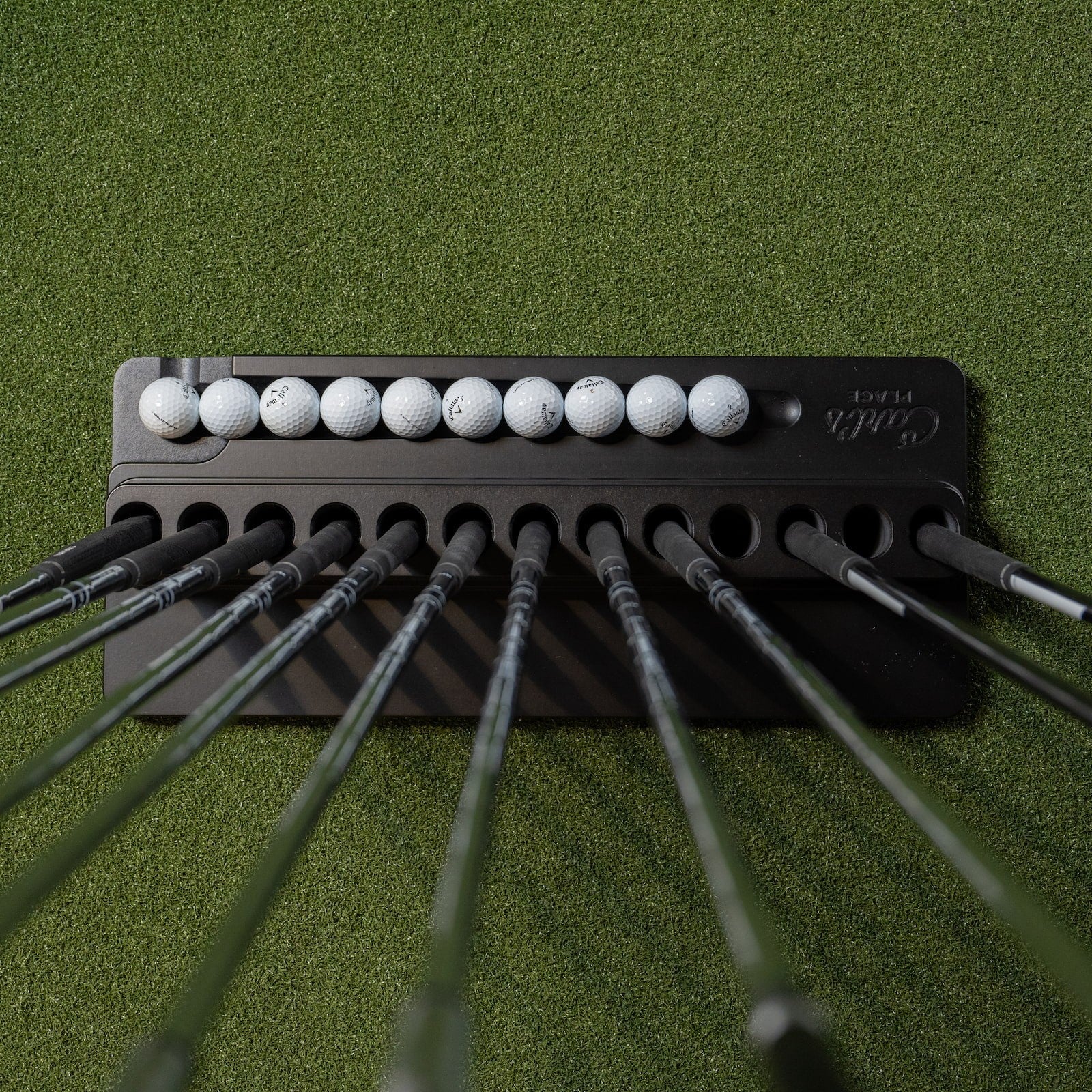 The Clubhouse Compact fits on or near your hitting surface. Alongside 13 club holes, it features an angled slot specifically designed as a ball dispenser.