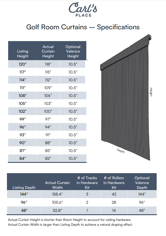Choose your golf simulator curtain based on your precise room dimensions, rounding up to the nearest available option. Each order includes (1) curtain panel, while ceiling hardware and valence are available for purchase separately.