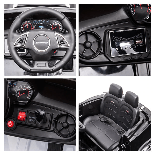 The Magic Cars Chevy Camaro Ride On Car offers a variety of impressive features. These include a rechargeable 12 Volt battery system, twin 12V Motors for powerful performance, start-up sounds, and full function power steering for driving in all directions. With speeds up to 5mph, real opening doors, a comfortable leather seat, working lights, adjustable seat belt, and options for MP3/iPhone input, stereo radio with volume control and speakers, and durable rubber tires, this car has everything your child needs for a thrilling ride. To ensure safety and peace of mind for parents, Magic Cars now includes a new and improved Bluetooth remote-control. With this remote, you can stop the car at any time and choose between two speed options for your child's driving. This remote also allows for full control of the car's movements, including driving forward, backwards, turning left or right, and stopping.