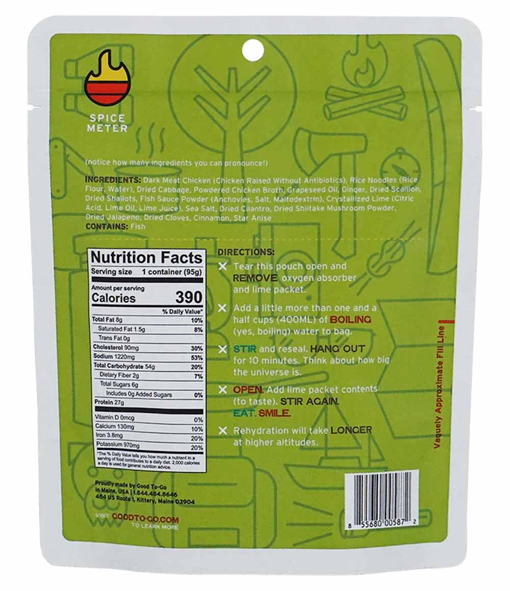 Ingredients (notice how many you can pronounce!) — Dark Meat Chicken (Chicken Raised Without Antibiotics), Rice Noodles (Rice Flour, Water), Dried Cabbage, Powdered Chicken Broth, Grapeseed Oil, Ginger, Dried Scallion, Dried Shallots, Fish Sauce Powder (Anchovies, Salt, Maltodextrin), Crystallized Lime (Citric Acid, Lime Oil, Lime Juice), Sea Salt, Dried Cilantro, Dried Shiitake Mushroom Powder, Dried Jalapeno, Dried Cloves, Cinnamon, Star Anise.