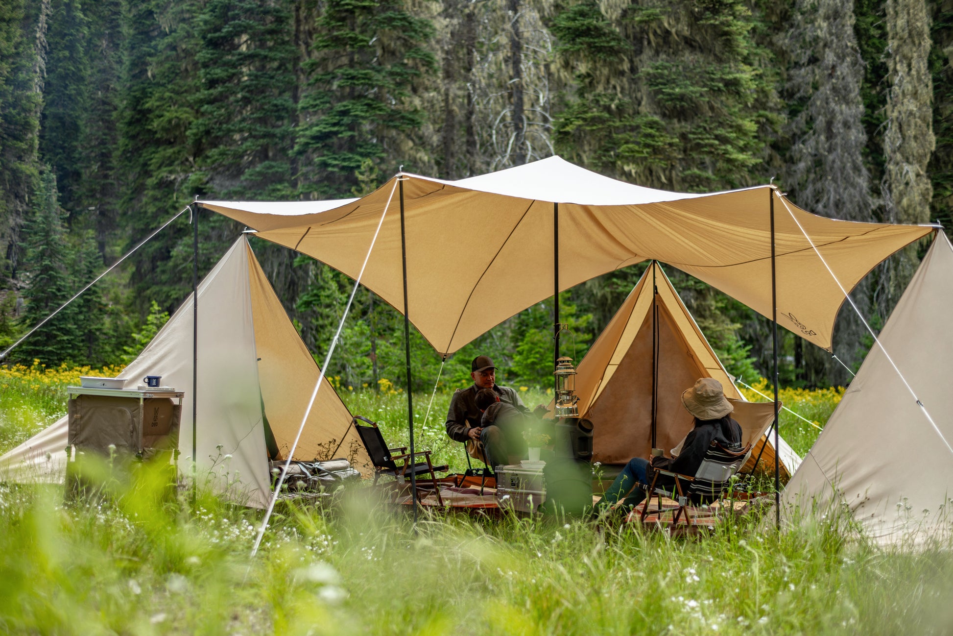 This architecturally stunning shelter redefines the three-room tent. Three Chimaki 2 person tents give private sleeping chambers for three couples or a big family. The three tents face onto a shared space, a covered courtyard, created by the massive octagonal Okra Tarp. Made of premium polycotton. Poles and pegs included.