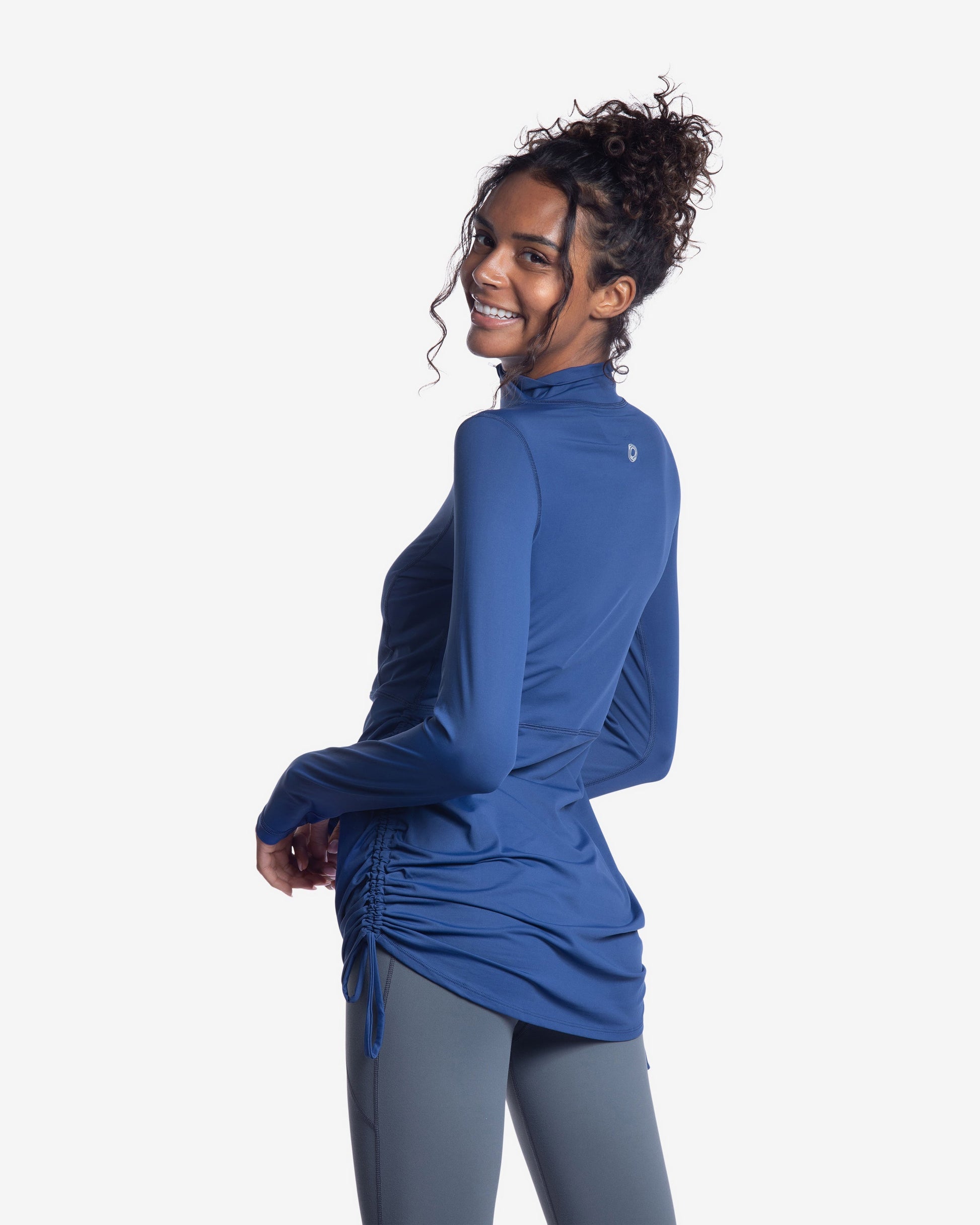 The BloqUV adjustable cover up features side ruching to convert the length from a dress to a tunic to a shirt. High zippered neck and long sleeves offer sun protection while keeping you cool and comfortable. This indispensable, multi-functional piece can serve as a swim shirt, swim dress, rash guard or beach cover up. Wear it short as you play, let down the sides and you’re ready for lunch in town. Great worn over BloqUV tights. Enjoy SPF protection while playing tennis, paddle boarding, boating, boating, fishing, running, swimming, walking or shopping.