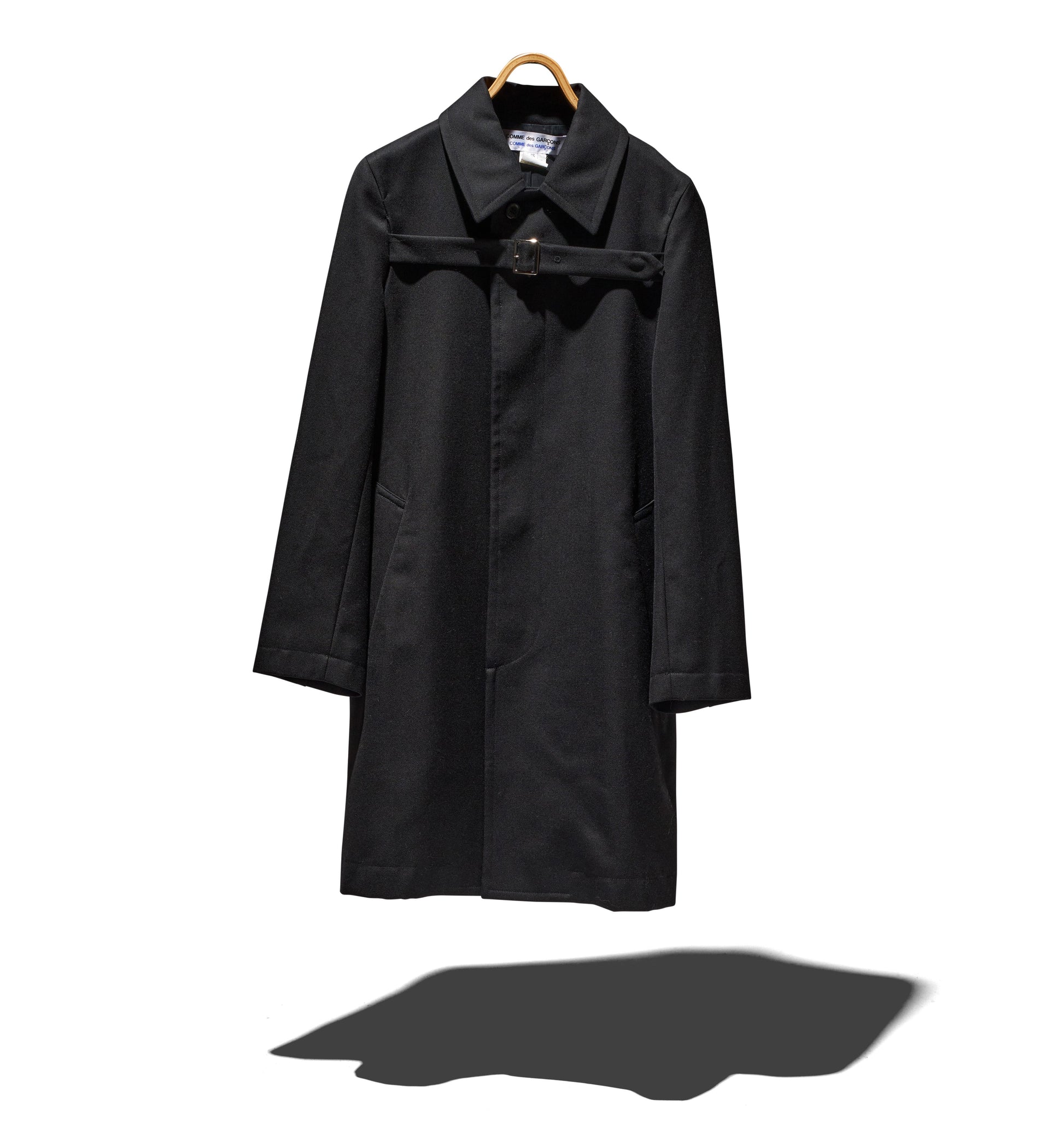 A simple yet striking detail, with the body cinched by a belt, embodies the rebellious spirit of Comme des Garçons. Despite its minimalist design, this piece conveys the essence of men’s tailoring and Rei Kawakubo’s identity.