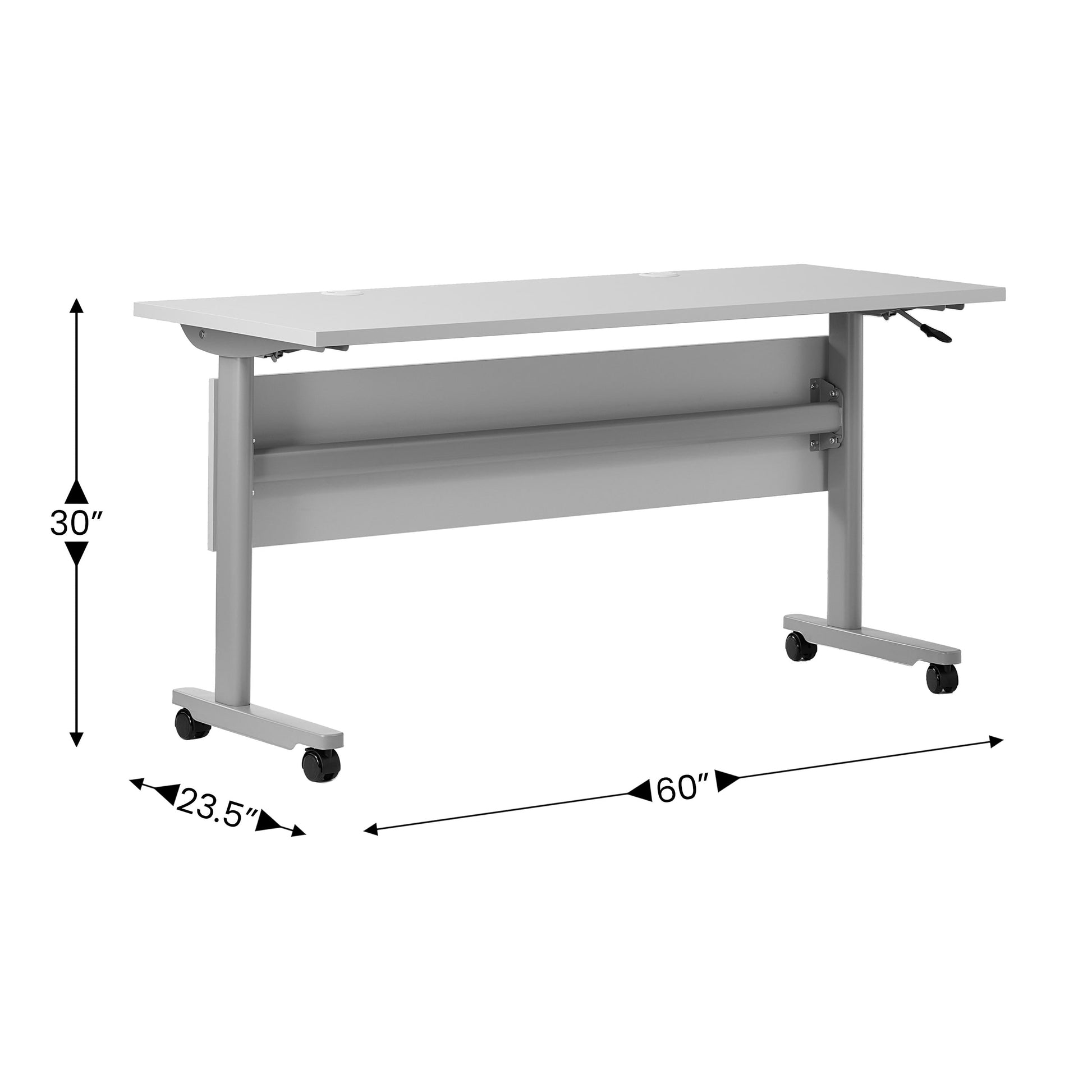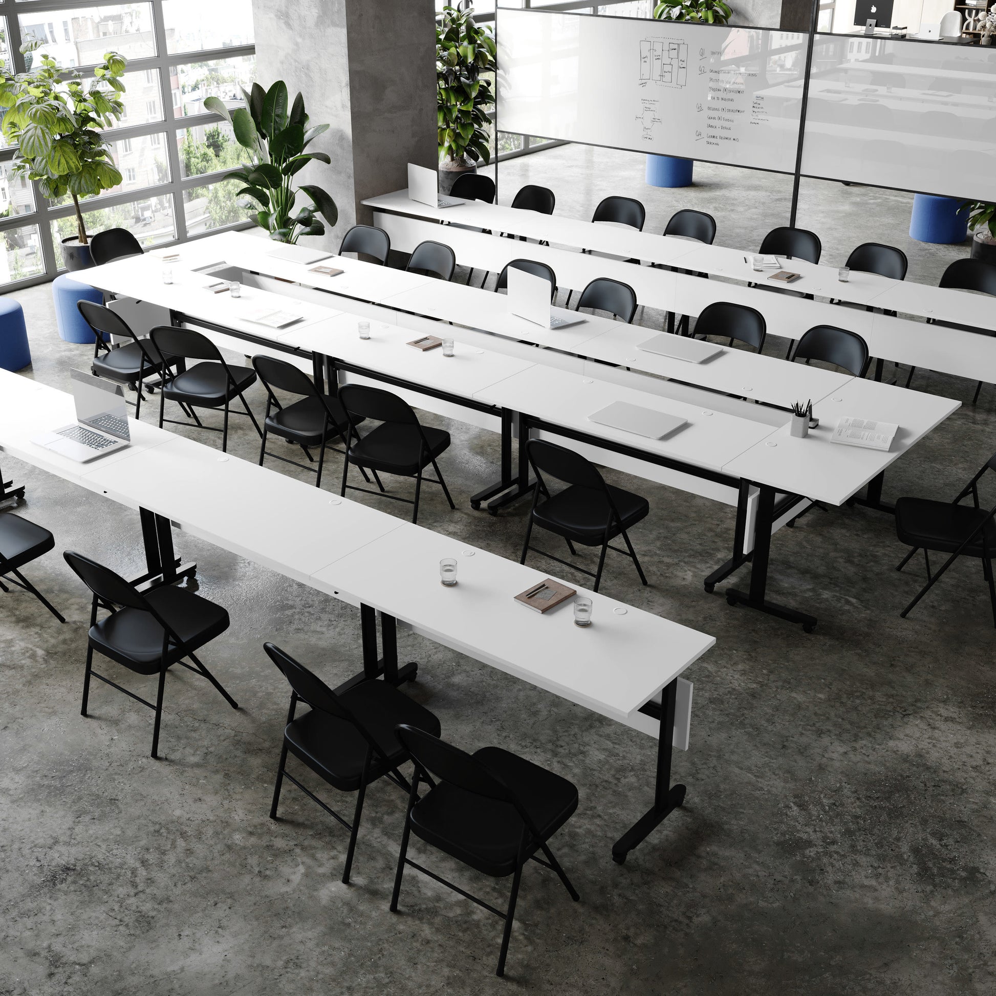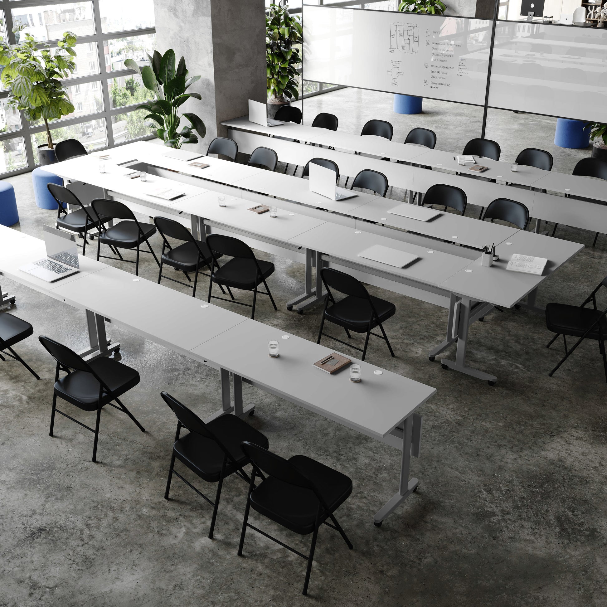 Utility and convenience combine with this heavy-duty flip training table that seats up to two adults. Graded for commercial use and featuring ample work space, this is a seamless addition to your offices, classrooms, libraries, computer labs, or home schooling spaces. And with cable management holes on the tabletop, it is easy to keep laptops, monitors, phones, and other work/school necessities plugged in and charged while eliminating clutter and disorganization on the desk. This table also features a privacy panel on the front under the tabletop. Moving your training table to the perfect spot in your space is hassle-free thanks to four rolling casters that sturdily lock in place. At the end of the day, enjoy an innovative nesting design that allows you to easily flip and fold the top for easy storage and exceptional space saving. For safety, the tabletop locks in place in the flipped-up position, but please make sure to carefully manage the top at all times when lowering or raising. This training table is built to last thanks to a sturdy steel frame that is engineered to hold up to 300 lbs. static weight. Assembly is quick and easy with included instructions and can be done in just 30 minutes. Maintenance is also quick and easy by cleaning this table with a dry cloth. Make the most of your space with this durable, spacious, and conveniently designed flip training table.