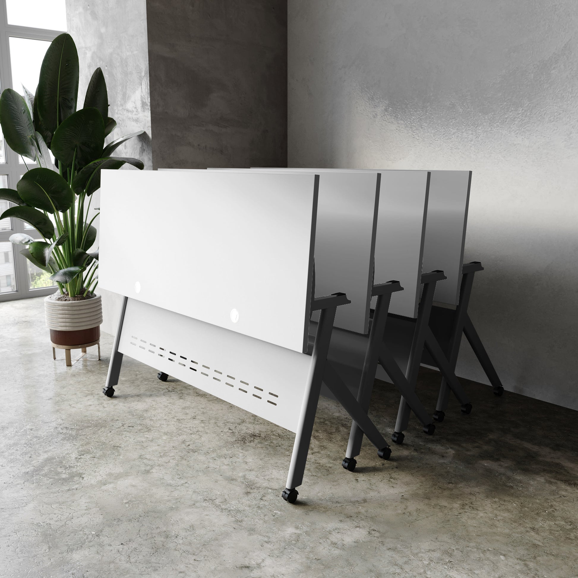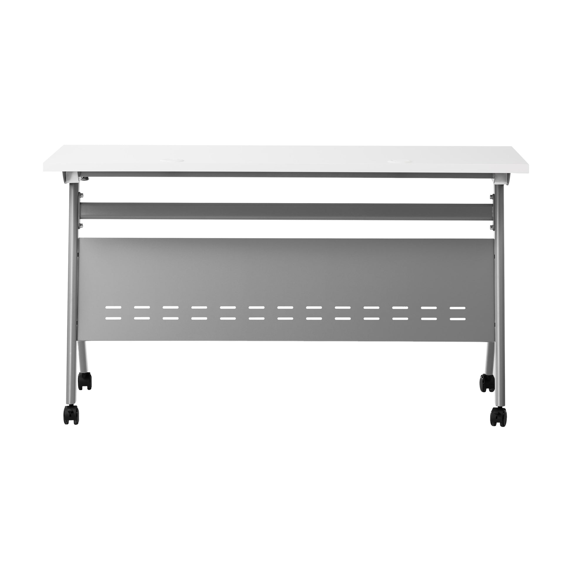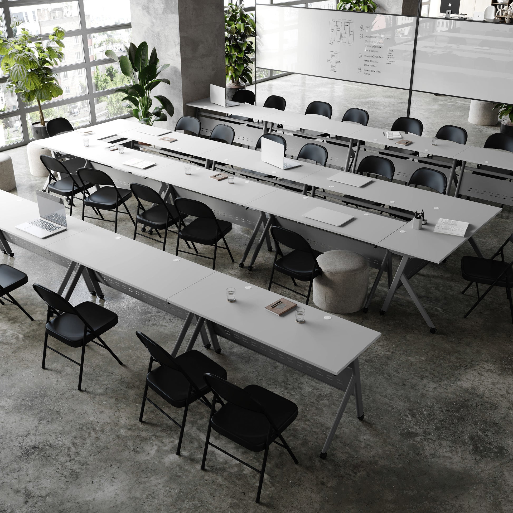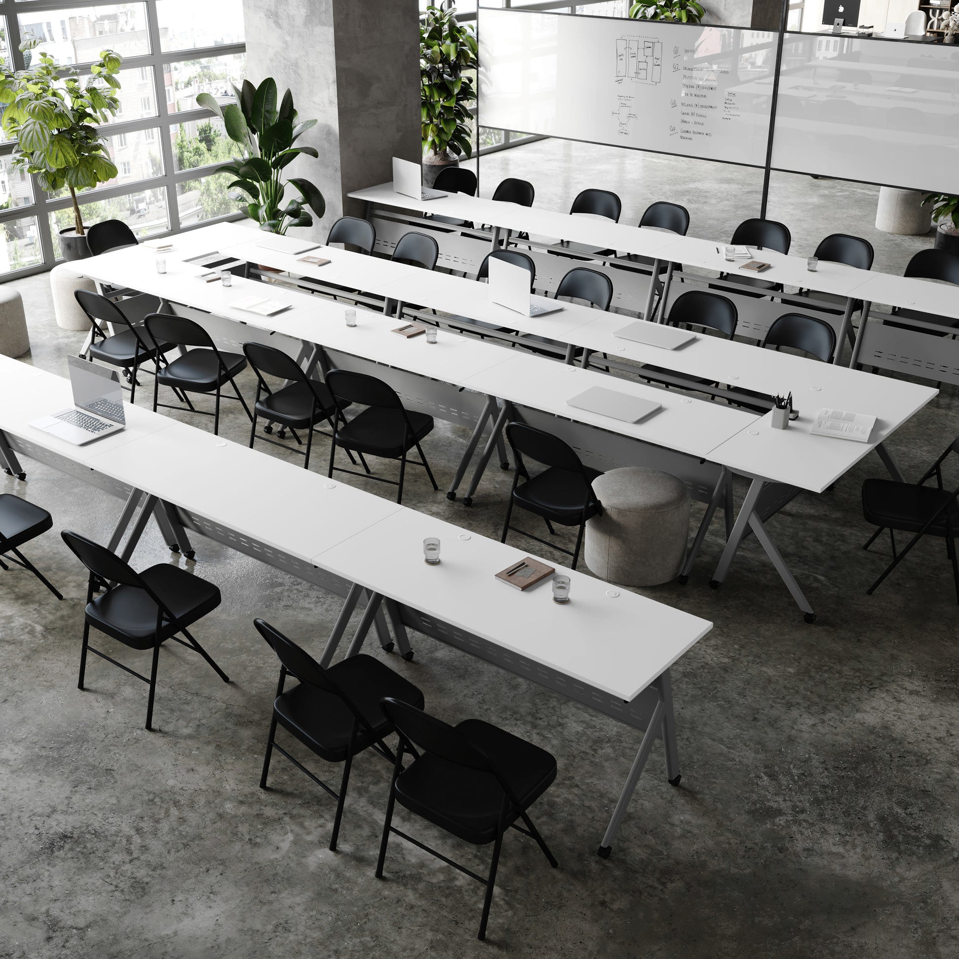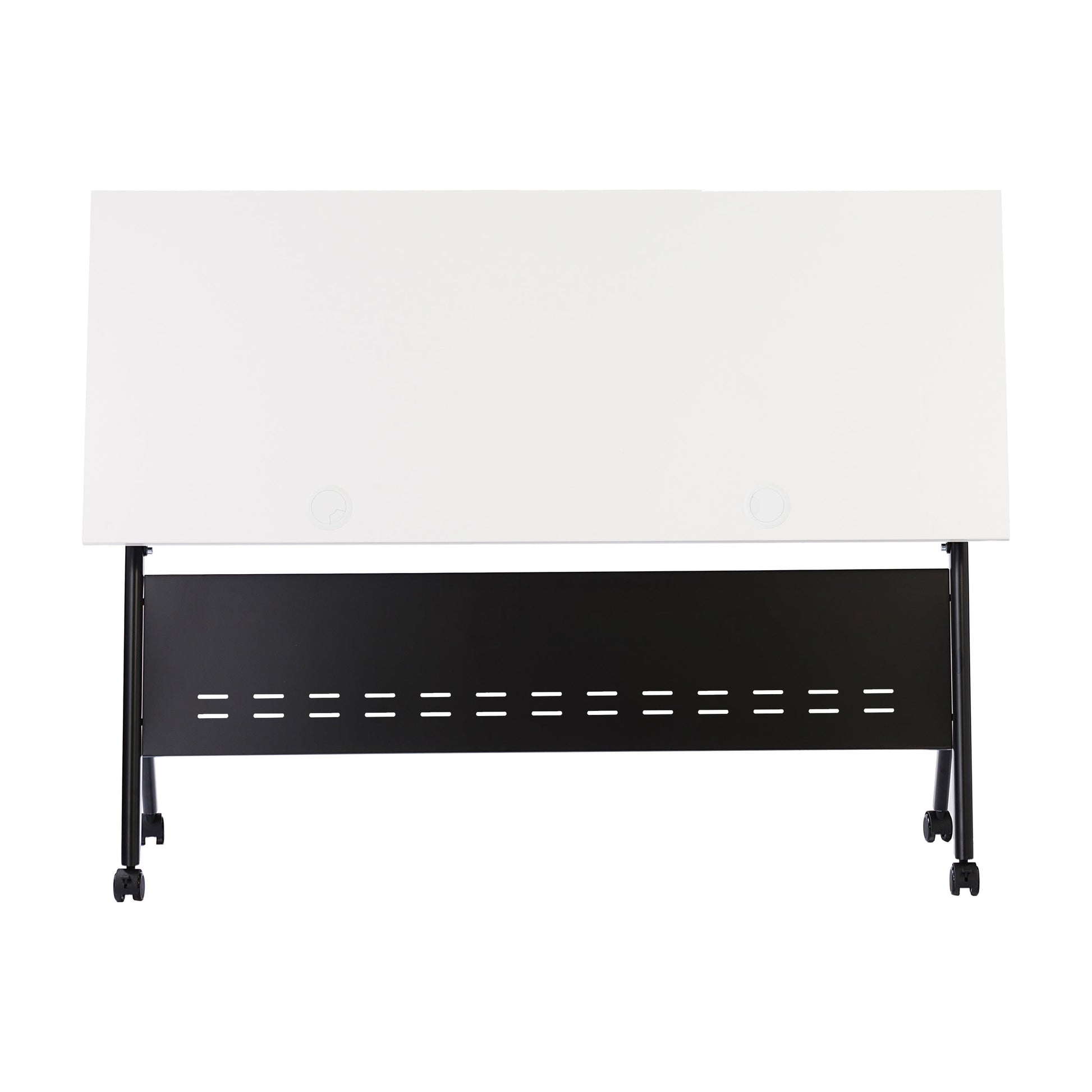 Utility and convenience combine with this heavy-duty flip training table that seats up to two adults. Graded for commercial use and featuring ample work space, this is a seamless addition to your offices, classrooms, libraries, computer labs, or home schooling spaces. And with cable management holes on the tabletop, it is easy to keep laptops, monitors, phones, and other work/school necessities plugged in and charged while eliminating clutter and disorganization on the desk. This table also features a privacy panel on the front under the tabletop. Moving your training table to the perfect spot in your space is hassle-free thanks to four rolling casters that sturdily lock in place. At the end of the day, enjoy an innovative nesting design that allows you to easily flip and fold the top for easy storage and exceptional space saving. For safety, the tabletop locks in place in the flipped-up position, but please make sure to carefully manage the top at all times when lowering or raising. This training table is built to last thanks to a sturdy steel frame that is engineered to hold up to 300 lbs. static weight. Assembly is quick and easy with included instructions and can be done in just 30 minutes. Maintenance is also quick and easy by cleaning this table with a dry cloth. Make the most of your space with this durable, spacious, and conveniently designed flip training table.