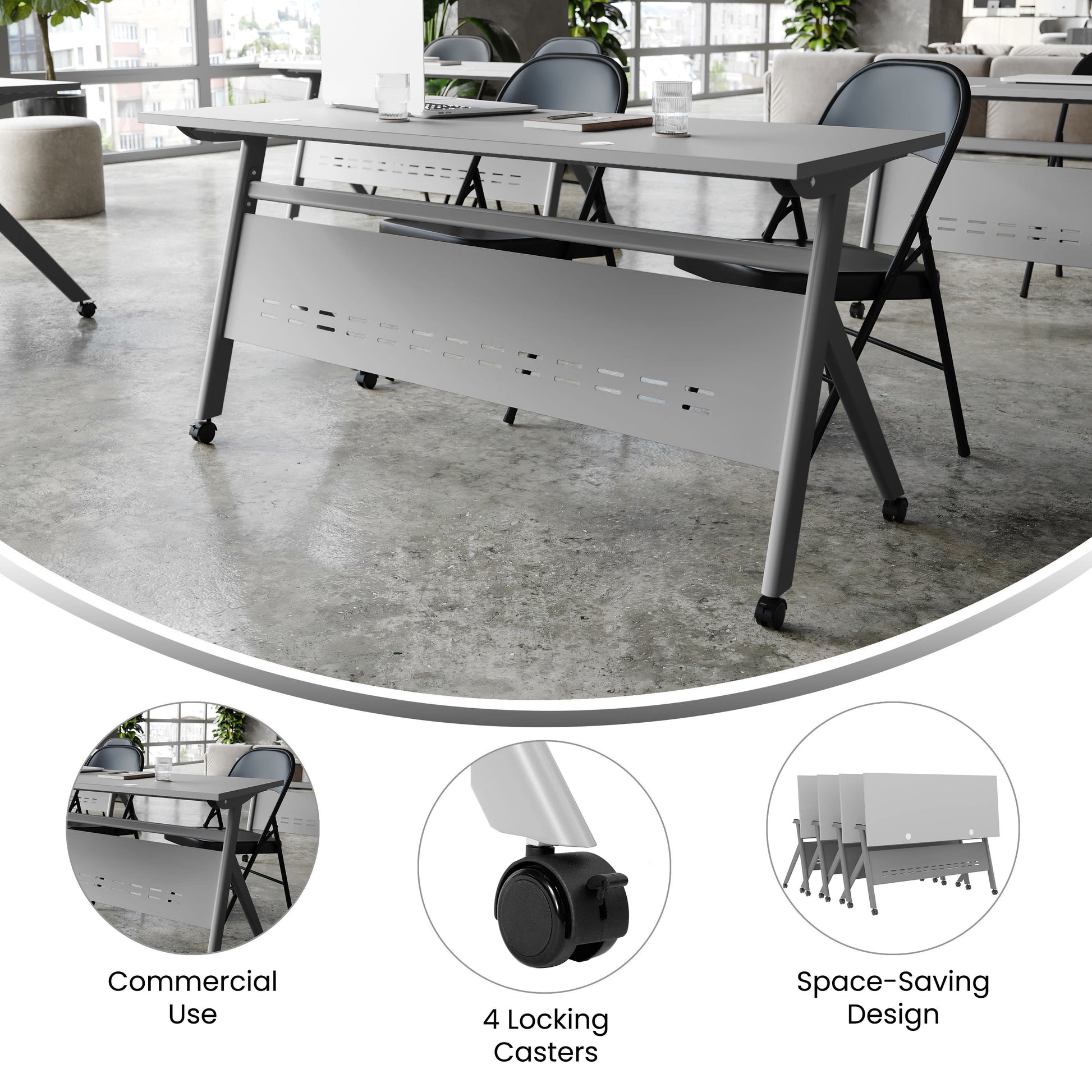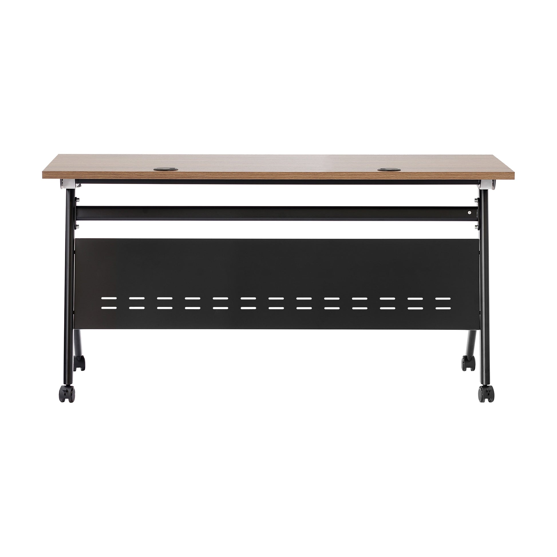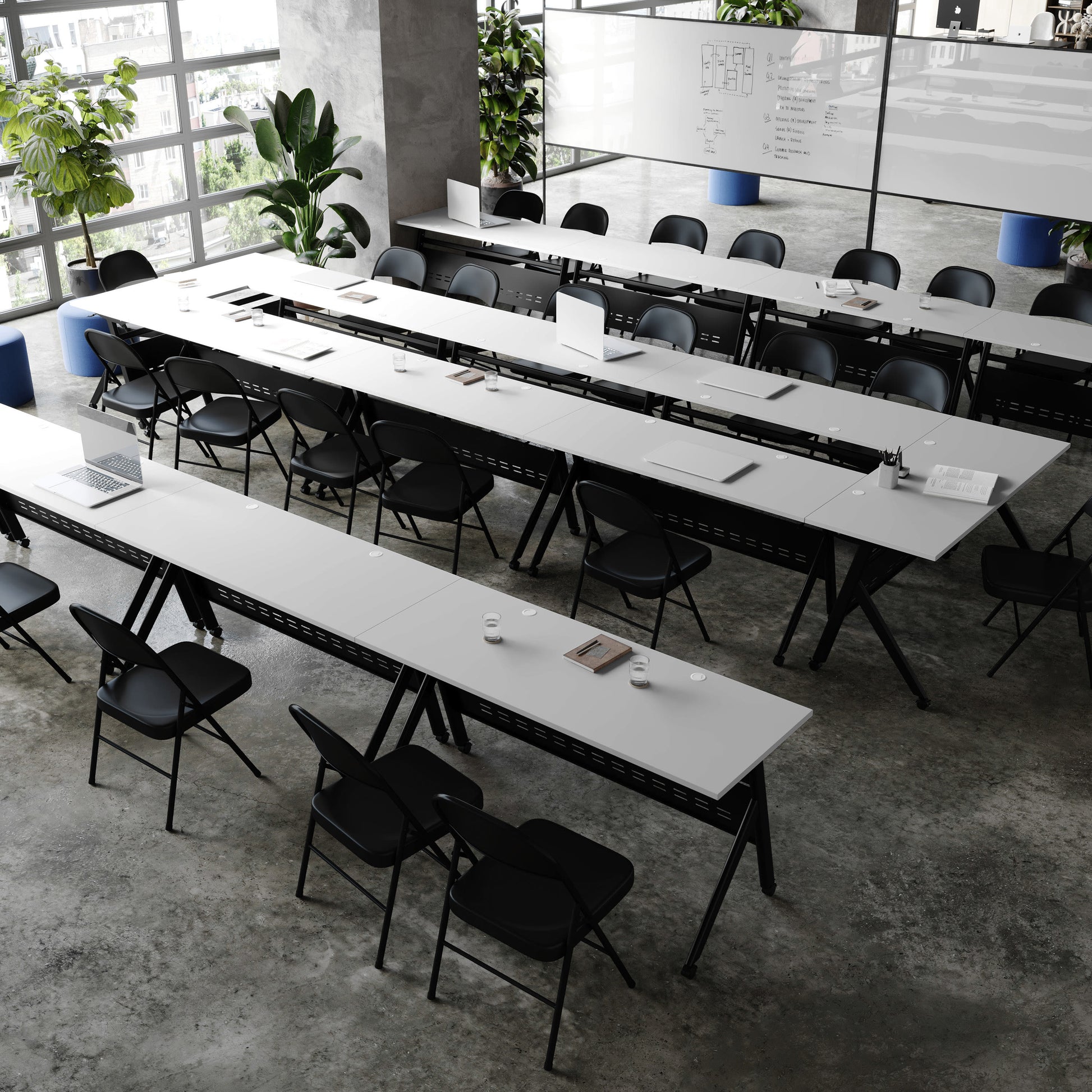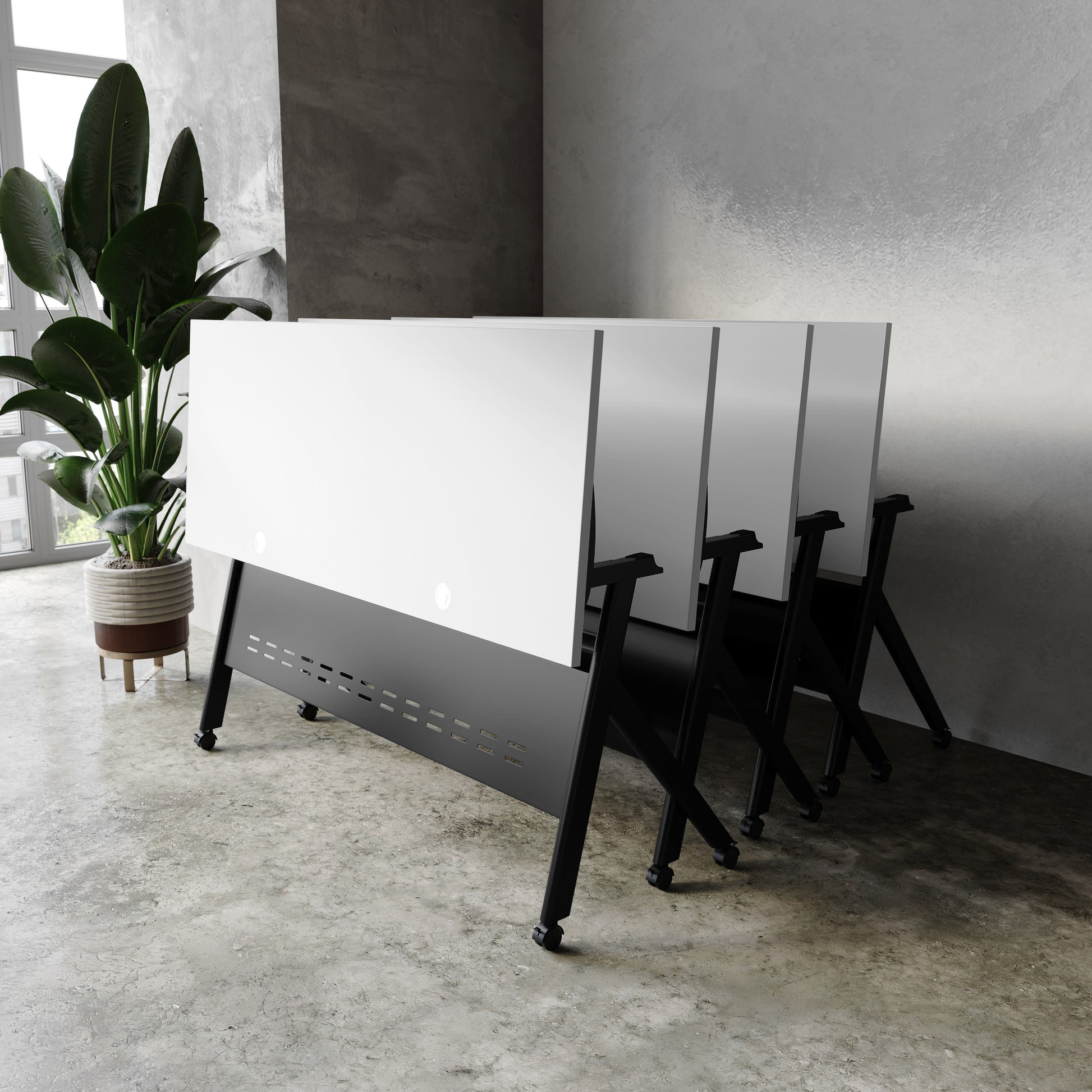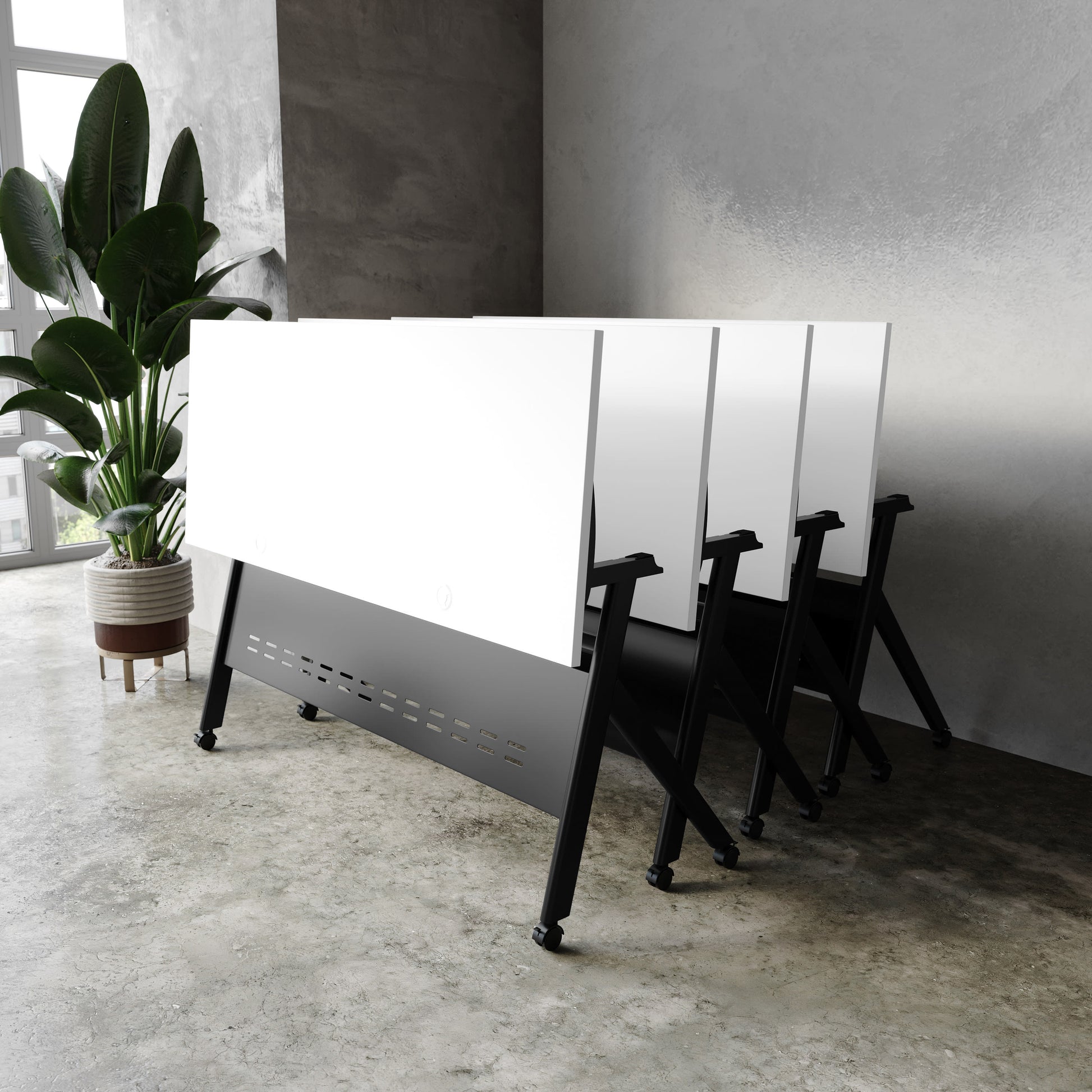 Utility and convenience combine with this heavy-duty flip training table that seats up to two adults. Graded for commercial use and featuring ample work space, this is a seamless addition to your offices, classrooms, libraries, computer labs, or home schooling spaces. And with cable management holes on the tabletop, it is easy to keep laptops, monitors, phones, and other work/school necessities plugged in and charged while eliminating clutter and disorganization on the desk. This table also features a privacy panel on the front under the tabletop. Moving your training table to the perfect spot in your space is hassle-free thanks to four rolling casters that sturdily lock in place. At the end of the day, enjoy an innovative nesting design that allows you to easily flip and fold the top for easy storage and exceptional space saving. For safety, the tabletop locks in place in the flipped-up position, but please make sure to carefully manage the top at all times when lowering or raising. This training table is built to last thanks to a sturdy steel frame that is engineered to hold up to 300 lbs. static weight. Assembly is quick and easy with included instructions and can be done in just 30 minutes. Maintenance is also quick and easy by cleaning this table with a dry cloth. Make the most of your space with this durable, spacious, and conveniently designed flip training table.