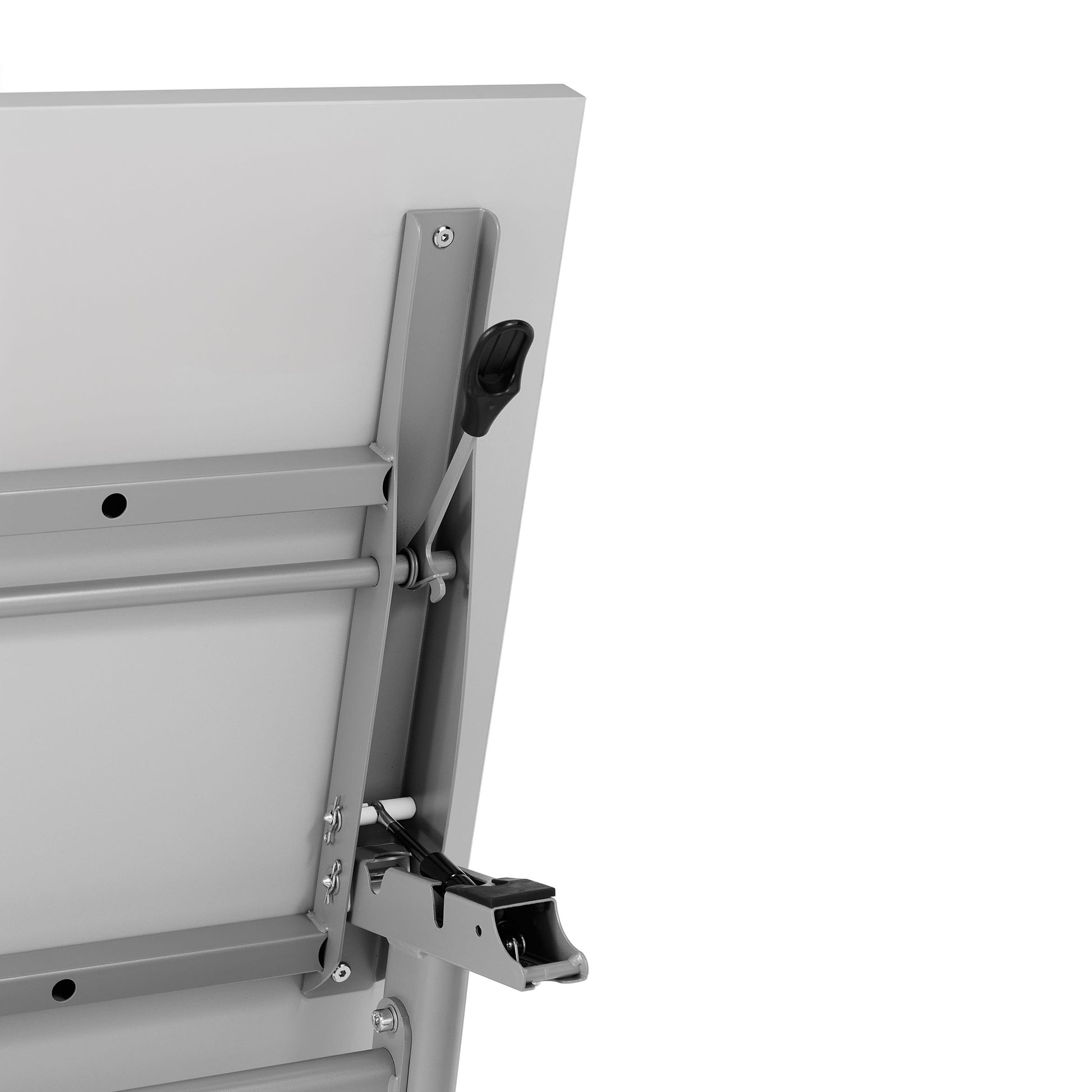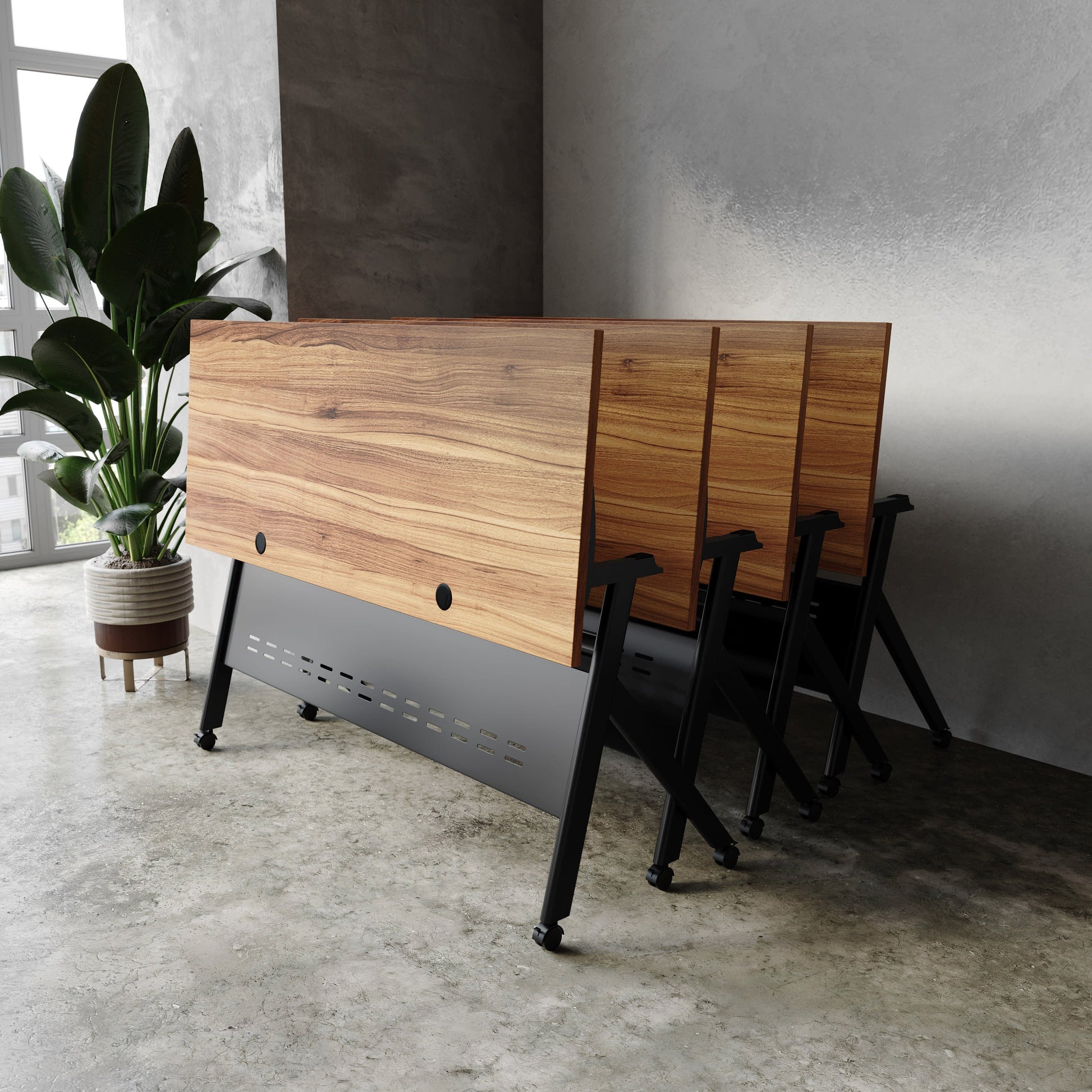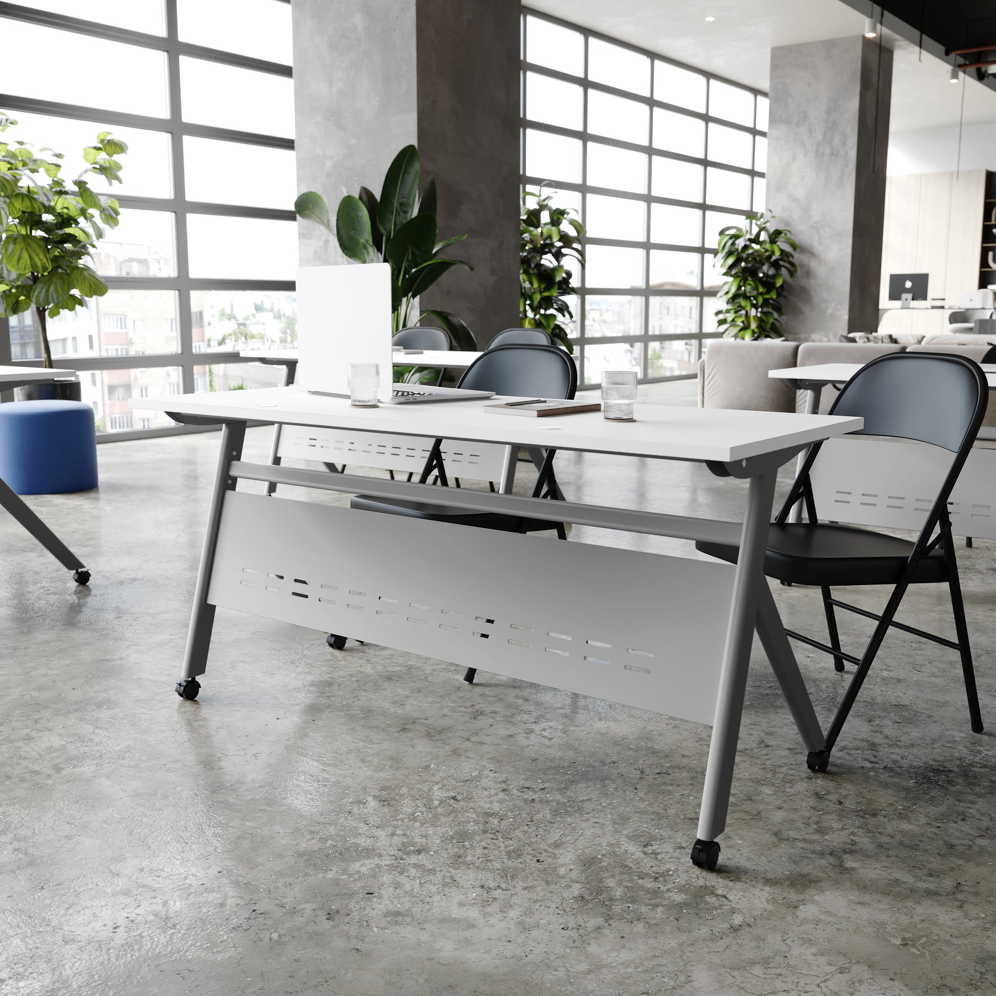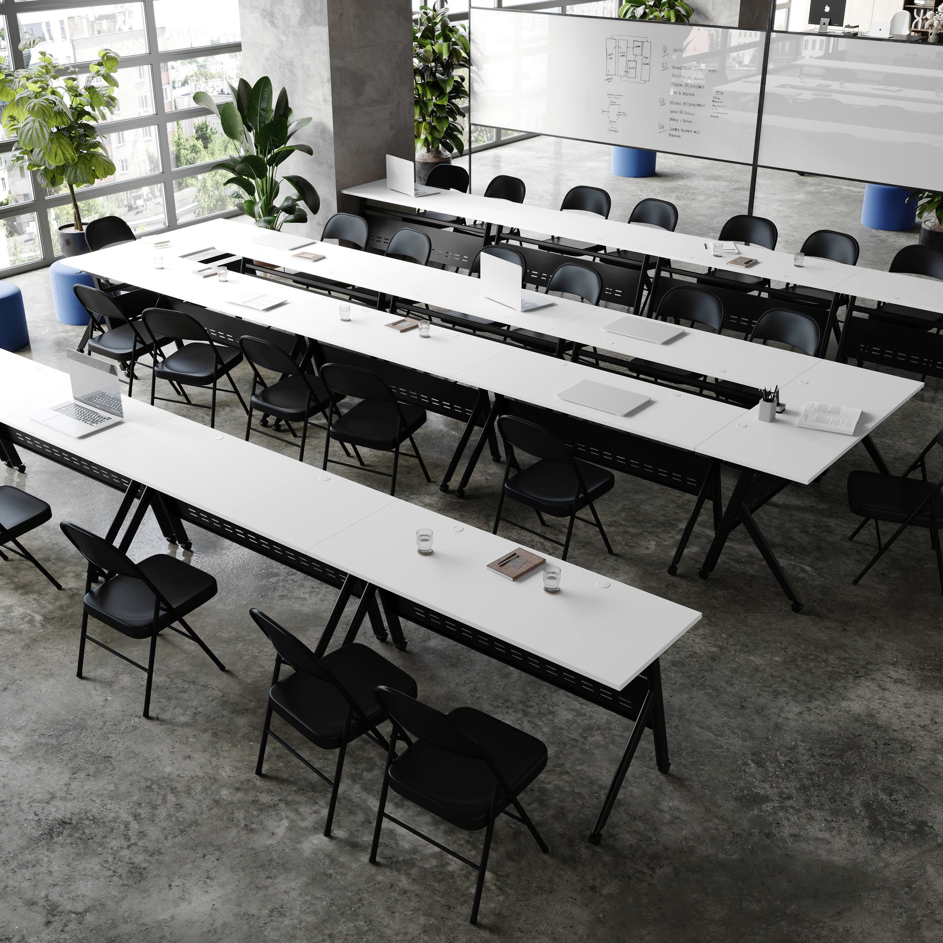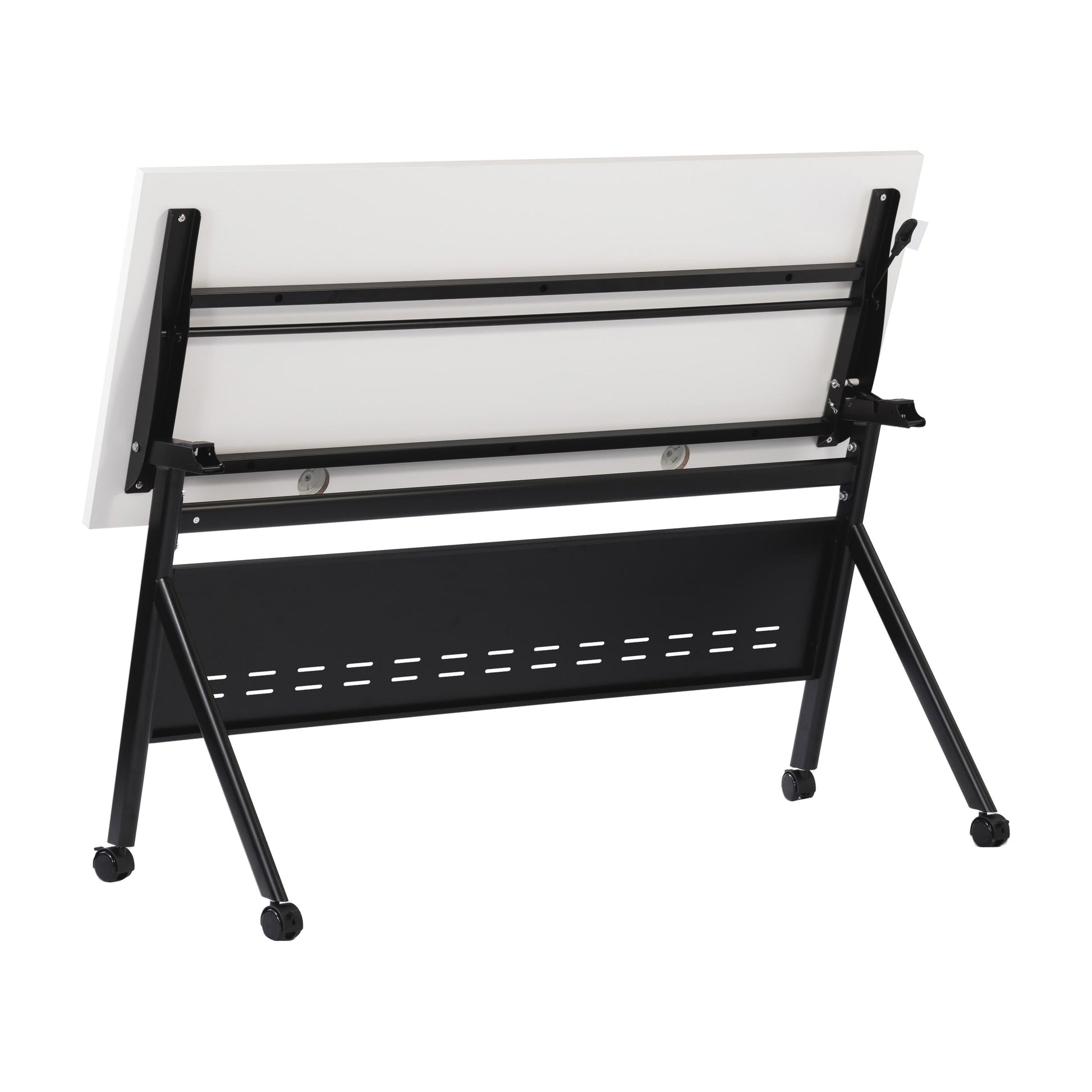 Utility and convenience combine with this heavy-duty flip training table that seats up to two adults. Graded for commercial use and featuring ample work space, this is a seamless addition to your offices, classrooms, libraries, computer labs, or home schooling spaces. And with cable management holes on the tabletop, it is easy to keep laptops, monitors, phones, and other work/school necessities plugged in and charged while eliminating clutter and disorganization on the desk. This table also features a privacy panel on the front under the tabletop. Moving your training table to the perfect spot in your space is hassle-free thanks to four rolling casters that sturdily lock in place. At the end of the day, enjoy an innovative nesting design that allows you to easily flip and fold the top for easy storage and exceptional space saving. For safety, the tabletop locks in place in the flipped-up position, but please make sure to carefully manage the top at all times when lowering or raising. This training table is built to last thanks to a sturdy steel frame that is engineered to hold up to 300 lbs. static weight. Assembly is quick and easy with included instructions and can be done in just 30 minutes. Maintenance is also quick and easy by cleaning this table with a dry cloth. Make the most of your space with this durable, spacious, and conveniently designed flip training table.