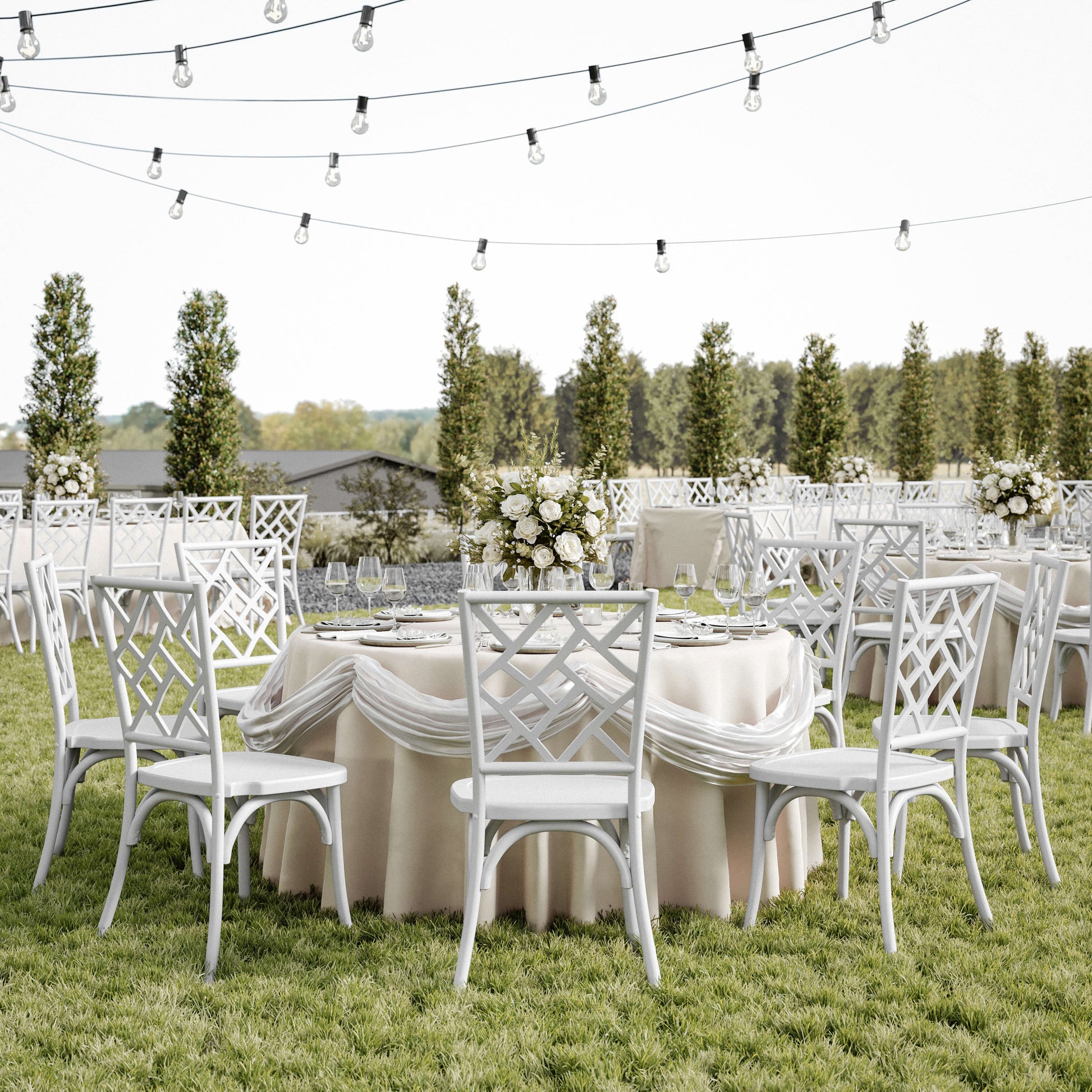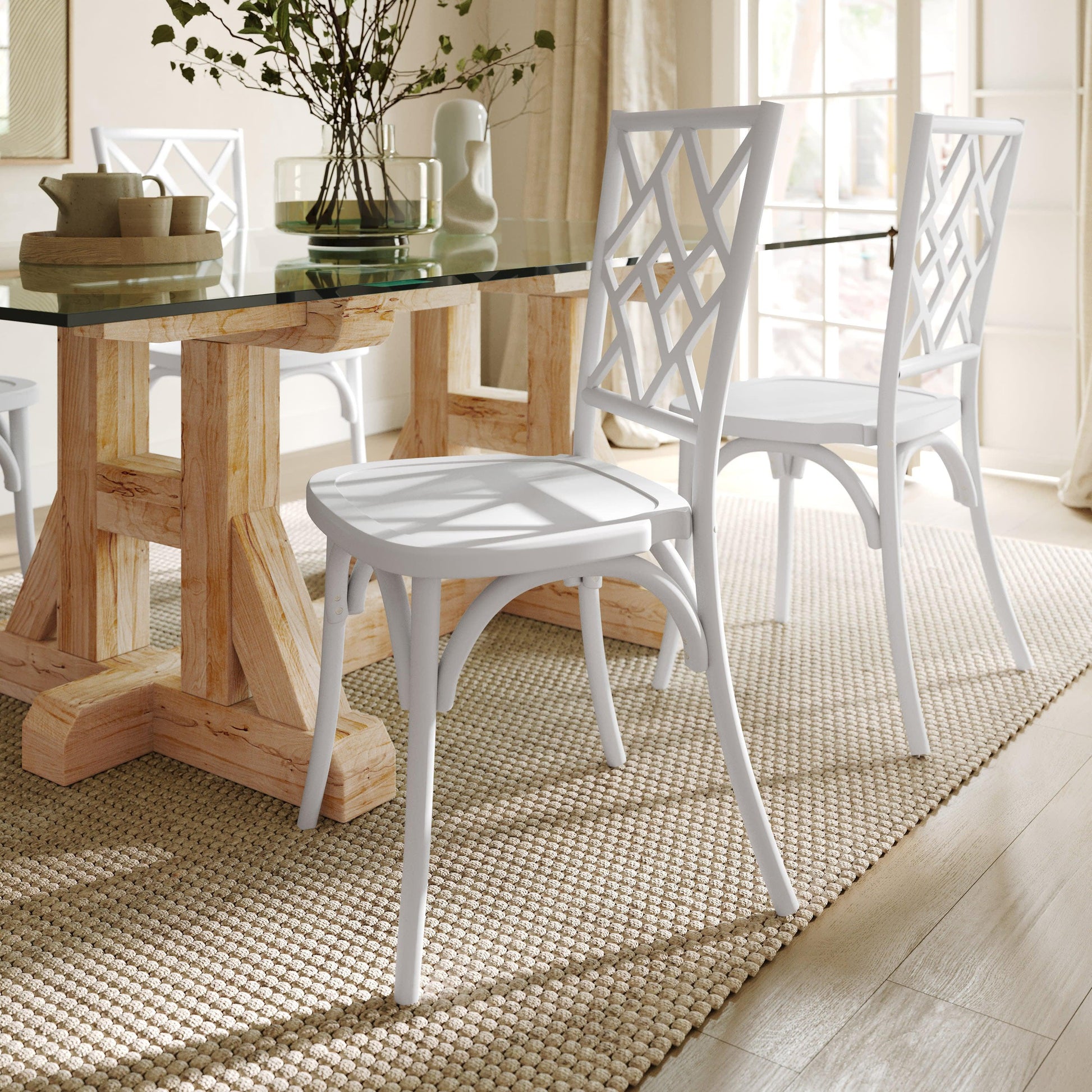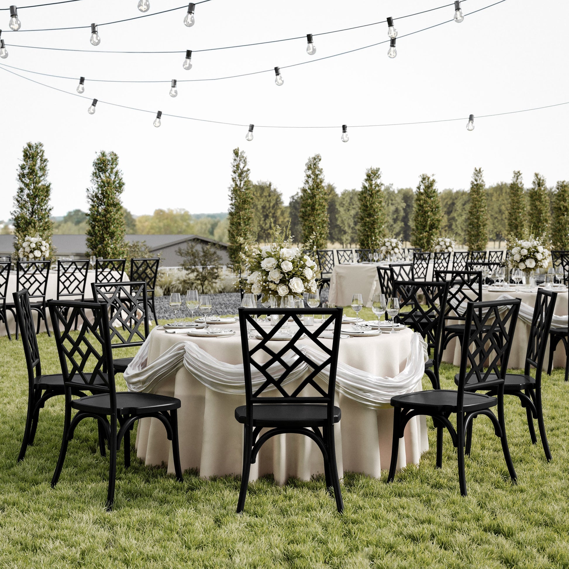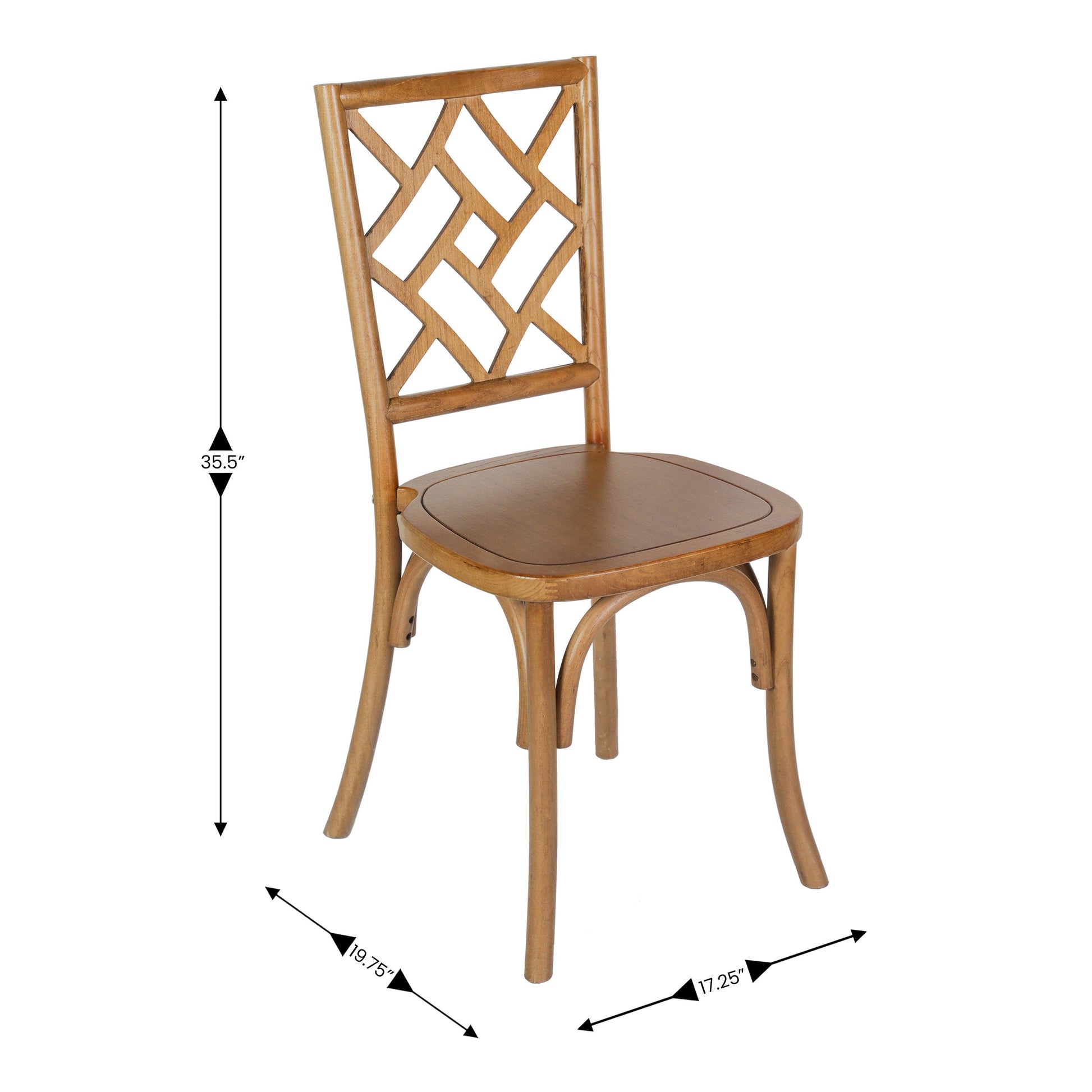 Strike a balance of style and stability in your space with this stackable solid wood dining chair, the perfect addition for a variety of spaces. While it makes for a seamless addition to your kitchen or dining room at home, this chair is commercial grade, meaning you can make a lasting impression on your customers and deliver an inviting presentation that will have them making return trips to your restaurant, bar, bistro, lounge, coffee shop, café, deli, or event space. This chair combines durability and elegance to enhance any environment. Its intricate back design adds a touch of sophistication to any space, making it suitable for formal gatherings and casual meals alike. The sturdy solid wood frame boasts a high static weight capacity of 350 lbs. to ensure it can accommodate a variety of users, providing both comfort and stability. Thanks to its mortise and tenon construction, you can expect long-lasting, reliable use from this chair. For business owners, a recommended stack quantity of up to six chairs high saves valuable storage space and reduces clutter when not in use. Plus, the fixed floor glides protect hard flooring from damage, making this chair ideal for any surface. Best of all, no assembly is required, so you can put this chair to use straight out of the box. Ensuring easy maintenance, the chair can be wiped clean with a damp cloth, so you can keep it looking pristine with minimal effort. Welcome your guests at home or at your business with the casual, rustic style of this stackable wood dining chair.