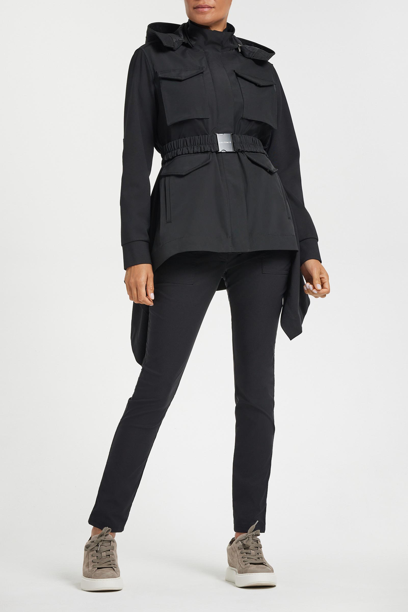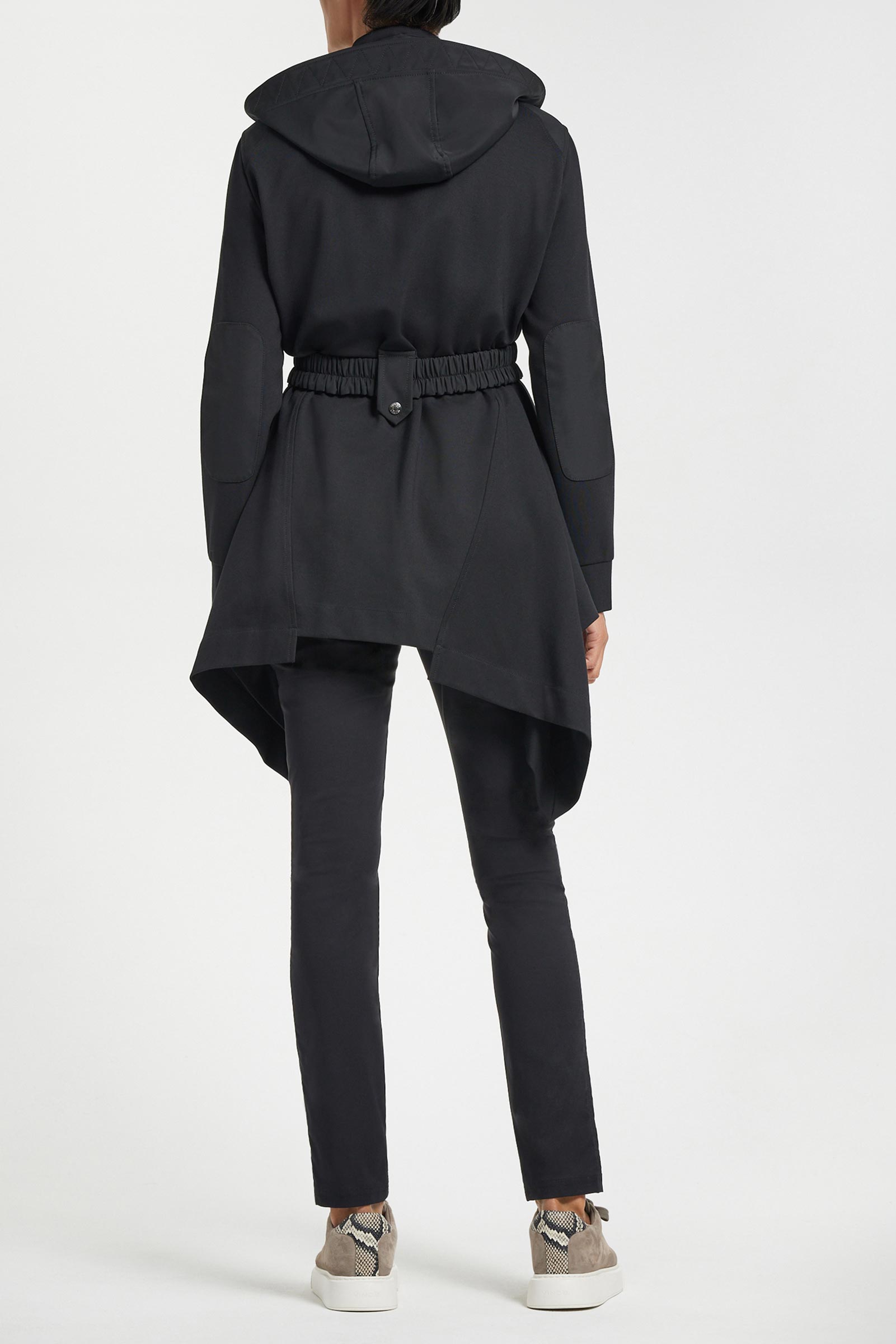 - Slightly extended length hits just below the waist