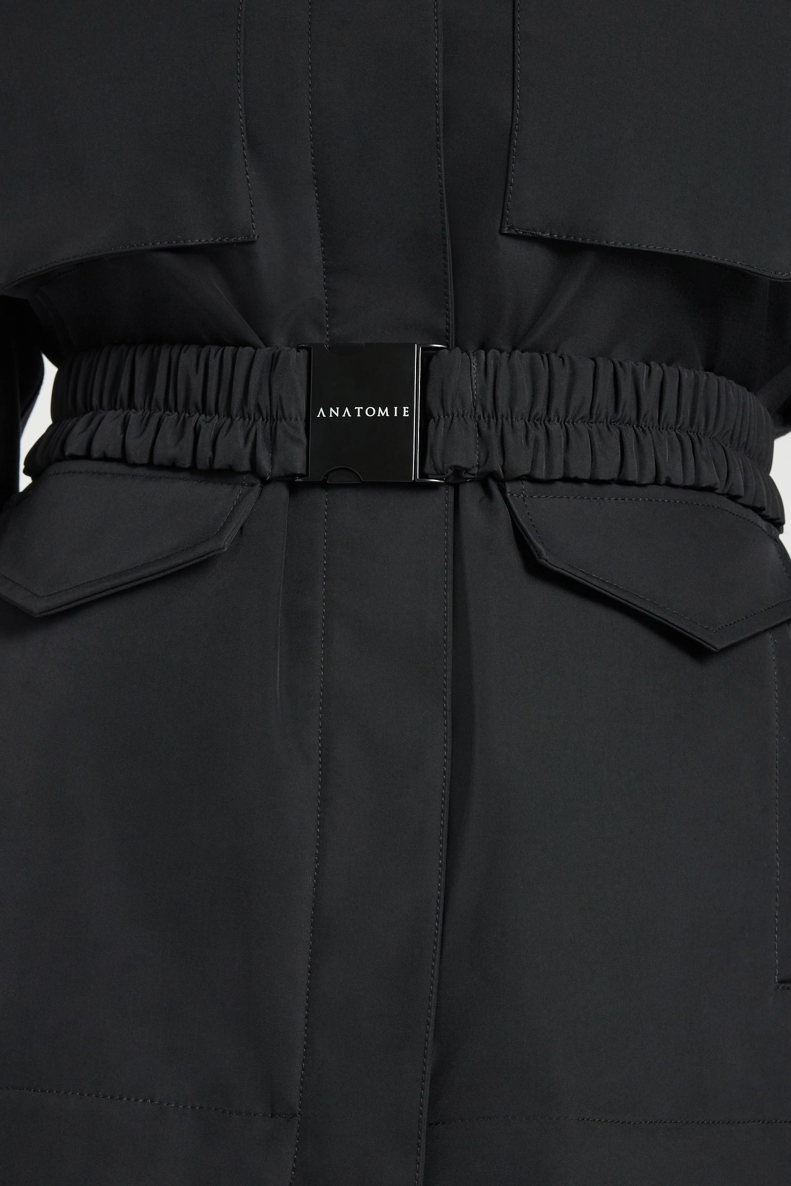 - Two-way zip-front closure with snap button overlay
