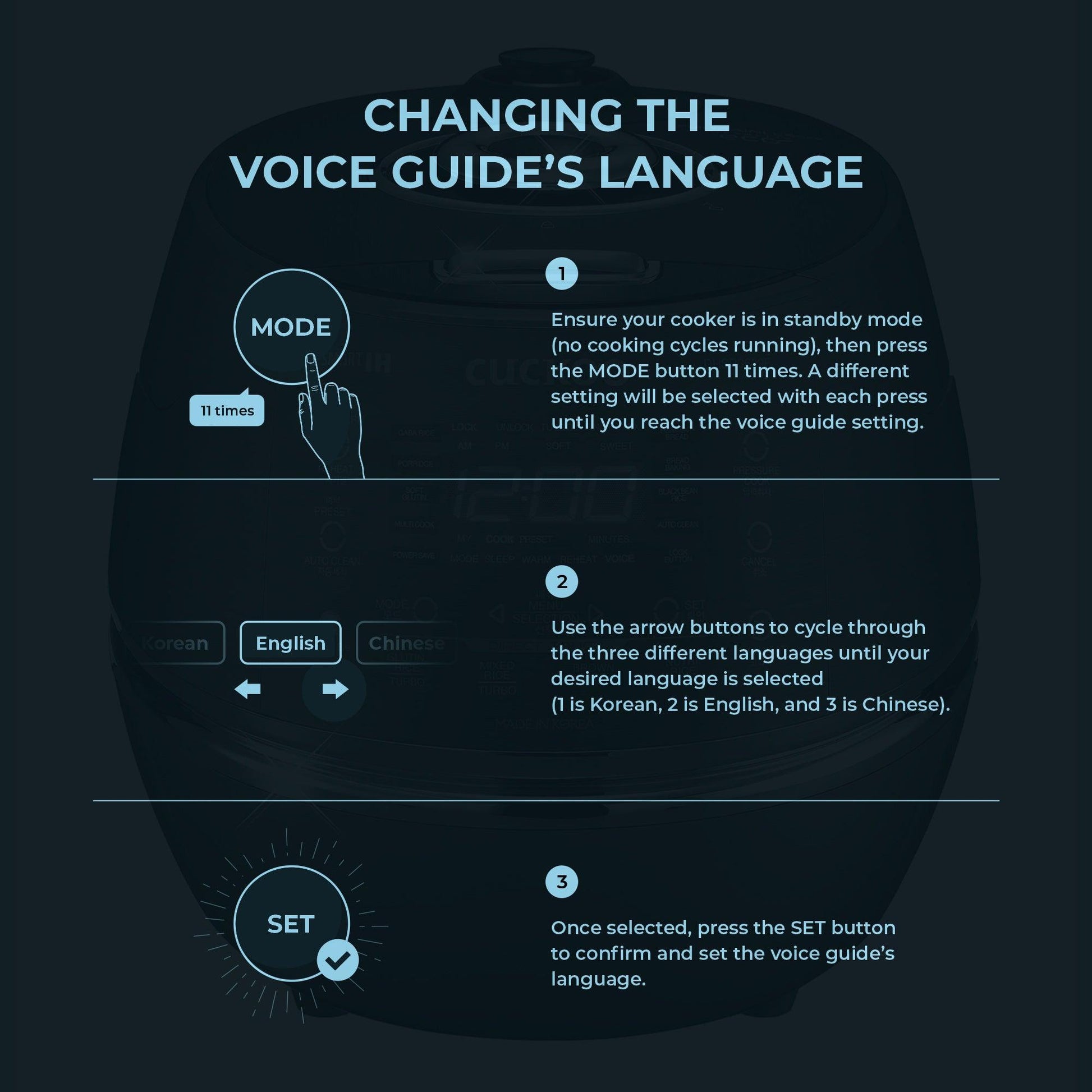 - VOICE GUIDE: Complete with voice navigation in 3 different languages (English, Chinese, and Korean), this cooker will act as your personal kitchen assistant as it cooks, and you relax