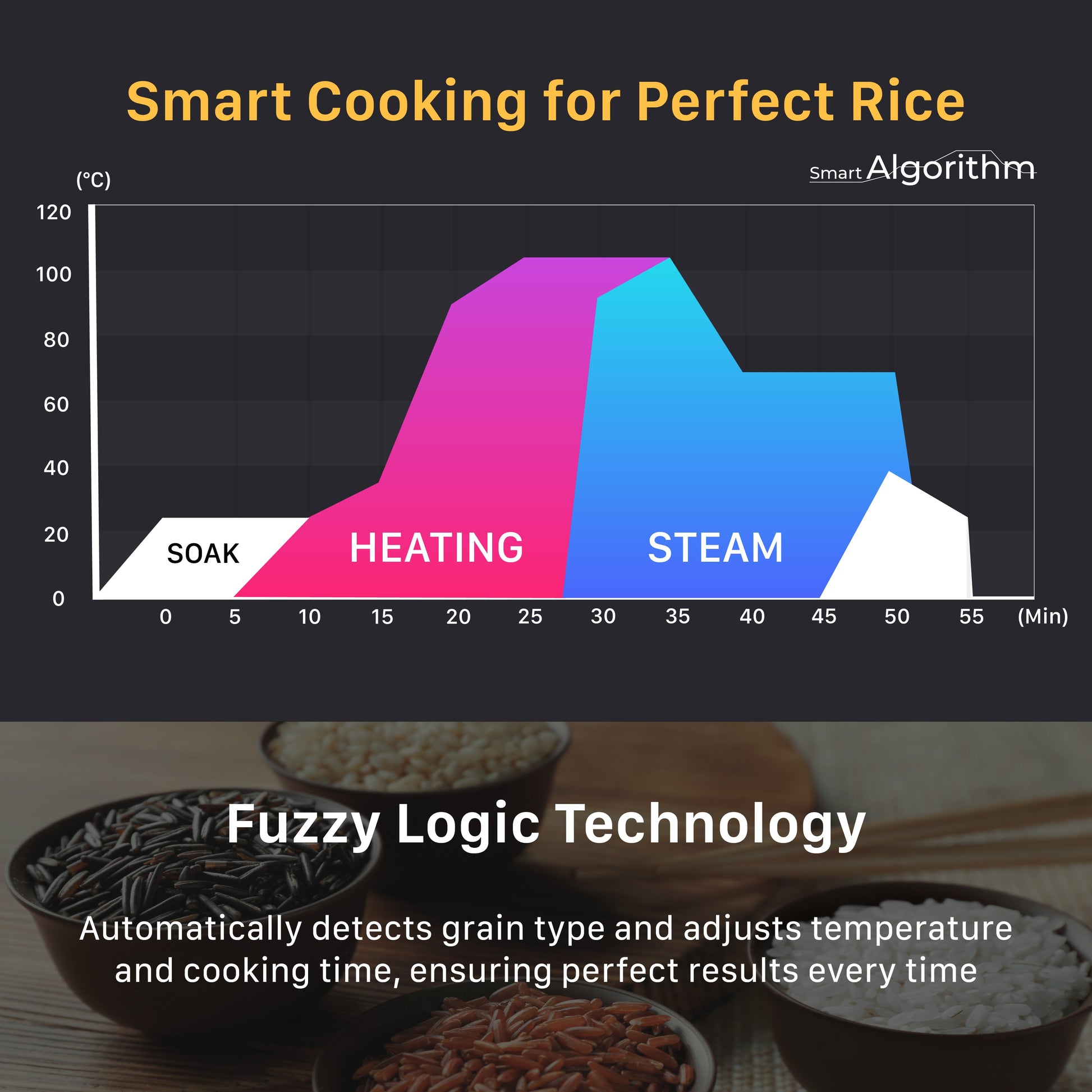 - EFFICIENT & SMART: Features an LED screen complete with simple touch controls and Fuzzy Logic technology the cooker will automatically detect and adjust its temperature and pressure accordingly for perfectly cooked rice, every time