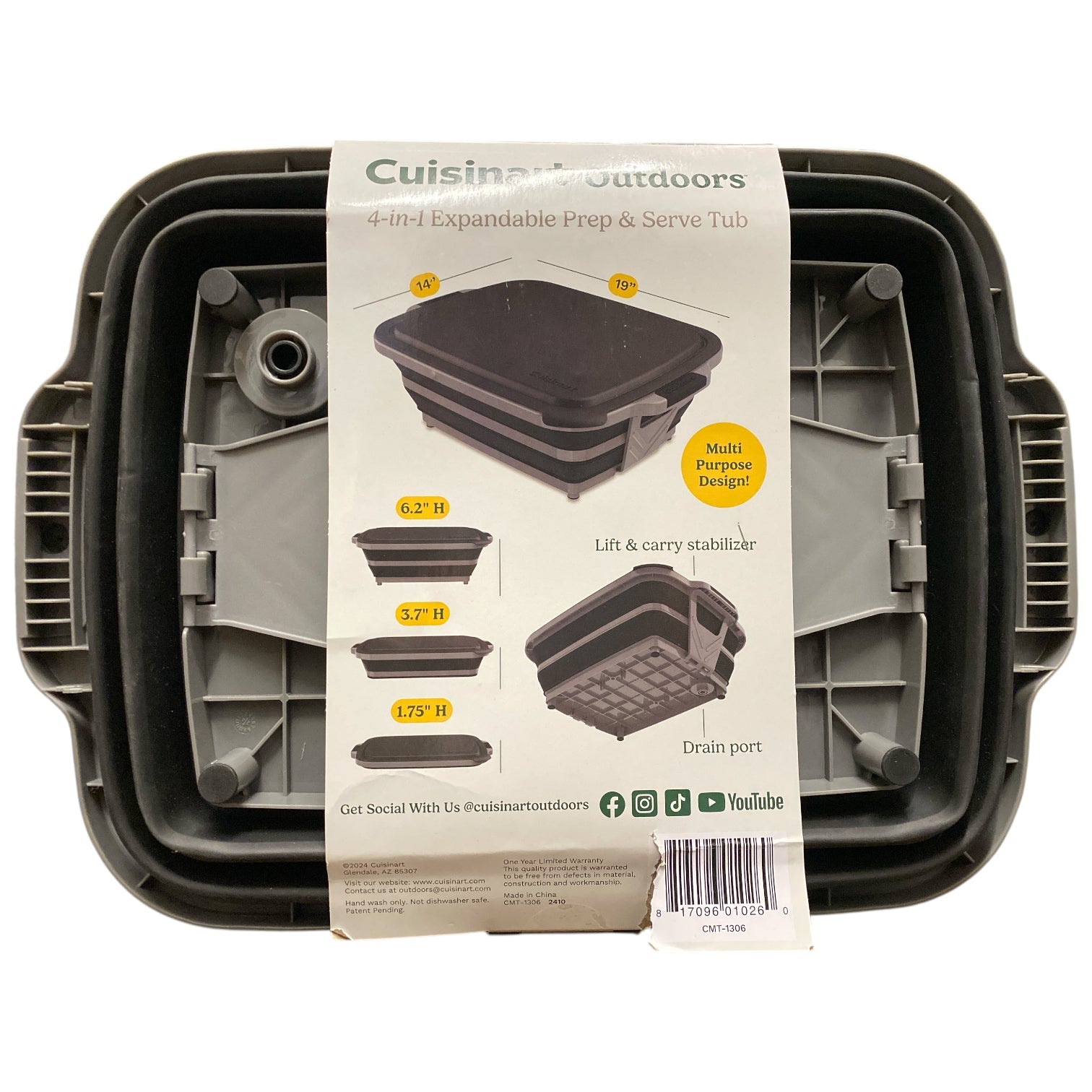 Cuisinart 4-in-1 Expandable Prep & Serve Tub: Versatility at Its Best The Cuisinart 4-in-1 Expandable Prep & Serve Tub is a versatile kitchen tool designed to accommodate your meal preparation needs. Whether you're marinating large cuts of meat or seasoning vegetables, this multi-purpose container has got you covered. It can comfortably hold up to a 12-lb bone-in pork shoulder or ham, a 9-lb standing rib roast, two 6-lb chickens, or a 12-lb chicken minus wings and legs. Simply place your ingredients in the container, add your preferred marinade or seasoning, and close the lid. Easy to Use and Transport This prep & serve tub features Patent-Pending Lift & Carry Stabilizers, making it easy to move even when filled with heavy loads. When collapsed to the middle, it's perfect for marinating smaller items like skewers, shrimp, steak tips, chicken breasts, and thighs, or veggies. The tub measures 19" x 14" x 6" when extended, ensuring it fits comfortably in your refrigerator. Durable and Convenient Design Constructed from durable plastic and silicone, this container is designed to last. It comes with a snug-fit dual-purpose lid that not only covers the tub but also flips over to serve as a serving tray. When not in use, simply collapse it down for space-saving storage. It stands at a height of 1.4" when collapsed, making it easy to store. Additional Features The Cuisinart 4-in-1 Expandable Prep & Serve Tub has a capacity of 3 gallons when fully extended to 6". It's not just for food preparation; you can also use it as a drink chiller for refreshments. It includes a handy drain port feature for added convenience. Make your next barbecue preparation a breeze with this practical and versatile kitchen tool. 4-in-1 Multi-Purpose with Compact Storage Patent-Pending Lift & Carry Stabilizers can be deployed for moving heavy loads Great for marinating, seasoning, and brining Durable plastic & silicone container with a snug-fit dual-purpose lid Removable Drain Port