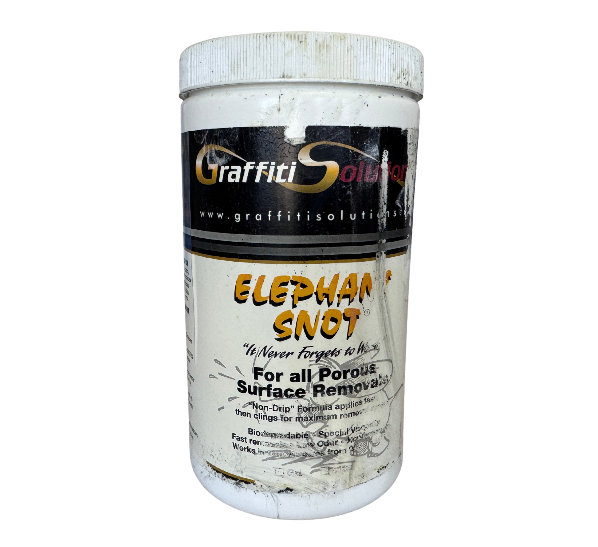 It is the workhorse for the most difficult of porous surface removal requirements - ELEPHANT SNOT penetrates deeply into concrete, cement, brick, grout, stone, virtually anything porous to dissolve and loosen all types of tags, and in many circumstances, simple water hose pressure will do the job.