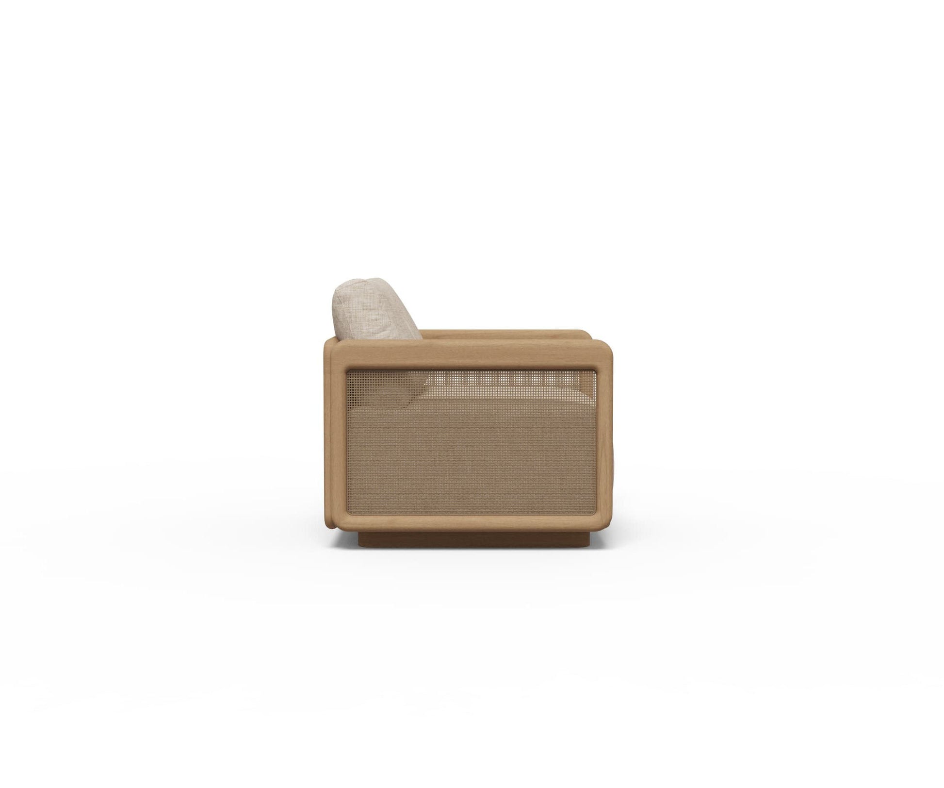 Designed by Claudio Bellini, the Dock Lounge Chair features distinctive woven panels set within a sturdy teak wood frame, creating a striking contrast that adds warmth and sophistication to any outdoor setting. Its innovative design combines elegance with durability, making it an ideal choice for luxurious, lasting outdoor relaxation.